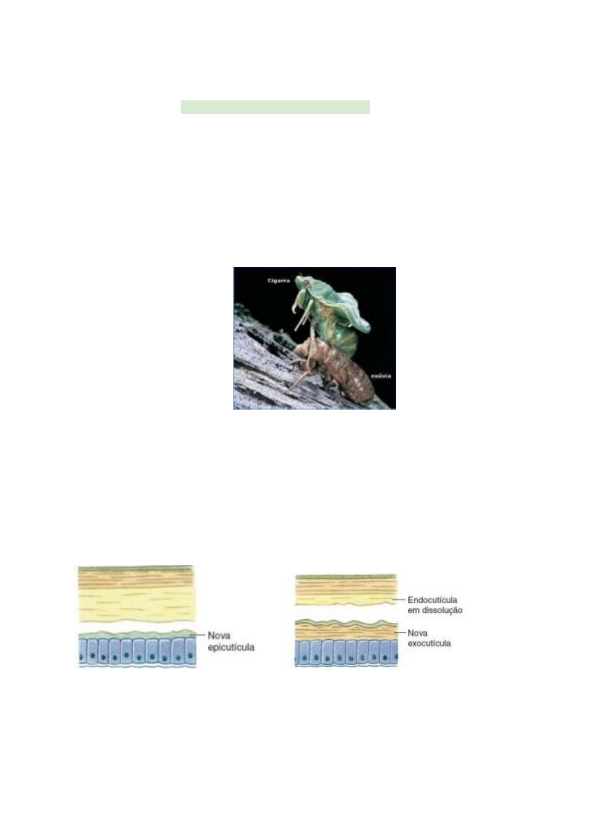 Zoologia 3 Ciências de Biológicas-Bacharelado Atividade 5 - Muda (ecdise) Arthropoda Os artrópodes possuem um esqueleto externo, denominado exoesqueleto, que é rígido e reveste todo corpo do animal. Esse exoesqueleto garante um maior proteção, porém impede o crescimento, por isso os artrópodes desenvolveram um processo denominado muda(ecdise), no qual periodicamente o exoesqueleto é eliminado para que seu corpo possa se desenvolver, o qual pode ocorrer várias vezes até que se chegue a fase a adulta. Esse processo é controlado pelo sistema endócrino por intermédio da ação do hormônio ecdisona. FASES DA ECDISE Fase 1) estágio pré-muda, a procutícula ( parte interna do exoesqueleto) velha separa-se da epiderme, secretando enzimas que digerem parte dessa procutícula, ao mesmo tempo que secreta uma nova epicutícula ( parte mais externa, uma camada proteica muito fina impregnada de lipídios). Ainda no estágio pré-muda, uma nova exocutícula ( fica abaixo da epicutícula, contém proteína, sais de cálcio, e quitina) é secretada enquanto um fluido dissolve a endocutícula( fica entre a epiderme e a exocutícula, contém quitina e proteína) velha. ⇨ Fase 2) na ecdise, já se tem um nova epicutícula e exocutícula, e as antigas são descartadas. Fase 3) na pós-ecdise, uma nova cutícula é estendida e uma endocutícula é secretada. O novo exoesqueleto permanece mole por um período, enquanto isso ocorre o animal expande seu corpo pelo bombeamento de água ou ar, e que após o endurecimento do exoesqueleto essa água ou ar é substituído pelo crescimento dos tecidos. Fase 4) intermuda, período entre as mudas, em que o animal faz reservas alimentares, em seus tecidos, preparando-se para a próxima muda. FISIOLOGIA DA ECDISE O ciclo é iniciado com frequência por estímulo ambiental percebido pelo sistema nervoso central, células neurossecretoras sintetizam e secretam o hormônio ecdisona e produzem um decréscimo na produção do hormônio inibidor de muda, assim inicia o ciclo da troca do exoesqueleto. REFERÊNCIA BIBLIOGRÁFICA HICKMAN Jr., C. P.; L. S. ROBERTS & A. LARSON. 2016. Princípios integrados de Zoologia. Editora Guanabara Koogan. Helivania Sardinha dos Santos. Muda ou ecdise.Site-Biologia Net.Disponível em: < https://www.biologianet.com/anatomia-fisiologia-animal/muda-ou-ecdise.htm> acessado 02/11/2020