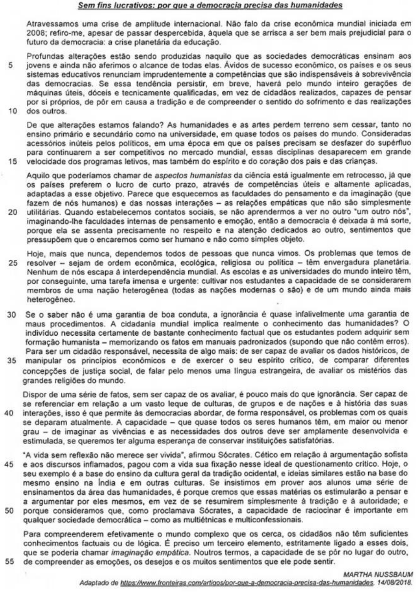 QUESTÕES INTERPRETAÇÃO TEXTO 1. 2. Ao longo do texto, ao defender seu ponto de vista central sobre o tema que debate, a autora põe em confronto duas idéias, que podem ser representadas pelas seguintes palavras do texto: A sobrevivência (linha 6) - cidadãos (linha 8). B empáticas (linha 19) - utilitárias (linha 20). C ignorância (linha 30) - humanidades (linha 31). D questionamento (linha 45) - tradição (linha 46). 3. OS SHORTINHOS E A FALTA DE DIÁLOGO Li na coluna de Monica Bergamo na Folha da última sexta-feira (5) a reportagem "A crise dos shortinhos no colégio Rio Branco". Trata-se do seguinte: o uniforme dessa escola pede bermudas, mas as garotas querem usar shortinhos, pois não querem ser obrigadas a "sofrer em silêncio com o calor do verão", como afirmam em um abaixo-assinado intitulado "Liberdade aos shortinhos". Os argumentos das jovens, contidos no texto do abaixo-assinado que li na internet, passam pelas exigências diferentes feitas pela escola aos meninos e às meninas, pela falta de recursos de algumas alunas para comprar uma calça que substituiria o shortinho vetado e pelo desrespeito dos meninos, que não sabem controlar seus hormônios, qualquer que seja a vestimenta das meninas. Resumo da história: a direção insiste no uso do uniforme, e as jovens no uso do shortinho. Vale a pena, caro leitor, pensar a respeito desse que seria um conflito que representa muitos outros que ocorrem diariamente em todas as escolas, mas que já nasce como confronto. E quero destacar dois pontos para esta conversa. Não é incrível que, mesmo depois do movimento de ocupação das escolas públicas de São Paulo e em outros Estados, nossas escolas continuem a ignorar a participação dos alunos, para que eles sintam de forma mais concreta que fazem parte dela? Eles precisam se sentir ativos e participativos na escola, e não somente atender às regras a eles impostas. Aliás, onde há regra, há transgressão, mas parece que as escolas não sabem o que fazer quando as transgressões ocorrem. O grande receio da instituição escolar é o de ter de atender a todas as demandas do alunado, inclusive as impertinentes. Como a do uso do shortinho, por exemplo. Mas aí cabe discutir, à luz do conhecimento, a informalidade no mundo contemporâneo e os seus limites em ambientes profissionais, por exemplo. Por que as escolas não discutem o uso do uniforme com seus alunos, já que serão eles que o utilizarão? Algumas poucas escolas já fizeram isso e conseguiram adesão dos alunos que, inclusive, criaram as vestimentas que usam diariamente. O segundo ponto que quero ressaltar é que a falta de diálogo e de administração de conflitos gera jovens que nem sequer conseguem elaborar argumentos sólidos, coerentes e bem fundamentados para suas idéias. Faz parte do papel da escola ensinar os jovens a debater, defender pontos de vista, dialogar, argumentar e contra argumentar, mas sempre à luz do conhecimento. Hoje, porém, os alunos podem falar qualquer bobagem, que famílias e escolas aceitam, não é? Já testemunhei mães e pais aceitarem como argumento dos filhos para fazer algo com as explicações "porque todo mundo faz" ou "porque está na moda". Já vi mães e professores aceitarem as justificativas mais esfarrapadas dos mais novos para algo que fizeram ou aceitar desculpas deles sem que estes demonstrassem o menor sinal de arrependimento. Falar por falar: é isso o que temos ensinado aos jovens, mas que não deveríamos. Precisamos honrar nosso papel de adultos e levar a relação com os mais novos com seriedade, mas sem sisudez. O bom humor no trato com eles é fundamental para que eles não ouçam tudo o que o adulto diz como um sermão, como afirmou a diretora-geral do colégio ao qual a reportagem citada se refere. 4. Analise as proposições abaixo. I. De acordo com o texto, episódios como o da ocupação das escolas públicas de São Paulo e de outros Estados deveriam ter servido de exemplo às autoridades, para que enérgicas medidas sejam tomadas no sentido de que os alunos atendam às regras a eles impostas, coibindo as indesejadas transgressões. II. A autora avaliza o fato de a escola ensinar a debater e defender pontos de vista, sempre à luz do conhecimento, porém critica a falta de sisudez nesse processo, o que faz com que os jovens não avaliem com a devida seriedade os conceitos que lhe estão sendo transmitidos. III. Rosely Sayão pondera que a falta de diálogo gera jovens incapazes de elaborar argumentos coerentes e fundamentados para exporem suas opiniões. Vai ao encontro do texto o que se afirmou em: A Apenas uma das proposições. B Apenas duas proposições. C Todas as três proposições. D Nenhuma das proposições. 5. De acordo com texto acima: Rosely Sayão entende que a crise no colégio Rio Branco: A deflagrou-se em razão do desrespeito dos meninos, que não sabem controlar seus hormônios, qualquer que seja a vestimenta das meninas. B é uma ótima maneira de o colégio impor sua autoridade perante os alunos, mostrando-lhes que cabe à escola determinar comportamentos, e a eles, segui-los. C é decorrente da promiscuidade de suas alunas, que sob o falso pretexto de sofrerem com o caior, utilizam vestimentas que não se coadunam com o ambiente escolar. D reflete uma situação usual em âmbito educacional brasileiro - as escolas não estimulam a participação dos alunos, de forma que eles se sintam como parte integrante delas. ADEUS, SALSICHAS Feijoada, cachorro quente, presunto, hambúrguer industrializado, salames de todo tipo, linguiça, defumada ou não, sanduíches consagrados - enfim, carnes processadas são alimentos que concorrem para desenvolver câncer no aparelho digestivo, especialmente estômago e intestinos. Até mesmo o churrasco comparece à lista, na medida em que é processado sob fumaça que produz alcatrão. Quem faz a advertência, de maneira estudada e formal, não é uma ONG de vegetarianos ou uma congregação de ob