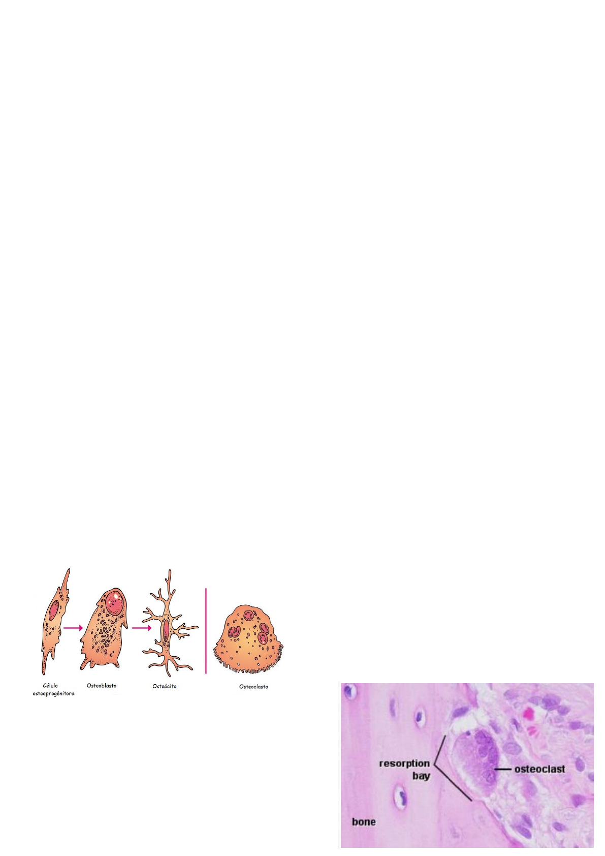 TECIDO ÓSSEO - O osso é uma substância viva com vasos sanguíneos, vasos linfáticos e nervos. - O osso está sujeito a doenças e quando é fraturado, cicatriza. - Se torna mais delgado e fraco pelo desuso e pode atrofiar devido ao aumento de peso. - Serve de suporte para tecidos moles, possui um sistema de alavancas para os músculos esqueléticos, protege órgãos vitais e serve como reserva primária de cálcio do organismo, ou seja, influencia na manutenção do pH interno do corpo e na transmissão e condução do impulso elétrico em nervos e músculos, incluindo o músculo cardíaco. - Absorve toxinas e metais pesados para minimizar o efeito nos outros órgãos. - O tecido ósseo é formado por células e matriz extracelular que é mineralizada, dando-lhe rigidez, mas ainda com um certo grau de elasticidade. - A matriz é composta por uma parte orgânica e outra inorgânica: - Orgânica: 95% são fibras colágenas tipo I e SFA (glicosaminoglicanos e glicoproteínas). Confere flexibilidade. - Inorgânica: 50-65% da matriz é composta por íons cálcio e fosfato na forma de cristais de hidroxiapatita, finas agulhas arrumadas ao longo das fibras colágenas e envolvidos por SFA e outros íons como bicarbonato, magnésio, sódio, potássio e citrato. Confere resistência e rigidez ao osso. CÉLULAS DO TECIDO ÓSSEO Todas são derivadas da mesma linha de células osteoprogenitoras. Osteoblastos - Células jovens com intensa atividade metabólica. - Responsáveis pela produção da parte orgânica da matriz óssea, composta por colágeno tipo I, glicoproteínas e proteoglicanas. Contém também fosfato de cálcio, participando da mineralização da matriz. - Se dispõem um ao lado do outro. Quando estão ativos, são cubóides e têm citoplasma basófilo, já os menos ativos são mais achatados com citoplasma basófilo. - Fazem a regeneração óssea após fraturas. - Uma vez aprisionados na matriz recém-formada, passam a ser denominados osteócitos. Osteócito - São osteoblastos maduros. - Localizados em cavidades ou lacunas dentro da matriz óssea. Destas lacunas formam-se canalículos, onde no seu interior, os prolongamentos dos osteócitos fazem contatos por meio de junções comunicantes, podendo passar poucas moléculas e íons de um osteócito para o outro (e se comunicam com os vasos sanguíneos). - Apenas um osteócito para cada lacuna. - O núcleo é achatado com cromatina condensada, tem pouco RER e complexo de Golgi pouco desenvolvido. - É responsável pela manutenção da matriz extracelular. - Quando os osteócitos morrem, são absorvidos pelos osteoclastos e o osso fica comprometido. Osteoclasto - São células gigantes, globosas, móveis e multinucleadas. - Quando jovens o citoplasma apresenta uma leve basofilia e acidófilos quando maduros. - São resultado da fusão de várias células do sistema fagocitário mononuclear (monócitos e macrófagos). - Participam de processos de absorção e remodelação do tecido ósseo. - Dilatações dos osteoclastos, através da sua ação enzimática, escavam a matriz óssea, formando depressões conhecidas como lacunas de Howship. - Eles dissolvem a matriz óssea liberando cálcio para o sangue (importante na adesão celular, exocitose, coagulação sanguínea, contração muscular e permeabilidade da membrana) PERIÓSTEO E ENDÓSTEO - Recobrem as superfícies interna e externa dos ossos com células osteogênicas e tecido conjuntivo. - Realizam a nutrição do tecido ósseo e o fornecimento de novos osteoblastos, para o crescimento e a recuperação do osso. CLASSIFICAÇÕES DO TECIDO ÓSSEO . Classificação macroscópica/olho nú: - Osso compacto - Osso esponjoso . Classificação microscópica/histológica: - Tecido ósseo primário ou imaturo ou não lamelar - Tecido ósseo secundário ou maduro ou lamelar OSSO COMPACTO - Constituído de partes sem cavidades - Encontrado na periferia dos ossos longos, chatos e irregulares - Parece sólido, mas ao microscópio de luz são observados os Canais de Havers e de Volkmann - Osso compacto forma um envoltório rígido externo, o qual resiste à deformação OSSO ESPONJOSO - Encontrado na extremidade dos ossos longos (epífises) e região central dos ossos chatos e irregulares - Constituídos por trabéculas de matriz óssea, cujos espaços são preenchidos pela medula óssea vermelha (tecido hematopoiético) *Canais de Havers e Volkmann contém vasos sanguíneos e nervos TECIDO ÓSSEO PRIMÁRIO (IMATURO OU NÃO LAMELAR) - É o primeiro a ser formado, sendo gradativamente substituído pelo tecido secundário ou maduro - Na reparação de fraturas - No adulto, persiste apenas nas suturas dos ossos do crânio, nos alvéolos dentários e em pontos de inserção de tendões - Apresenta fibras colágenas dispostas em várias direções e maior proporção de osteócitos que o tecido secundário - Pouco mineralizado (por isso é mais fraco) TECIDO ÓSSEO SECUNDÁRIO (LAMELAR OU MADURO) - É o tipo ósseo encontrado nos adultos - Fibras colágenas organizadas de forma paralela ou concêntrica ao redor dos Canais de Havers, formando o sistema de Havers - Os osteócitos estão entre as lamelas ou dentro delas - Para separar lamelas têm as substâncias cementantes (MEC mineralizada com baixo colágeno) Sistema de Havers Canais de Havers são uma série de tubos estreitos dentro dos ossos por onde passam vasos sanguíneos e células nervosas. São formados por lamelas concêntricas de fibras colágenas. São encontrados na região mais compacta do osso da diáfise óssea (meio de ossos longos). Formado por 4 a 20 lamelas ósseas concêntricas. Quanto mais jovem o canal é, mais largo ele será. O osso forma-se a partir de dois tipos de ossificação, a intramembranosa e a endocondral. OSSIFICAÇÃO INTRAMEMBRANOSA - Forma-se no interior da membrana conjuntiva - Forma o osso frontal, parietal e parte do osso occipital, temporal e maxilares - Crescem-se os ossos curtos e alargam os ossos lon