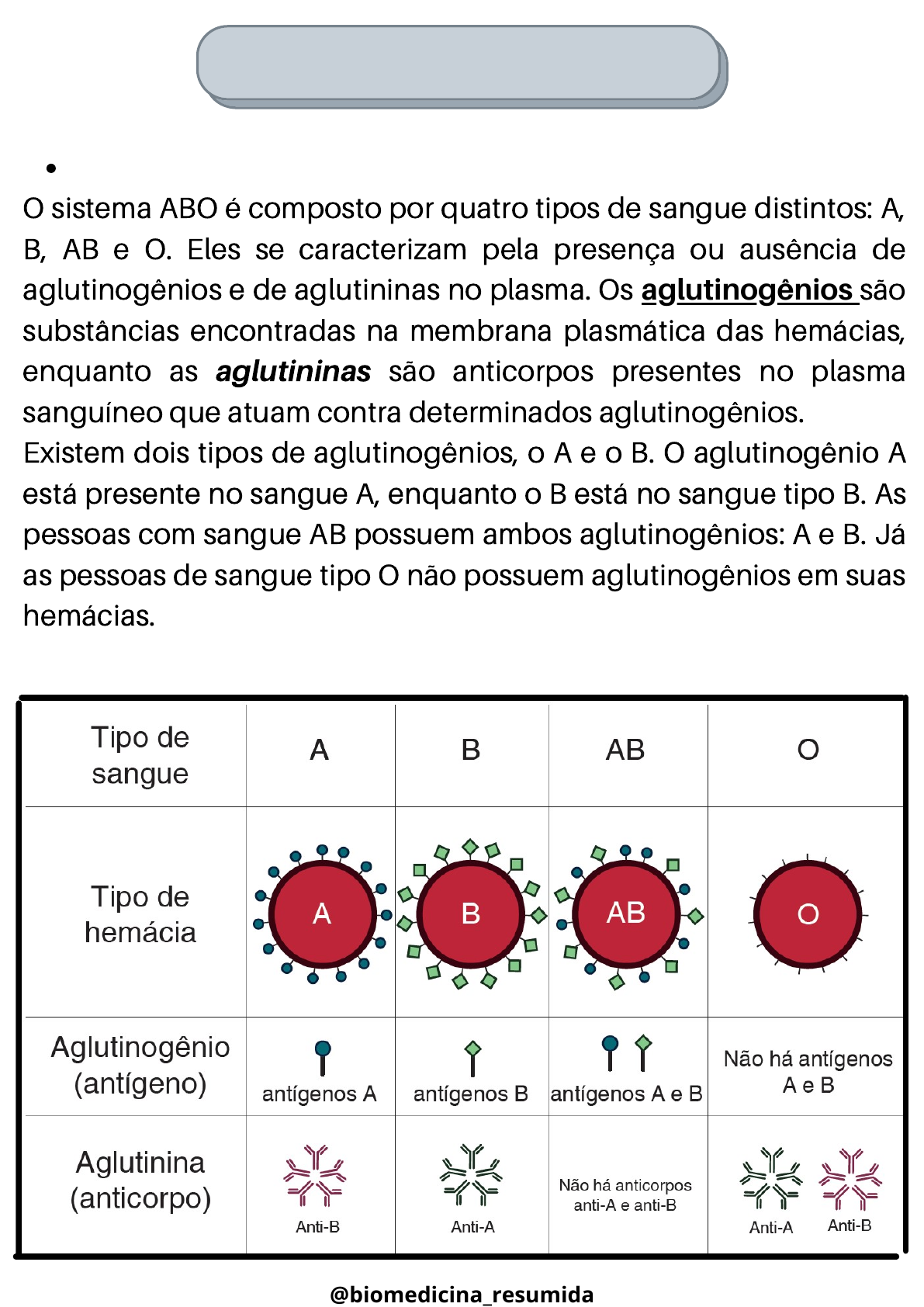 Sistema ABO Aglutinogênios e aglutininas no sistema ABO O sistema ABO é composto por quatro tipos de sangue distintos: A, B, AB e O. Eles se caracterizam pela presença ou ausência de aglutinogênios e de aglutininas no plasma. Os aglutinogênios são substâncias encontradas na membrana plasmática das hemácias, enquanto as aglutininas são anticorpos presentes no plasma sanguíneo que atuam contra determinados aglutinogênios. Existem dois tipos de aglutinogênios, o A e o B. O aglutinogênio A está presente no sangue A, enquanto o B está no sangue tipo B. As pessoas com sangue AB possuem ambos aglutinogênios: A e B. Já as pessoas de sangue tipo O não possuem aglutinogênios em suas hemácias. @biomedicina_resumida Indivíduos de sangue tipo O podem doar para qualquer pessoa, pois não possuem aglutinogênios nas hemácias, sendo conhecido como doador universal, no entanto, só podem receber sangue tipo O, pois apresentam aglutinina anti-A e anti-B. Indivíduos com sangue AB podem receber sangue de qualquer tipo, pois não apresentam aglutininas em seu plasma. Devido a esse motivo, são chamados de receptores universais. Esses indivíduos, no entanto, podem apenas doar para indivíduos com sangue AB, pois possuem aglutinogênios A e B em suas hemácias. Os indivíduos do sangue A não podem doar sangue para indivíduos do sangue B, Eles podem doar para pessoas com sangue A e pessoas com sangue AB. Pessoas com sangue A podem receber doação de pessoas com sangue A ou sangue O. Indivíduos do sangue B não podem doar para os de sangue A, eles podem doar, portanto, para pessoas com sangue B e pessoas com sangue AB. Pessoas com sangue B podem receber doação de pessoas com o mesmo sangue ou sangue O. → Quem doa para quem
