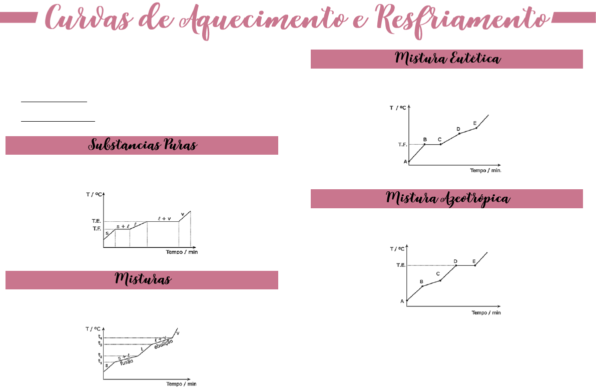 Gráfico de temperatura versus tempo. Pela sua análise, podemos diferenciar as substâncias puras das misturas. Curvas crescentes: aquecimento. Curvas decrescentes: resfriamento. Temperatura de fusão e ebulição são constantes. Temperatura de fusão e ebulição não são constantes. Possuí temperatura de fusão constante; porém, de ebulição variável. Possuí temperatura de fusão variável; porém, de ebulição constante.