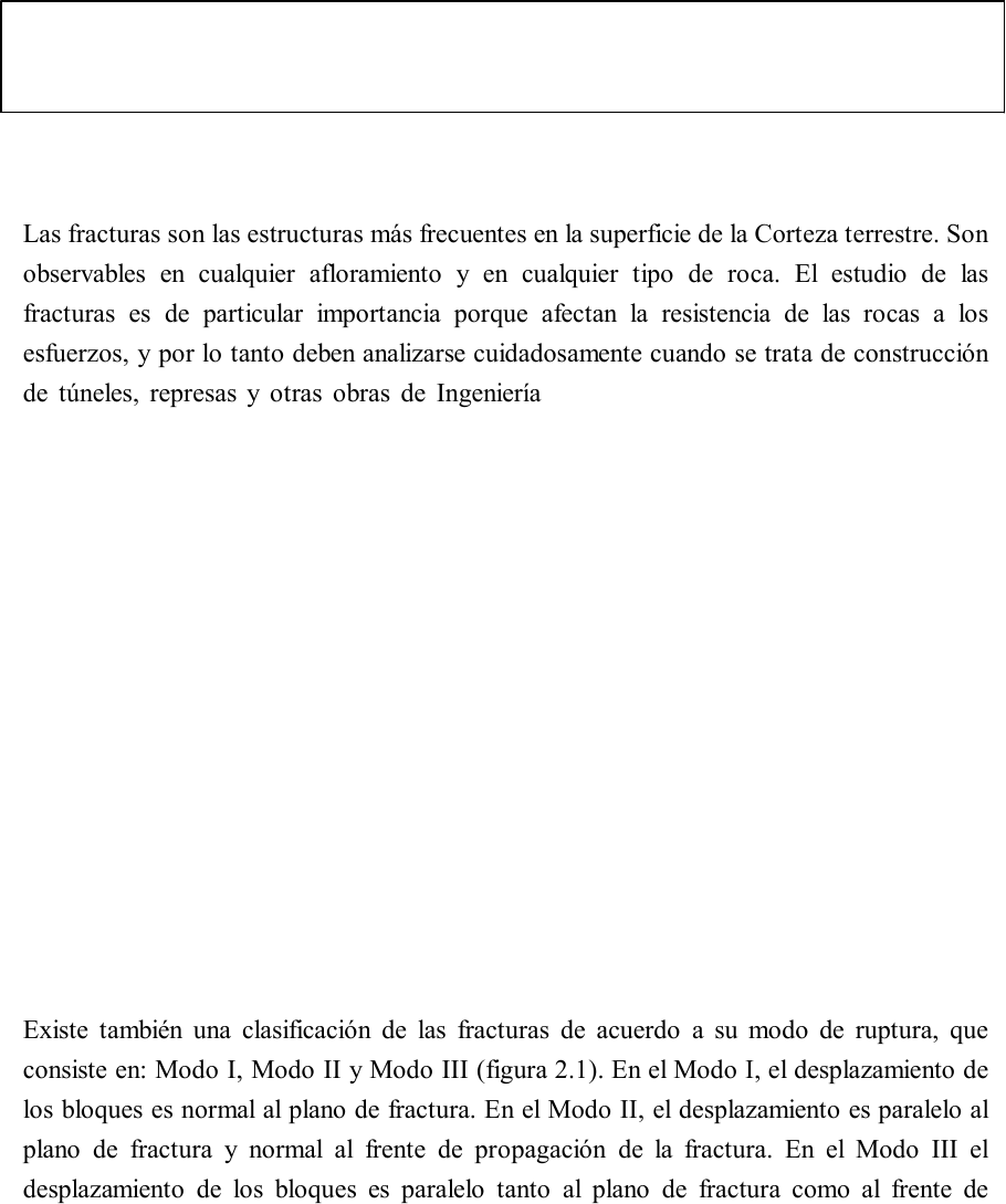 CAPITULO 2: FRACTURAS: FALLAS, DIACLASAS Y VETAS Definición: Son superficies o planos de discontinuidad en la roca, a lo largo de los cuales se pierde la cohesión del material. Las fracturas son las estructuras más frecuentes en la superficie de la Corteza terrestre. Son observables en cualquier afloramiento y en cualquier tipo de roca. El estudio de las fracturas es de particular importancia porque afectan la resistencia de las rocas a los esfuerzos, y por lo tanto deben analizarse cuidadosamente cuando se trata de construcción de túneles, represas y otras obras de Ingeniería. También la distribución de las fracturas condiciona, en parte, el diseño de explotación de una mina. Constituyen, además, lugares geométricos que controlan el emplazamiento de mineralización de rendimiento económico, debido a lo cual deben tomarse como una variable importante en la exploración de yacimientos. Cuando se presenta un desplazamiento medible a lo largo de un plano de fractura, esto es si la roca a un lado de la fractura se ha desplazado con respecto a la roca del otro lado de ella, la fractura se denomina falla. Se elige más o menos arbitrariariamente un desplazamiento mínimo de 0,5 mm para que una fractura reciba el nombre de falla. Por el contrario, si no ocurre desplazamiento o si éste es demasiado pequeño para que sea visible, la fractura se denomina diaclasa. Las vetas son fracturas rellenas con minerales secundarios tales como cuarzo, calcita, etc. Existe también una clasificación de las fracturas de acuerdo a su modo de ruptura, que consiste en: Modo I, Modo II y Modo III (figura 2.1). En el Modo I, el desplazamiento de los bloques es normal al plano de fractura. En el Modo II, el desplazamiento es paralelo al plano de fractura y normal al frente de propagación de la fractura. En el Modo III el desplazamiento de los bloques es paralelo tanto al plano de fractura como al frente de Yoda Highlight Yoda Highlight propagación de la fractura. Mientras el Modo I se denomina modo tensional, los modos II y III corresponden a cizalle. Figura 2.1: Clasificación de fracturas de acuerdo a su modo de apertura. La flecha larga indica la dirección y sentido de propagación de la fractura. Las flechas chicas indican el sentido de movimento relativo de los bloques. FALLAS El predominio de la componente del movimiento paralelo al plano de falla o simple deslizamiento no implica que no pueda existir otro tipo de componente según la falla (figura 2.2). En efecto, en algunas fallas se desarrollan componentes de dilatación o de convergencia. En el primer caso, es frecuente observar crecimiento de fibras de calcita u otro mineral, que marcan la dirección de movimiento de los bloques, el cual es de carácter asísmico. En el segundo caso el deslizamiento simple se encuentra acompañado de una fuerte aproximación entre los bloques y aparece el mecanismo de solución por presión. Si la roca es calcárea, se forman las llamadas slickolitas, que son estilolitas formadas directamente a consecuencia de la presión ejercida por el desplazamiento oblicuo de la falla. Definición: Falla es una fractura planar a lo largo de la cual la roca se ha desplazado según una dirección que es generalmente paralela al plano de ruptura, como consecuencia de la aplicación de un stress de cizalle. Yoda Highlight Figura 2.2: Movimiento a lo largo de una falla F. (a) Movimiento paralelo. (b) Movimiento con componente de dilatación. (c) Movimiento con componente convergente. En rigor, es frecuente que no se observe un plano de falla definido, sino que más bien una Zona de falla , que puede consistir en muchas superficies de falla anastomosadas. Una zona de falla puede tener entre algunos metros y muchas decenas de metros de ancho. En longitud, una zona de falla puede tener hasta varios cientos de kilómetros ( e.g. la Falla de Atacama). En algunas zonas de falla ocurre un movimiento distributivo, cuando el movimiento diferencial se realiza según mútiples desplazamientos pequeños a lo largo de una serie de fallas paralelas (figura 2.3). Figura 2.3: Movimiento distributivo a lo largo de una zona de falla. Las zonas de falla suelen caracterizarse por la presencia de rocas de falla tales como brechas de falla, cataclasitas o milonitas. También, en niveles superficiales de la Corteza, puede presentarse material arcilloso denominado salbanda. Mientras los dos primeros tipos de rocas son propios de un comportamiento mecánico frágil en niveles estructurales superiores, el último tipo aparece en zonas de falla originadas en niveles estructurales profundos, donde las rocas presentan comportamiento mecánico dúctil. De este modo, dependiendo del nivel estructural donde nos encontremos, existe una transición completa desde zonas de falla frágiles hasta zonas de falla dúctiles, pasando por un comportamiento intermedio frágil-dúctil (figura 2.4). En una misma falla, la zona de falla tenderá a ensancharse en profundidad al pasar de un comportamiento frágil a uno dúctil. El comportamiento frágil se verifica en el dominio sismogénico de la Corteza terrestre, en tanto que el comportamiento dúctil es asísmico. Un sistema de fallas es un conjunto de fallas generadas en forma más o menos contemporánea y que obedecen al mismo campo de stress. Figura 2.4: Transición de zonas de falla frágiles hasta zonas de falla dúctiles. (a) Frágil. (b) Frágil-dúctil. (c) Semi-dúctil. (d) Dúctil. (1) Grietas de tensión. Clasificación de fallas La clasificación más útil de las fallas en el dominio frágil es aquella basada en su desplazamiento o rechazo. Se denomina rechazo de una falla al movimiento relativo, a lo largo del plano de falla, de dos puntos que originalmente se encontraban adyacentes. Se distinguen fallas translacionales y fallas rotacionales. En las primeras la magnitud y orientación del rechazo es el mismo en todas sus partes, y en las segundas, el rechazo cambia según la porción del plano que se 