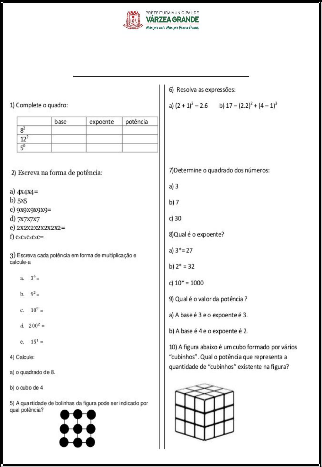 EMBM. MARIA BARBOSA MARTINS PROFESSORA: ERNILHA A. M. SILVA ALUNO (a): ------------------------------------------------------------------------------------------------------------------------. TURMA: ----------------------------------------------. AVALIAÇÃO BIMESTRAL DE MATEMÁTICA 11) Em 8² = 64, responda às seguintes perguntas: a) Qual é a base? b) Qual é o expoente? c) Qual é a potência? 12) Escreva na forma de potência, depois dê os resultados: a) 6 · 6 · 6 · 6 = b) 9 · 9 = c) 7 · 7 · 7 · 7 · 7 · 7 · 7 · 7 = d) a · a · a · a · a = 13) Calcule o que se pede: a) O quadrado de 15; b) O dobro de 15; c) O cubo de 8; d) O triplo de 8; 14) Calcule o valor das expressões (primeiro as potências): a) 35 + 5²= b) 50 -4² = c) -18 + 10² = d) -6² + 20 = e) -12 -1⁶ = f) -2⁵ -40 = 15) Reduza a uma só potência:( conserve a base e soma-se os expoentes): a) 5⁶ . 5² = b) x⁶. x⁷= c) x⁵ .x³ . x = d) m⁶ . m⁰ . m⁵ = e) a . a² . a = f) 2⁴ . 2 . 2⁹ = 16) Encontre as potências de:( conserve a base e subtrai-se os expoentes): a) (-3)⁶ : (-3)² = b) (+4)¹⁰ : (+4)³ = c) (-5)⁶ : (-5)² = d) (+3)⁹ : (+3) = e) (-2)⁷ : (-2)⁵ = f) (-3)⁶ : (-3) = 17) Aplique a propriedade da potência de potência: (conserve a base e multiplica-se expoentes): a) [(-4)² ]³ = b) [(+5)³ ]⁴ = c) [(-3)³ ]² = d) [(-7)³ ]³ = e) [(+2)⁴ ]⁵ = f) [(-7)⁵ ]³ = BOA SORTE!