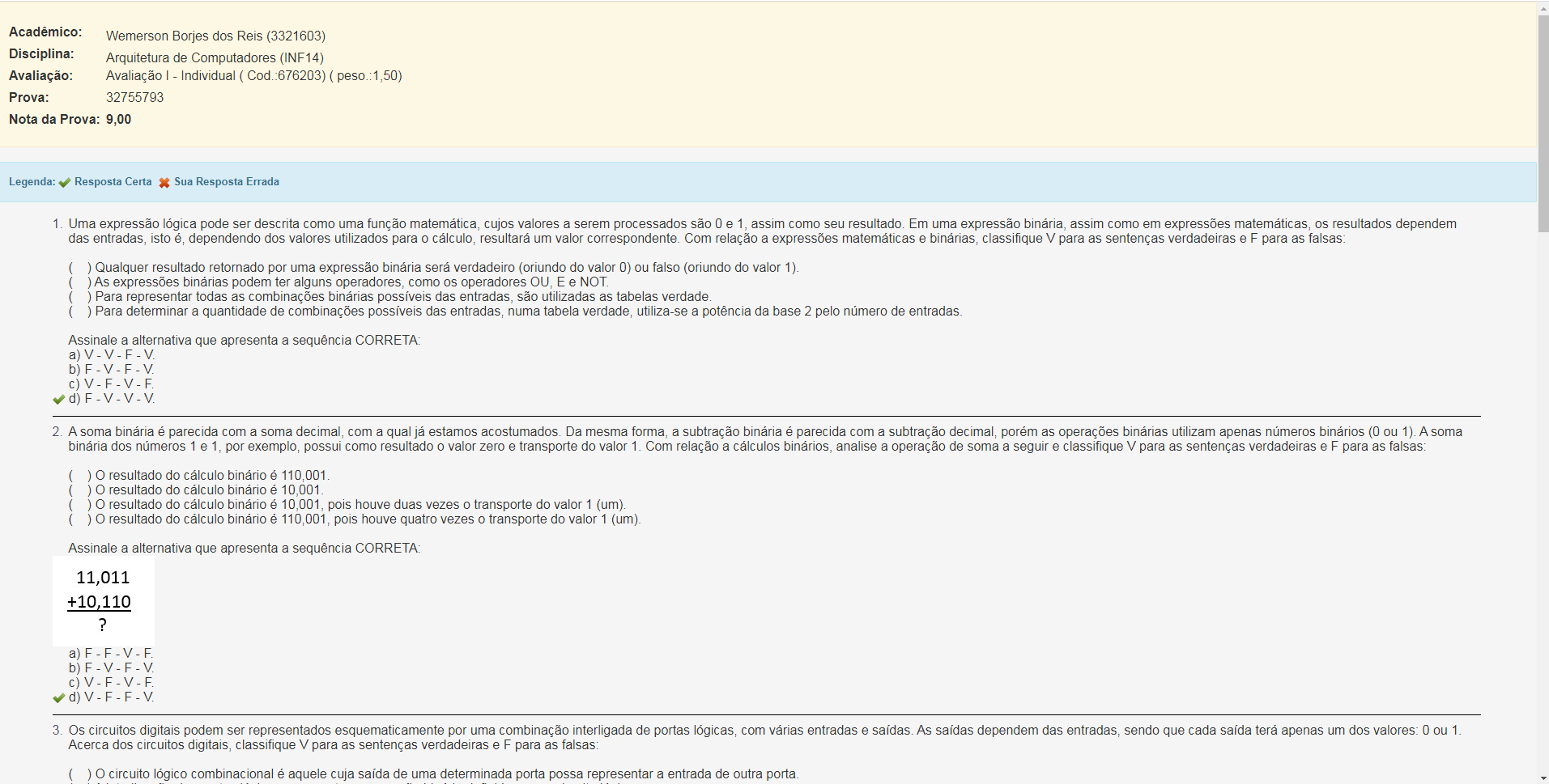 A soma binária é parecida com a soma decimal, com a qual já estamos acostumados. Da mesma forma, a subtração binária é parecida com a subtração decimal, porém as operações binárias utilizam apenas números binários (0 ou 1). A soma binária dos números 1 e 1, por exemplo, possui como resultado o valor zero e transporte do valor 1. Com relação a cálculos binários, analise a operação de soma a seguir e classifique V para as sentenças verdadeiras e F para as falsas: ( ) resultado do cálculo binário é 10,001. ( ) resultado do cálculo binário é 10,001, pois houve duas vezes o transporte do valor 1 (um). ( ) resultado do cálculo binário é 110,001, pois houve quatro vezes o transporte do valor 1 (um). a) F. b) V-F-V. c) V-F-V-F. d) F-V-F-V.