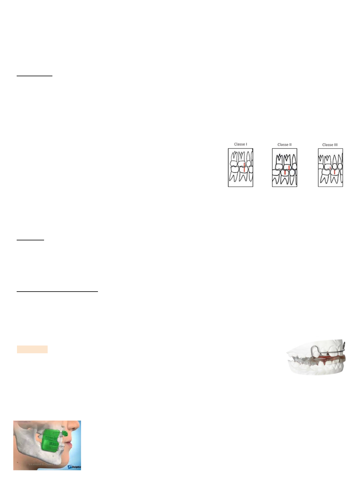 Aula 1: Conceitos em ortodontia Ortodontia (Orto=correção/Dontia = dente): é a especialidade da odontologia responsável pela correção de más posições dentárias, supervisão da biogênese dentária e a correção dos desvios do crescimento craniofacial, por meio de tratamento ortodôntico, ortopédico e/ou cirúrgico. Temos duas partes do tratamento: preventiva (interceptativa) e corretiva. Má oclusão: qualquer desvio das posições dentárias, da morfologia e/ou da função do sistema estomatognático. Angle (1899) classificou a má oclusão em classe I, II e III, essa classificação foi baseada em acreditar que o primeiro molar superior era estável no sentido mésio-distal na arcada e ela continua sendo utilizada até os dias de hoje, porque favorece os estudos, a comunicação e define uma relação dentária importante para os tratamento e, consequentemente, para os diagnósticos. Classificação de Angle: - Classe I: relação da cúspide mésio vestibular do 1M superior ocluindo no sulco central do 1M inferior. - Classe II: relação da cúspide mésio vestibular do 1M superior está a frente do sulco central do 1M inferior, formando um degrau distal. - Classe II: relação da cúspide mésio-vestibular do 1M superior atrás do sulco central do 1M inferior. Existem outras características complementando a classificação. Classificação de Lischer (1912): o autor acrescentou o sufixo versão às posições dentárias (distoversão, mesioversão , vestibuloversão,...). Etiologia: pode estar relacionado a: - Problemas dentários: sentido ântero-posterior (horizontal), vertical e transversal. - Problema esquelético: também pode ser no sentido ântero-posterior, vertical e transversal. Eles se diferem pela gravidade do problema. Se tem uma mordida cruzada de etiologia dentária, por exemplo, é muito mais simples de ser resolvida do que estivesse associada a fatores esqueléticos. Modalidades de tratamento: ortopedia, ortodontia e cirurgia ortognática. A ortodontia também está relacionada à ortopedia e à cirurgia ortognática, porque a ortodontia trata no período de crescimento e após o período de crescimento também. Um problema esquelético não tratado no período de crescimento, na fase adulta vai estar relacionado a procedimentos cirúrgicos para obter a correção. As modalidades de tratamento estão relacionadas à época de tratamento. Ortopedia: se propõe a tratar/melhorar a etiologia dos problemas associados à parte esquelética. Esse aparelho ao lado foi proposto por Balters em 1952 com objetivo de remodelação ósseo no sentido anteroposterior, consequentemente uma adequação funcional associado a melhorar na respiração e fonação. Aparelho normalmente pensado para resolver problemas esqueléticos de classe II. O aparelho vai promover o avanço da mandíbula e, consequentemente, cria a possibilidade de um crescimento maior na cabeça da mandíbula e então ela se posiciona mais anteriormente, melhorando não apenas o posicionamento dentário, como também a parte da orofaringe, melhorando a respiração. Aparelho de Frankel: mais voltado para tratamento de problemas esqueléticos de classe III (com falta de crescimento maxilar), cria condições para esse crescimento maxilar e restringe o crescimento mandibular, e, ao mesmo tempo, aumenta a dimensão vertical e há uma rotação da mandíbula no sentido horário. Aparelho de Schwarz: aparelho removível que promove expansão transversal da arcada superior e da arcada inferior. A expansão quando feita no período de crescimento aumenta o perímetro do arco, aumentando a quantidade de osso presente e cria condições de uma melhor alinhamento dentário. A ortopedia então trabalha mais osso, perímetro de arco, controle de crescimento vertical, ou seja, etiologia relacionada a parte esquelética. Já a ortodontia: dentes. Ortodontia: mais frequentemente quando já tem todos os dentes permanentes na boca ou na fase final da dentição mista, sempre com o objetivo de movimentar dentes ou criar espaços para que os dentes erupcionem. Além dos conhecidos aparelhos ortodônticos convencionais, hoje temos à disposição os aparelhos removíveis/alinhadores. Cirurgia ortognática: após a fase de crescimento, a possibilidade que temos de corrigir desvios ou desequilíbrios esqueléticos que aconteceram durante o crescimento é a cirurgia ortognática. Muitas vezes pode ser evitada se na fase de crescimento o paciente foi diagnosticado corretamente com etiologia esquelética e tratado. Em algumas situações isso não é possível, mesmo tendo passado pelo tratamento durante a fase de crescimento, em função das características etiológicas, por exemplo: prognatismo mandibular severo com 8/9/10 anos de idade, dificilmente terá um equilíbrio dessa face mesmo que as posições dentárias sejam corrigidas. A ortognática tem o objetivo de avançar a mandíbula (região do mento), que poderia ser resolvido com aparelho de propulsão mandibular. Essa cirurgia vai ser feita no indivíduo adulto se o diagnóstico e o plano fizerem a previsão para melhorar o perfil. Nessa imagem da direita: avanço de mandíbula e impactação ou até avanço da maxila, por exemplo num sorriso gengival: é feito uma Le Fort, remove uma quantidade de 3mm, mais ou menos, essa maxila sobe e melhora o sorriso gengival. Elementos básicos para o diagnóstico: O diagnóstico é o ponto de partida para qualquer tratamento ou plano de tratamento. Iniciamos com anamnese e exame clínico e, a partir desses dois tópicos, faremos um registro de diagnóstico (fotografias, modelos, radiografias e tomografias). Tratamento: Tratamento preventivo: reservado à fase de crescimento - Odontologia conservadora da dentadura decídua - Má oclusões nos estágios iniciais - Hábitos de sucção/deglutição podem ser melhor trabalhados. - Desenvolvimento da dentição pode ser orientado - Prevenção de impactação de dentes permanentes -