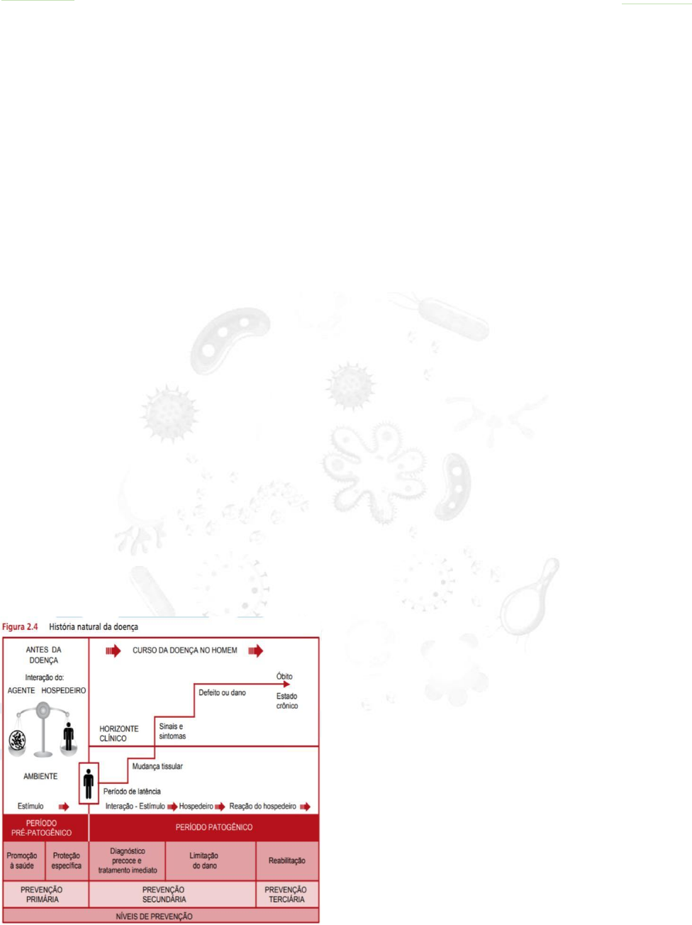 Tríade Epidemiológica no Âmbito das Enteroparositoses No enfoque epidemiológico, não só interessa a descrição dos eventos em saúde e a quem atinge, onde e quando, senão, também, está orientado para procurar explicações do porquê acontecem esses eventos. É o processo de busca da causalidade que permite essas aproximações, com a finalidade de orientar as medidas de intervenção adequadas e a posterior avaliação de sua efetividade. A Tríade Epidemiológica é o modelo tradicional de causalidade das doenças transmissíveis; nesse, a doença é o resultado da interação entre o agente, o hospedeiro suscetível e o ambiente. Os agentes podem ser infecciosos ou não infecciosos e são necessários, mas nem sempre suficientes, para causar a doença. Os agentes não infecciosos podem ser químicos ou físicos. Os fatores do hospedeiro são os que determinam a exposição de um indivíduo, sua suscetibilidade e capacidade de resposta e suas características de idade, grupo étnico, constituição genética, gênero, situação socioeconômica e estilo de vida. Por último, os fatores ambientais englobam o ambiente social, físico e biológico. Nesse modelo se baseia a cadeia de infecção. História natural da doença É o curso da doença desde o início até sua resolução, na ausência de intervenção. Em outras palavras é o modo próprio de evoluir que tem toda doença ou processo, quando se deixa seguir seu próprio curso. O processo se inicia com a exposição de um hospedeiro suscetível a um agente causal e termina com a recuperação, deficiência ou óbito. O período patogênico mostra as mudanças que se apresentam no hospedeiro uma vez realizado um estímulo efetivo. O horizonte clínico marca o momento em que a doença é aparentemente clínica. Nesse modelo, é remarcada a importância das diferentes medidas de prevenção que podem ser realizadas dependendo do momento em que se encontre a doença e deste modo as atividades de prevenção primárias são efetuadas no período pré-patogênico e são encaminhadas para promover a saúde e a proteção específica; na prevenção secundária, as ações são o diagnóstico precoce, o tratamento imediato e a limitação do dano; e a prevenção terciária está focada na reabilitação. Esse modelo assume que os casos clínicos da doença passam por uma fase pré-clínica detectável e que, na ausência de intervenção, a maioria dos casos pré-clínicos evoluem para a fase clínica. Como foi mencionado anteriormente, os períodos de tempo de cada etapa são importantes para a detecção, triagem (ou rastreamento) e intervenção com medidas preventivas e terapêuticas sobre os fatores do agente, hospedeiro e ambiente. Nas doenças transmissíveis, o período de latência é o tempo que transcorre desde a infecção até que a pessoa se torne infectada. O período de incubação é o tempo que transcorre desde a infecção até a apresentação dos sintomas. No caso das doenças não transmissíveis, a terminologia difere um pouco e se considera que o período de latência corresponde ao período que transcorre entre o desenvolvimento da doença subclínica até a apresentação de sintomas. Cadeia Epidemiológica Para entender as relações entre os diferentes elementos que levam ao aparecimento de uma doença transmissível, o esquema tradicional é a denominada cadeia epidemiológica, também conhecida como cadeia de infecção. O esquema procura organizar os chamados elos que identificam os pontos principais da sequência contínua da interação entre o agente, o hospedeiro e o meio. •Agente causal: É um fator que está presente para a ocorrência de uma doença; de modo geral, um agente é considerado uma causa necessária, porém não suficiente para a produção da doença. É um fator que pode ser um micro-organismo, substância química, ou forma de radiação, cuja presença, presença excessiva ou relativa ausência é essencial para a ocorrência da doença. Os agentes podem ser divididos em biológicos e não biológicos; os agentes biológicos são organismos vivos capazes de causar uma infecção ou doença no ser humano e nos animais. •Hospedeiro: É uma pessoa ou animal vivo, incluindo as aves e os artrópodes que, em circunstâncias naturais, permite a subsistência e o alojamento de um agente infeccioso. A entrada do agente, biológico ou não biológico, no hospedeiro inicia o processo de infecção ou o período de latência nas doenças não transmissíveis. •Infecção: É a entrada, desenvolvimento ou multiplicação de um agente infeccioso no organismo de uma pessoa ou animal. Somente a presença de agentes infecciosos vivos nas superfícies do corpo ou em peças de roupas de vestir, brinquedos, ou outros objetos inanimados ou substâncias como água, leite ou alimentos, não constituem infecção senão contaminação dessas superfícies. O desenvolvimento sobre o corpo de agentes patogênicos (ex: piolhos) chama-se infestação. •Infectividade: É a capacidade do agente infeccioso de poder alojar-se e multiplicar-se dentro de um hospedeiro. •Patogenicidade: É a capacidade de um agente infeccioso de produzir doença em pessoas infectadas. A capacidade de produzir doenças depende de uma variedade de fatores, tais como a rapidez e o grau do dano tissular causado pela multiplicação do agente e o fato de que esse possa produzir uma toxina específica, como fazem os bacilos da febre tifoide e do tétano.