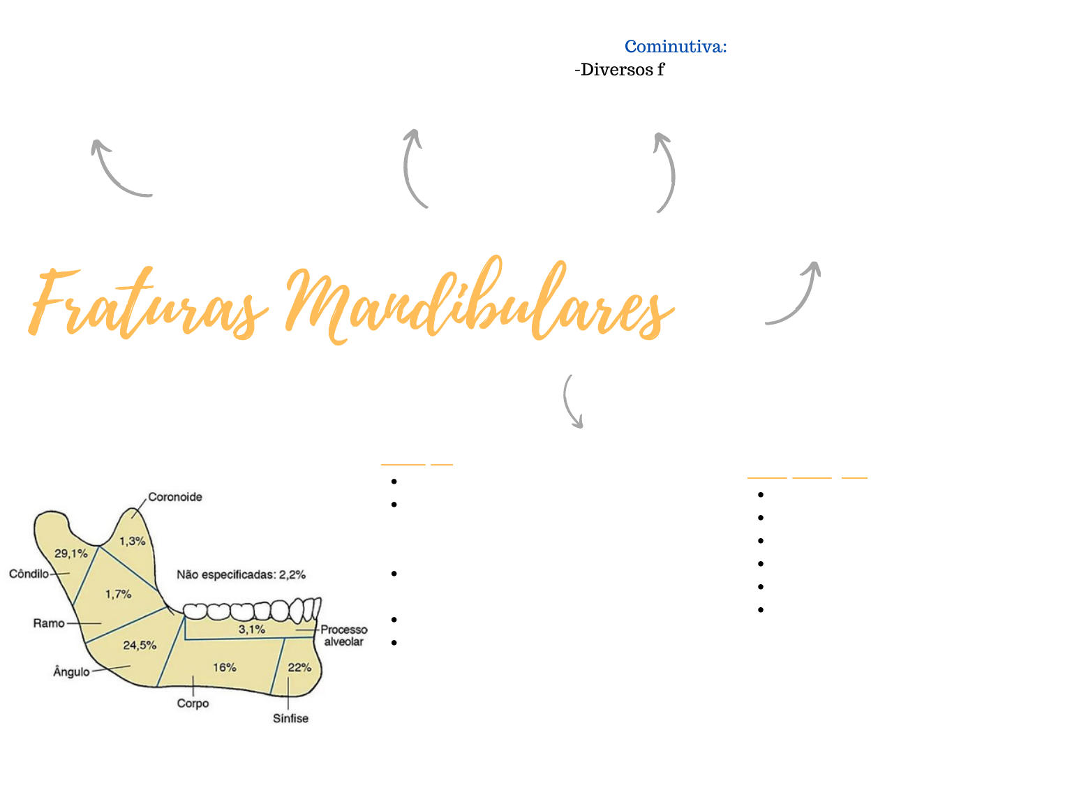Fraturas Mandibulares Cominutiva: -Diversos fragmentos -Arma, alto impacto Composta: -Comunicação da margem do osso com o meio -Envolvendo segmento dentário = composta Simples: -Completa Transecções -Mínima Fragmentação Galho verde: -Incompleta -Flexibilidade mínima -A Z G Se existem dentes: colocar na oclusão Fixação maxilomandibular (FMM) ou fixação intermaxilar (FIM) Estabilização adequada na fase inicial de cicatrização 6 meses Longo período = anquilose óssea/fibrosa; limitação de abertura bucal Redução -> Redução fechada -> Redução aberta *Em alguns-sem necessidade (ex: côndilo 2 a 3 semanas) *S/N = rígida Sem fim ou fim por menos tempo Retorno rápido x cirurgia aberta Fio de aço +FIM (ainda é aceito) Placa e parafuso Load Sharing - Compartilhada Load Bearing - Suportada Fixação rígida Tratamento: