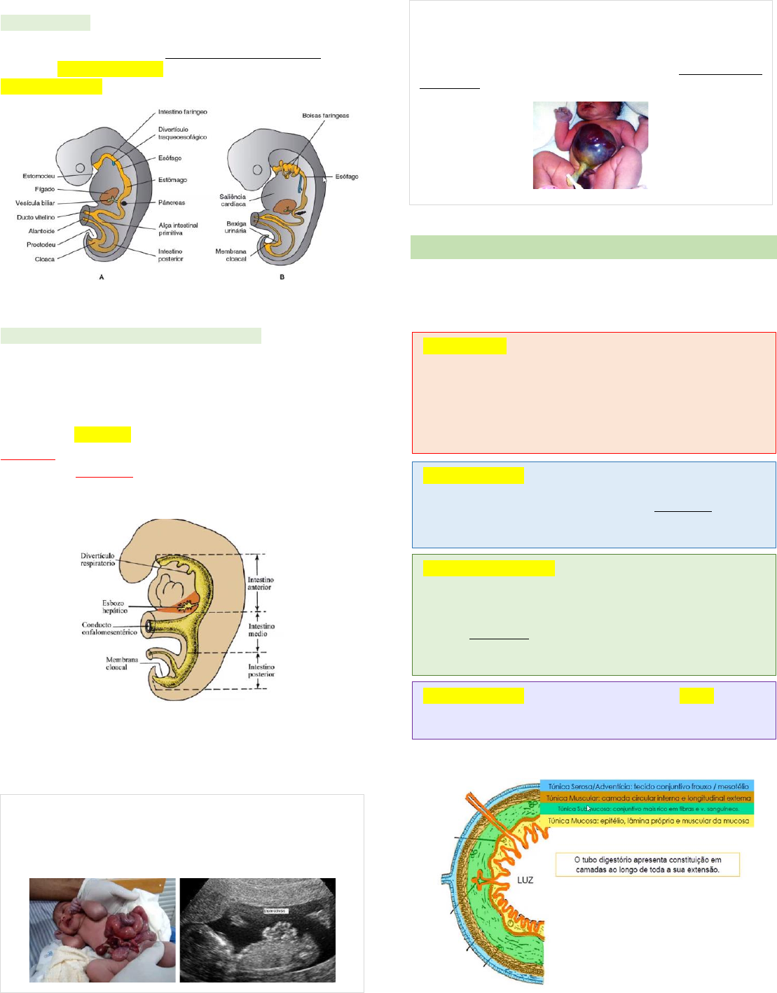 Histologia Gabriele Babel | MED FURB LII Sistema Digestório O sistema digestório consiste no trato digestivo (cavidade oral, esôfago, estômago e intestinos) e suas glândulas anexas (salivares, fígado e pâncreas). A camada mais interna do trato digestivo constitui uma barreira protetora entre o meio externo e interno. O intestino origina-se a partir da incorporação do saco vitelínico. Grande parte tem origem endodérmica, porém a região da boca e ânus têm origem ectodérmica. O intestino primitivo é formado quando as pregas cefálicas, caudal e laterais incorporam a porção dorsal do saco vitelínico do embrião. As membranas bucofaríngea e cloacal se rompem e estabelecem a comunicação do tubo digestório com o exterior do embrião. A placa pré-cordal dá origem a membrana bucofaríngea. Assim que ocorre o dobramento do embrião devido ao crescimento do encéfalo, esta membrana desloca-se para a superfície ventral do embrião, separando o estomodeu (primórdio da cavidade oral revestido por ectoderma) do intestino anterior (primórdio da faringe e do esôfago, revestido pelo endoderma) *O intestino do embrião é dividido em anterior, médio e posterior: A porção mais cefálica do intestino primitivo anterior é a faringe primitiva. Essa região encontra-se comprimida dorsoventralmente. É achatada, graças ao desenvolvimento do encéfalo posteriormente e do coração anteriormente. Os tecidos musculares, conjuntivos e outras camadas são derivadas do mesoderma esplâncnico. Plano geral do Sistema Digestório Todos os componentes do trato digestivo apresentam certas características estruturais em comum. A parede dos tubos ocos são constituídos por 4 camadas: GASTROSQUISE Exposição das alças intestinais e/ou outros órgãos. É um defeito da parede abdominal do feto, cuja parte do intestino fica "para fora", por um orifício ao lado do cordão umbilical. ONFALOCELE Corresponde a uma má-formação da parede abdominal no bebê, que normalmente é identificada ainda durante a gravidez e que se caracteriza pela presença de órgãos, como intestino, fígado ou baço, fora da cavidade abdominal e recobertos por uma fina membrana. Camada Mucosa ➢ Epitélio (pavimentoso estratificado ou cilíndrico simples) ➢ Lâmina própria: TC + pode conter glândulas ➢ Muscular interna: TML ou TMEE, organizado em duas camadas (CI/ LE) Camada submucosa TCF ou TCD. Pode conter o plexo nervoso submucoso, glândulas, vasos sanguíneos, nódulos e vasos linfáticos. Camada Muscular Externa TML ou TMEE (circular interna e longitudinal externa). Entre as duas camadas há tecido conjuntivo e também pode conter o plexo nervoso mioentérico. Organizado em duas camadas (CI/ LE), com exceção do estômago que é em 3 camadas Camada Adventícia (TCD com adipócitos) ou Serosa (TCF + mesotélio= ep. pavimentoso simples) Histologia Gabriele Babel | MED FURB LII Plexo nervoso: É a ramificação de nervo simpático, tanto a nível de camada submucosa como muscular. São compostos principalmente por agregados de células nervosas que formam pequenos gânglios parassimpáticos. Uma rede rica de fibras pré e pós ganglionares do sistema nervoso autônomo e algumas fibras sensoriais possibilitam a comunicação desses gânglios. Esôfago Duodeno e esôfago são os únicos órgãos com glândulas mucosas na camada submucosa. MUCOSA → ➢ Ep. pavimentoso estratificado ➢ Lâmina própria: TCF + glândulas mucosas *As glândulas mucosas podem estar presente em duas regiões específicas, como na região entre o esôfago e faringe e entre o esôfago e a cárdia do estômago. ➢ Muscular da mucosa (CI/LE)- TML (ajuda nos movimentos peristálticos) e TMEE. SUBMUCOSA → Tecido conjuntivo, com glândulas esofágicas (mucosas) e plexo nervoso submucoso. As glândulas esofágicas produzem muco para proteção do epitélio e umidificar para os movimentos peristálticos CAMADA MUSCULAR EXTERNA → 2 camadas CI/ LE ➢ Terço superior: TMEE ➢ Terço médio: TMEE e TML ➢ Terço inferior: TML CAMADA ADVENTÍCIA/ SEROSA → TC fibroso com adipócitos nos terços superior e médio Terço inferior (abaixo do diafragma): camada serosa Histologia Gabriele Babel | MED FURB LII Junção escamocolunar: área de mudança de tecido, muito suscetível a infecções. Epitélio estratificado pavimentoso → epitélio cilíndrico simples. ESÔFAGO DE BARRET: É um tipo de lesão do esôfago causado por episódios repetidos de refluxo gastroesofágico. O tecido do esôfago é substituído por um tecido semelhante ao tecido de revestimento do intestino. Representa uma resposta adaptativa da mucosa à agressão pelo ácido. Estômago Corpo e fundo do estômago possem a mesma estrutura histológica. Na cárdia há glândulas curtas na camada mucosa e pouco ramificadas. No corpo e no fundo há glândulas profundas dicotômicas (braços), tubulares e retas. Na região pilórica há glândulas ramificadas profundas, grandes e com nódulos linfóides, além de fossetas gástricas grandes. MUCOSA → ➢ Ep. cilíndrico simples: formando fossetas gástricas ➢ Lâmina própria: com glândulas gástricas ➢ Muscular da mucosa (CI/LE)- TML SUBMUCOSA → Tecido conjuntivo sem glândulas CAMADA MUSCULAR EXTERNA → 3 camadas (OICMLE) ➢ Oblíqua interna ➢ Circular média ➢ Longitudinal externa CAMADA SEROSA → Tecido conjuntivo + mesotélio (fina camada externa) CAMADA ADVENTICIA → TCF + adipócitos Histologia Gabriele Babel | MED FURB LII Glândulas gástricas: Parietal: citoplasma acidófilo e núcleo basófilo (já que produz uma proteína, que é o fator intrínseco). Produz ácido clorídrico. Muitos prolongamentos voltados ao canalículo (aumento da superfície de contato). Produz o fator intrínseco: glicoproteína importante para a absorção de vitamina B12 pelo íleo (anemia perniciosa = falta de B12) Principal: citoplasma basófilo. Produz pepsinogênio. O pepsinogênio é uma enzima inativa incapaz de