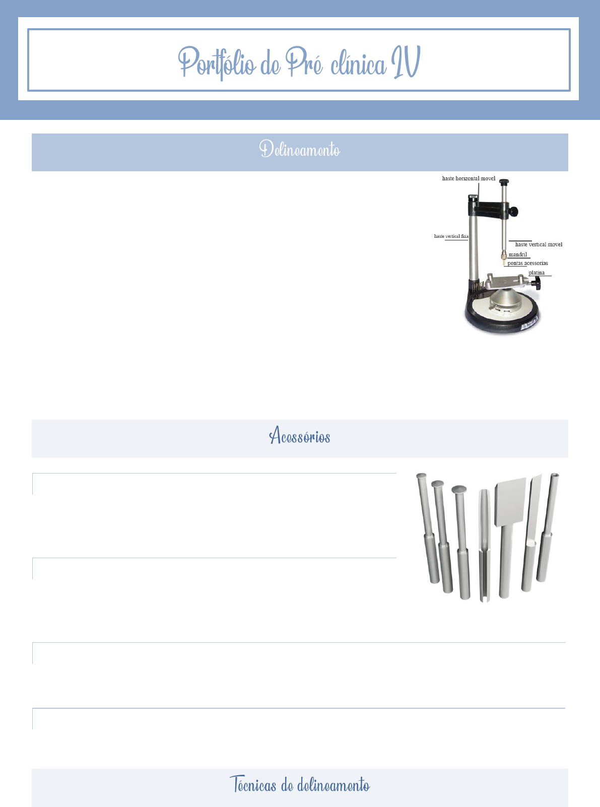 O delineador é um aparelho na qual é composto por haste vertical fixa, haste vertical móvel, mandril, pontas acessórias, platina e porta-acessórios. A platina ou mesa analisadora recebe o modelo e é composta por garras fixaoras ou porta-modelos, parafuso das garras, junta universal, base e trava da junta universal. A haste vertical é fixa no plano horizontal, porém permite movimentos de elevação e abaixamento dos acessórios. A função do delineador é auxiliar no planejamento para promover maior estabilidade, retenção, estática e suporte à prótese. Assim, estuda-se o paralelismo ou sua falta nas superfícies dentais, determinando a trajetória de inserção, localizando as interferências e a necessidade de planos guias. Desta forma, há como analisar áreas retentivas e regiões de alívio. PONTAS ANALISADORAS Determinam a trajetória de inserção mais aceitável, sendo responsáveis por determinar o paralelismo. PONTAS CALIBRADORAS Mede ou determina a quantidade de retenção obtida pelo grampo no dente. FACA DE CORTE Planejamento de planos guias e recorte de cera. PONTA PORTA-GRAFITE Prende o grafite, que contorna as superfícies dos dentes. Assim é demarcado o equador protético. - Técnica de Roach ou dos 3 pontos Técnica de Roth ou das bissetrizes Método seletivo de Applegates ou das Tentativas MÉTODO DAS TENTATIVAS Eixo de inserção/remoção: Trajetória que a prótese deve seguir desde o momento em que sua partes metálicas iniciam o contato com os dentes pilares até seu assentamento final. Busca o equilíbrio entre a melhor quantidade de desgaste para confecção dos planos guias e áreas retentivas Trajetória paralela entre si É preciso selecionar uma trajetória de inserção em que haja um mínimo de interferências em dentes e rebordo. o Retenção é balanceada o A quantidade de desgaste é menor o Há adequação das forças para serem favoráveis à prótese e tecidos. Planos guias: As superfícies proximais dos dentes pilares que possuem relação de paralelismo entre si. Os planos guias precisam ser encontrados para que sejam utilizados como guias durante a inserção/remoção da prótese. Utiliza da movimentação ântero-posterior da platina e desgaste em esmalte. A faca de corte deve estar em contato com o terço médio e oclusal. E o plano oclusal deve ser paralelo à base do delineador. Para transferir o desgaste do modelo para o paciente, a faca deve estar em posição e o dente isolado para então inserir resina duralay no terço oclusal, até o limite da faca. Áreas retentivas Refere-se onde estará localizada a ponta ativa do braço de retenção. A haste da ponta calibradora deve tocar a superfície de maior convexidade enquanto o disco toca a área cervical do dente formando um triângulo. Lembrando que depende do eixo de inserção inserido. Essas áreas devem ser encontradas ou criadas a partir da movimentação latero-lateral da platina, acréscimo de resina composta ou dimple. Para que haja uma área retentiva é preciso que a haste vertical do disco tocando a superfície de maior convexidade, triangulo que representa a área retentiva e extremidade do disco tocando área cervical do dente O equador anatômico não possui interesse protético, se refere a linha equatorial que leva em consideração o dente isolado e em posição vertical. é o equador em relação a todos os dentes, considerando o mesmo eixo de inserção e as diferentes inclinações dos dentes entre siAs áreas retentivas devem ser abaixo o equador protético.
