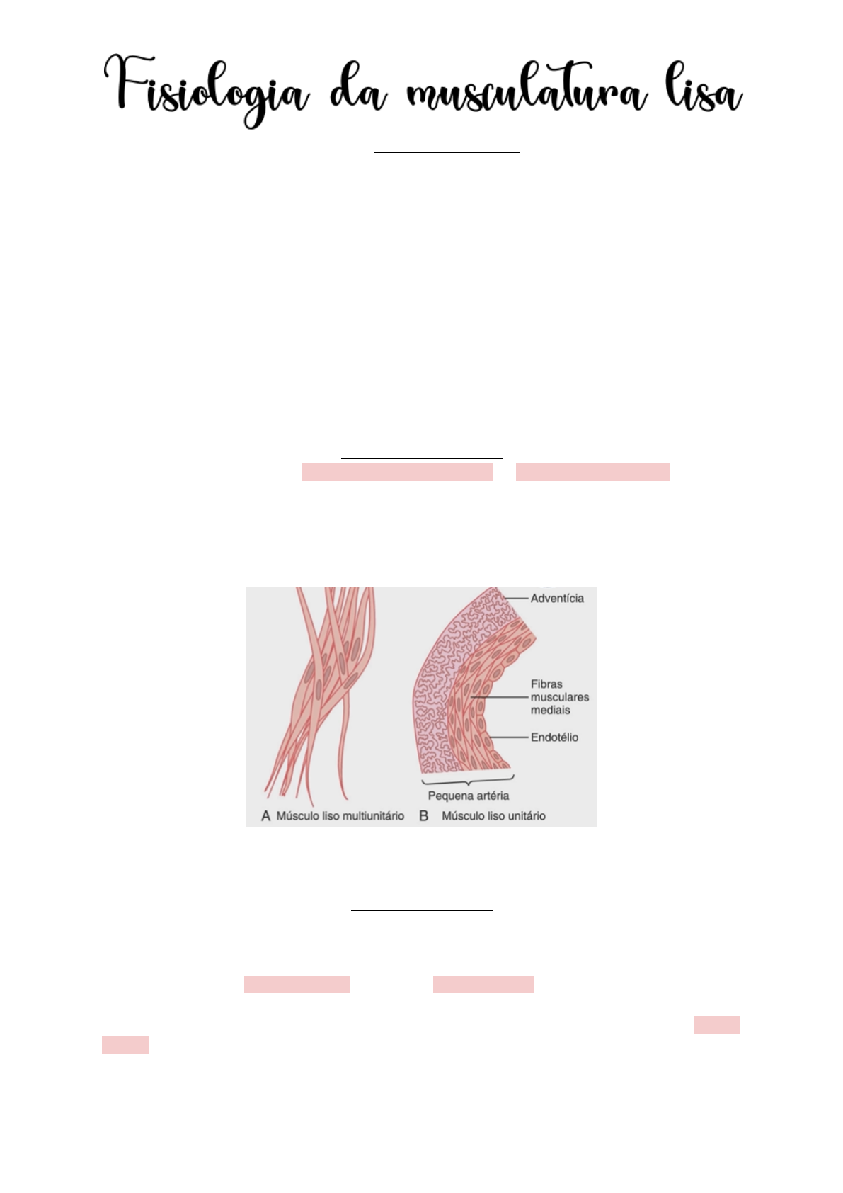 Características gerais O músculo liso é composto por fibras menores quando comparados com as fibras do músculo estriado esquelético (cerca de 30 vezes menor). É importante saber que a força de atração dos filamentos de actina e miosina para gerar uma contração no músculo liso pode ser a mesma do músculo esquelético, mas o arranjo interno das fibras é diferente. O músculo esquelético tem um aspecto estriado devido à interdigitação das proteínas actina e miosina. Na musculatura lisa existem essas proteínas, mas elas não estão interdigitadas, por isso que seu arranjo interno é diferente. O músculo liso de cada órgão se distingue do dos outros órgãos por alguns aspectos: ● Dimensões físicas ● Organização em feixes e folhetos ● Respostas a diferentes tipos de estímulos ● Características de inervação ● Função Tipos de músculos lisos Existem dois tipos: Músculo liso multiunitário e músculo liso unitário (também chamado de unidade única, músculo liso visceral ou sincicial). O multiunitário tem várias fibras, assim como o unitário também. O que difere é que no músculo liso unitário as fibras estão bem conectadas e vão se contrair ou relaxar todas juntas, enquanto que na multiunitária cada fibra se comporta de maneira diferente das outras - vão se contrair ou relaxar sem dependência das outras. Exemplos de músculo liso multiunitário são o músculo ciliar do olho, músculo da íris e os músculos piloeretores. O restante, basicamente, é do tipo unitário. Mecanismo contrátil Na base química: assim como o músculo estriado esquelético, o músculo liso possui: os filamentos de actina e de miosina e a ativação do processo contrátil através de íons Ca + + e ATP. No entanto, não possui aquele complexo de troponina. De maneira geral, a contração dos músculos lisos é mais demorada e demanda menos energia, justamente porque o ATP vai continuar ali por mais tempo. Na base física: Uma coisa muito importante da musculatura lisa são os corpos densos. Eles conectam as células para que a força da contração seja transmitida adiante. São semelhantes às linhas/disco Z do músculo estriado. Contração do músculo liso VS. contração do músculo esquelético ● Baixa frequência de Ciclos das Pontes Cruzadas de miosina - todo aquele processo de entrada de íons cálcio na célula, união do ATP à cabeça de miosina, atividade ATPase (no caso da musculatura esquelética) com transformação de ATP em ADP + Pi, movimentos de força ao se conectar com a actina e etc ocorre com frequência menor e velocidade inferior. ● Baixa energia necessária para manter a contração - como a contração muscular é mais prolongada, a frequência é menor e, assim, durante todo o processo não será necessário tanto ATP. Supondo números, digamos que uma única molécula de ATP no músculo esquelético produz uma contração de 0,5 segundos, enquanto que uma molécula de ATP no músculo liso produz uma contração de 2 segundos (só exemplo). ● Lentidão do início da contração e do relaxamento do tecido muscular liso total - assim como a contração é devagar, o relaxamento também ocorre de maneira lenta. ● A força máxima a contração geralmente é maior do que na musculatura esquelética - isso porque ela se mantém por mais tempo e os filamentos de actina tipo puxam de lados opostos. Como prova disso, o músculo esquelético diminui em até 30% do seu tamanho na contração e o músculo liso diminui em até 70% do seu tamanho no mesmo processo. ● O mecanismo de ´´Trava`` facilita a manutenção prolongada das contrações - Aquela função ATPase da cabeça de miosina para clivar o ATP em ADP + Pi não existe aqui nos músculos lisos, só nos esqueléticos. É outra enzima que vai atuar. Será discutida adiante. ● Estresse-Relaxamento - quando um músculo liso sofre distensão ele sofre depois uma contração, movimento conhecido como peristaltismo. Contração Ao invés da troponina, que atua na musculatura esquelética, aqui temos a ação da proteína calmodulina. Ela tem a função de ativar as pontes cruzadas (cabeça) da miosina nesta sequência: 1. Os íons cálcio se ligam à calmodulina - eles podem vir do líquido extracelular e do retículo sarcoplasmático (porque ele não é tão desenvolvido como no músculo esquelético). Do meio extracelular eles podem vir de canais voltagem-dependentes e de canais ligante-dependentes, que podem ter ativação por neurotransmissor, hormônio e etc. 2. Forma-se o complexo cálcio-calmodulina que se une à miosina e ativa a enzima fosforilativa miosina-cinase (MLCK). 3. Uma das cadeias leves de cada cabeça da miosina é fosforilada em resposta a essa enzima. Sem a fosforilação, a conexão da cabeça com os pontos ativos não ocorre. Em outras palavras, só ocorre a contração muscular se houver essa fosforilação com a miosina-quinase. 4. Depois do tempo de contração que for necessário, a enzima miosina-fosfatase é ativada para a retirada do fosfato da cabeça da miosina, ocorrendo relaxamento progressivo. Enquanto que nos músculos estriados esqueléticos o potencial de ação (que é a estimulação da contração) chega por controle nervoso (neurônios), nos músculos lisos ele pode vir de outras formas. Lembrando que todas essas possibilidades ocorrem porque o músculo liso possui muitos tipos de receptores que podem iniciar um processo de contração e muitos outros que podem inibir. São eles: ● Sinais nervosos também ● Estimulação hormonal ● Estiramento do músculo Junções neuromusculares - anatomia fisiológica É diferente das do músculo esquelético! A primeira diferença é a presença de varicosidades aqui. São conexões - tipo varizes - entre as fibras nervosas. Como aqui não tem aquelas placas motoras terminais, essas varicosidades, juntamente com as próprias extremidades dos nervos, servem para a liberação do neurotransmissor,