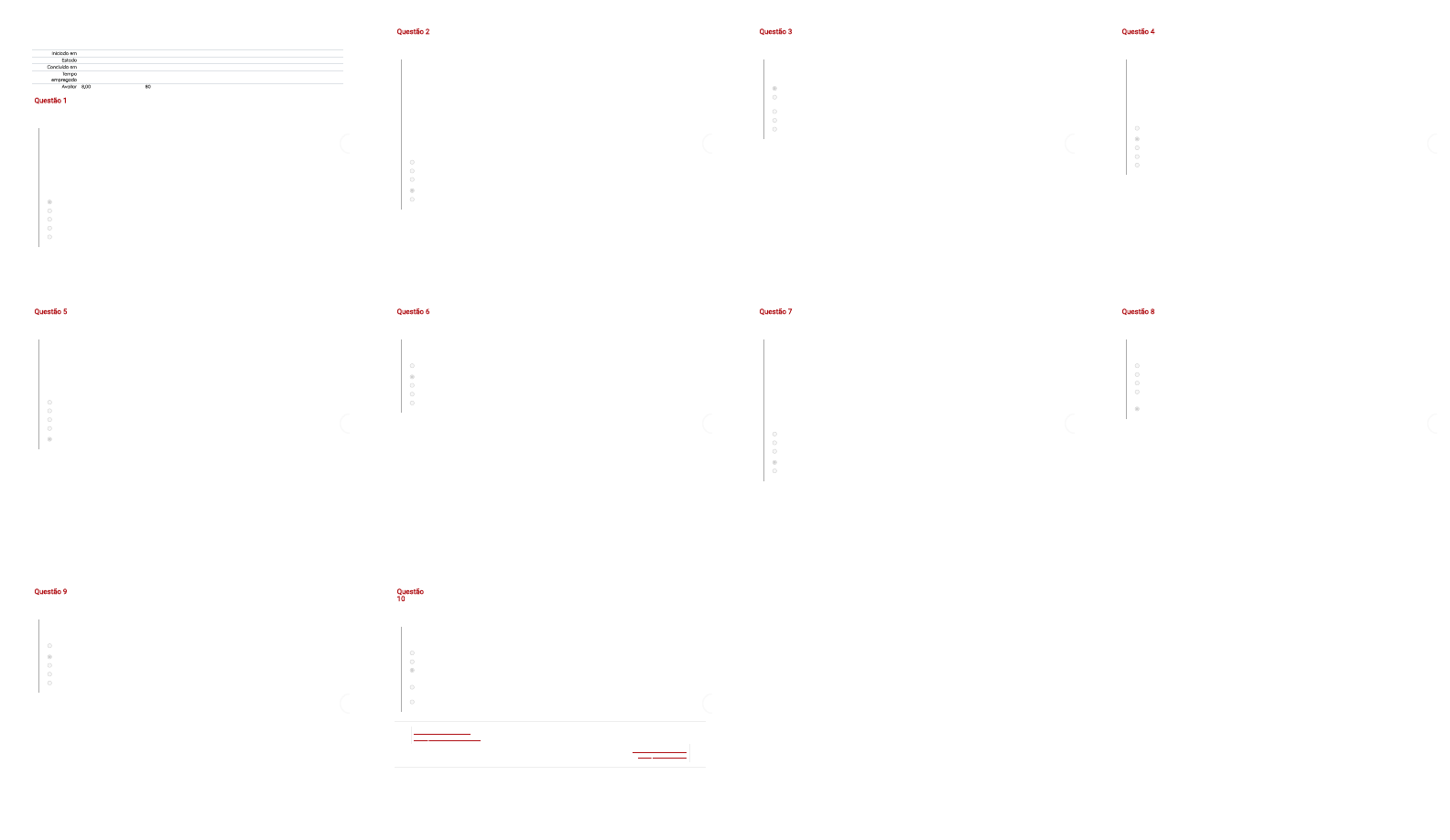 01/10/2020 Avaliação Formativa I: Revisão da tentativa https://virtual.uninta.edu.br/mod/quiz/review.php?attempt=2047292&cmid=65774 1/10 Iniciado em Thursday, 1 Oct 2020, 09:21 Estado Finalizada Concluída em Thursday, 1 Oct 2020, 09:58 Tempo empregado 36 minutos 43 segundos Avaliar 8,00 de um máximo de 10,00(80%) Questão 1 Incorreto Atingiu 0,00 de 1,00 Sobre a Musculação podemos a�rmar que: I) A musculação é e�ciente para estimular a saúde cardiovascular, necessitando ser complementada com exercícios aeróbicos; II) Os efeitos promotores de saúde cardiovascular foram documentados nos exercícios aeróbicos, que �caram conhecidos por essa qualidade; III) Atualmente, a hipótese de que a musculação seja a mais e�ciente forma de estimular a saúde cardiovascular está sendo investigada. Está(ão) correta(s): Escolha uma: a. Somente I e III. b. Somente I e II. c. As a�rmativas I, II e III. d. Somente II e III. e. Somente a I. 01/10/2020 Avaliação Formativa I: Revisão da tentativa https://virtual.uninta.edu.br/mod/quiz/review.php?attempt=2047292&cmid=65774 2/10 Questão 2 Correto Atingiu 1,00 de 1,00 O alongamento antes e depois da musculação é indispensável? Sobre a informação acima podemos concluir que: I- O alongamento pode ser utilizado antes da musculação como forma de aquecimento, mas não é a melhor. O aquecimento tradicional da musculação é realizar uma movimentação geral do corpo e iniciar cada exercício com pesos leves, aumentando as cargas nas séries subsequentes. II- Evidências atuais sugerem que o melhor aquecimento para todas as atividades físicas é a própria atividade a ser realizada, porém de forma suave, o que con�rma os procedimentos tradicionais da musculação. III- O alongamento realizado após as sessões de musculação tem a proposta de relaxar os músculos, diminuindo a hipertonia e o intumescimento muscular. No entanto, esses fenômenos �siológicos desaparecem espontaneamente com o repouso e, enquanto perduram, a sensação é de prazer. Essa sensação é o pump, que determinou a expressão pumping iron e que muito contribui para a manutenção do comportamento de exercitar os músculos. Está(ão) correta(s): Escolha uma: a. Somente I e II. b. Somente I e III. c. Somente a I. d. As a�rmativas I, II e III. e. Somente II e III. 01/10/2020 Avaliação Formativa I: Revisão da tentativa https://virtual.uninta.edu.br/mod/quiz/review.php?attempt=2047292&cmid=65774 3/10 Questão 3 Incorreto Atingiu 0,00 de 1,00 Marque a alternativa correta: Escolha uma: a. A musculação não produz deformidades posturais, porém necessita ser complementada com técnicas como RPG. b. A musculação pode produzir deformidades posturais, necessitando ser complementada com técnicas como RPG e ginástica corretiva. c. A musculação pode produzir deformidades posturais, necessitando ser complementada com técnicas como RPG. d. A musculação não produz deformidades posturais, e não necessitando ser complementada com técnicas como RPG. e. A musculação pode produzir deformidades posturais, não necessitando ser complementada com técnicas como RPG. 01/10/2020 Avaliação Formativa I: Revisão da tentativa https://virtual.uninta.edu.br/mod/quiz/review.php?attempt=2047292&cmid=65774 4/10 Questão 4 Correto Atingiu 1,00 de 1,00 A musculação como promotora de saúde, quais dos itens abaixo está(ão) correta(s): I) Os efeitos promotores de saúde cardiovascular e os efeitos terapêuticos para doenças sistêmicas da atividade física parecem ocorrer com mais e�ciência e segurança quando são utilizados os exercícios resistidos. II) Melhora da composição corporal, a mudança favorável do per�l hormonal, a redução da resistência à insulina e o aumento da taxa metabólica basal. III) Controlar doenças como hipertensão arterial, diabetes e obesidade é importante para evitar a degeneração das artérias e todas as suas consequências. Escolha uma: a. Somente a I. b. As a�rmativas I, II e III. c. Somente II e III. d. Somente I e II. e. Somente I e III. 01/10/2020 Avaliação Formativa I: Revisão da tentativa https://virtual.uninta.edu.br/mod/quiz/review.php?attempt=2047292&cmid=65774 5/10 Questão 5 Correto Atingiu 1,00 de 1,00 A prática da musculação relacionada ao peso corporal, podemos a�rmar que: I) A musculação não é competente para estimular a redução da gordura corporal, necessitando ser complementados com exercícios aeróbicos; II) A musculação é muito e�ciente para estimular a redução do tecido adiposo; III) Além de consumir calorias como todos os tipos de atividade física, o ganho de massa muscular aumenta o gasto calórico em repouso. Escolha uma: a. As a�rmativas I, II e III. b. Somente I e II. c. Somente a I. d. Somente I e III. e. Somente II e III. 01/10/2020 Avaliação Formativa I: Revisão da tentativa https://virtual.uninta.edu.br/mod/quiz/review.php?attempt=2047292&cmid=65774 6/10 Questão 6 Correto Atingiu 1,00 de 1,00 Marque a alternativa correta: Escolha uma: a. A musculação pode diminuir a �exibilidade, necessitando ser complementada com exercícios de relaxamento. b. A musculação não diminui a �exibilidade. c. A musculação pode diminuir a �exibilidade, necessitando ser complementada com exercícios de alongamento. d. A musculação pode diminuir a �exibilidade, necessitando ser complementada com exercícios de alongamento. e. A musculação não diminuir a �exibilidade, todavia necessita ser complementada com exercícios de alongamento. 01/10/2020 Avaliação Formativa I: Revisão da tentativa https://virtual.uninta.edu.br/mod/quiz/review.php?attempt=2047292&cmid=65774 7/10 Questão 7 Correto Atingiu 1,00 de 1,00 A musculação pode deformar o corpo feminino? I) - As formas corporais arredondadas são determinadas pelos contornos dos músculos, que são assim os elementos modeladores do corpo. A consistência �rme ao toque também é a dada pela estrutu