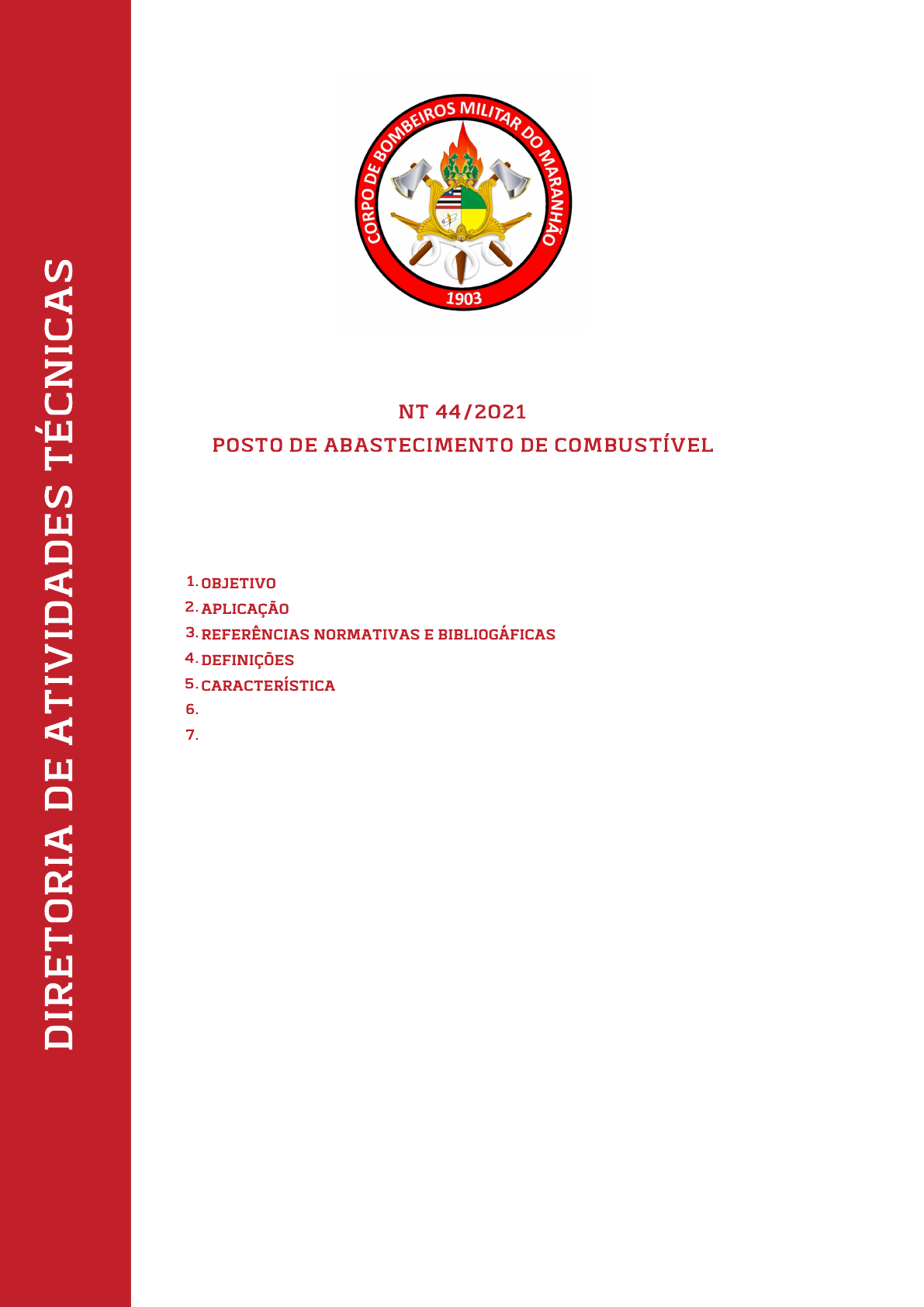 2021 D IR E T O R IA D E A T IV ID A D E S T É C N IC A S NT 44/2021 POSTO DE ABASTECIMENTO DE COMBUSTÍVEL OBJETIVO APLICAÇÃO REFERÊNCIAS NORMATIVAS E BIBLIOGÁFICAS DEFINIÇÕES CARACTERÍSTICAS CONSTRUTIVAS PROTEÇÃO CONTRA INCÊNDIO DISPOSIÇOES GERAIS 1. 2. 3. 4. 5. 6. 7. NT 44/2021 - Posto de Abastecimento de Combustível 1. OBJETIVO 1.1. Esta Norma Técnica estabelece os requisitos mínimos para projeto, instalação, localização, proteção e segurança dos locais de abastecimento de combustíveis, atendendo ao previsto na Legislação de Segurança Contra Incêndio e Emergências do Estado do Maranhão 2. APLICAÇÃO 2.1. Esta Norma Técnica aplica-se às áreas de abastecimento de postos revendedores varejistas de combustível líquido para veículos automotores. 2.2. Nos casos de armazenamento de petróleo, seus derivados líquidos, inclusive os petroquímicos, álcool carburante, instalações de refino, indústrias petroquímicas, bases de distribuição, terminais e estações coletoras nas áreas de produção de petróleo, deverão ser aplicadas, além do que preceitua a ABNT NBR 17505, bem como, as recomendações da Agência Nacional do Petróleo, Gás Natural e Bicombustíveis (ANP). 3. REFERÊNCIAS NORMATIVAS E BIBLIOGRÁFICAS 3.1. Nas normas relacionadas a seguir contêm disposições que, ao serem citadas neste texto, constituem prescrições para esta Norma Técnica: MARANHÃO, LEI Nº 11.390, DE 21 DE DEZEMBRO DE 2020, que Institui o Regulamento de Segurança Contra Incêndios das edificações e áreas de risco no Estado do Maranhão, e dá outras providências. ABNT NBR 5410/2004 – Instalações Elétricas de Baixa Tensão - Procedimentos; _______. NBR 5419/2015 – Proteção de Edificações Contra Descargas Elétricas Atmosféricas - Procedimentos; _______. NBR 12236/1994 – Critérios de Projeto, Montagem e Operação de Posto de Gás Combustível Comprimido; _______. NBR 15514/2007 – Área de Armazenamento de Recipientes Transportáveis de Gás Liquefeito de Petróleo (GLP), Destinados ou Não à Comercialização – Critérios de Segurança. _______. NBR 17505/2006 – Armazenagem de Líquidos Inflamáveis e Combustíveis; 4. DEFINIÇÕES 4.1. Para os efeitos desta Norma Técnica aplicam-se as definições constantes na Norma Técnica 03 – Terminologia de Segurança Contra Incêndio, além do seguinte: 4.1.1. Posto revendedor varejista: estabelecimento ou instalação, destinado a venda à varejo de combustíveis automotivos, e que tenham registro de revendedor varejista de combustíveis automotivos expedido pela ANP. 4.1.2. Tanque subterrâneo: tanque horizontal construído e instalado para operar abaixo do nível do solo e totalmente enterrado. 4.1.3. Unidade de abastecimento: conjunto de um a quatro pontos de abastecimento de combustível (bomba). 5. CARACTERÍSTICAS CONSTRUTIVAS 5.1. Considerações Gerais 5.1.1. Admite-se a construção de posto de abastecimento de autos nos logradouros permitidos pelo Regulamento de Zoneamento do Município desde que obedeça ao afastamento de 50 metros das ocupações do Grupo E-1, E-5, E-6, F-11, H- 2, H-3 e H-5 da NT 01, medido a partir da projeção da cobertura da área de abastecimento. 5.1.2. Não é permitido a construção de postos de combustíveis em meio fio. 5.1.3. A instalação de tanques no interior de edificações deve seguir o que preconiza a NT 25. 5.1.4. Os tanques de postos revendedores varejistas somente poderão ser do tipo subterrâneo. 5.1.5. A capacidade de cada tanque instalado será de no máximo 30 m3. 5.1.6. É permitida a subdivisão do tanque, inclusive com armazenamento de líquidos diferentes, respeitado o volume máximo de 30 m3 por tanque. 5.1.7. Os locais de abastecimento de combustíveis com capacidade de armazenamento de líquidos inflamáveis e combustíveis instalados no local maior que 120 m³ devem atender, além do que preceitua esta Norma Técnica, à NT 25, conforme as classes dos líquidos inflamáveis ou combustíveis armazenados. 5.1.8. O volume do tanque destinado exclusivamente ao armazenamento de óleo lubrificante usado, não é computado na determinação da capacidade máxima instalada. 5.1.9. Os aspectos construtivos dos tanques para armazenamento de combustíveis obedecerão às condições previstas nas normas brasileiras próprias. 5.1.10. Os postos de abastecimento revendedor e privativo deverão possuir canaletas metálicas de contenção do escoamento de combustíveis que circundem tanto os tanques quanto a área de abastecimento. 5.1.11. Os tanques instalados em áreas sujeitas a inundações devem atender aos requisitos da ABNT NBR 17505 no que se refere à sua instalação. NT 44/2021 - Posto de Abastecimento de Combustível 5.1.12. As instalações de locais de abastecimento de combustíveis deverão ser protegidas por Sistemas de Proteção Contra Descargas Atmosféricas (SPDA), conforme previsto na ABNT NBR 5419. 5.1.13. A malha de aterramento do SPDA deverá ter afastamento mínimo de 3,0 m dos tanques. 5.1.14. Nos locais de descarga de combustível deverá existir condutor terra apropriado, conforme a NR 10 do Ministério do Trabalho, para se descarregar a energia estática dos carros transportadores, antes e durante a descarga do combustível. 5.2. Tanques subterrâneos 5.2.1. Os tanques e unidades de abastecimento (bombas) deverão possuir afastamento mínimo do alinhamento de vias públicas, de divisas de propriedades e de demais edificações, conforme a Tabela 1. Tabela 01: Afastamentos mínimos de tanques e unidades de abastecimento à via pública, divisa de propriedade e edificações. Afastamentos Mínimos de Tanques e Bombas (m) Locais Tanques Unidade de Abastecimento Via pública e divisas de propriedade 3,0 4,0 Edificações 3,0 3,0 5.2.2. Os tanques subterrâneos devem possuir suspiros direcionados para cima projetados pelo menos 3,7 metros acima do solo ou do piso acabado, e 1,5 metros de distância de aberturas de edi