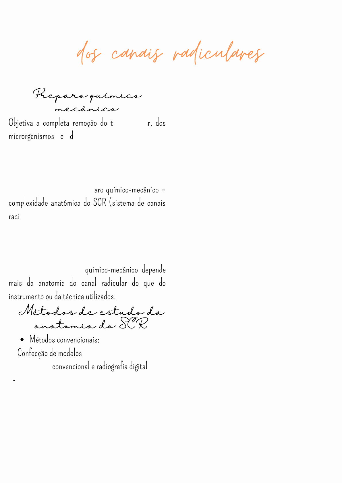 Anatomia interna Preparo químico mecânico Objetiva a completa remoção do tecido pulpar, dos microrganismos e da dentina infectada e uma adequada modelagem, propiciando condições ideais para o selamento da cavidade pulpar e reparos dos tecidos perirradiculares. OBS: Fator limitante do preparo químico-mecânico = complexidade anatômica do SCR (sistema de canais radiculares). Que favorece a permanência de remanescentes teciduais e bacterianos em istmos reentrâncias e ramificações, principalmente em canais ovais, achatados ou curvos. O resultado do preparo químico-mecânico depende mais da anatomia do canal radicular do que do instrumento ou da técnica utilizados. dos canais radiculares Métodos convencionais: Métodos de estudo da anatomia do SCR - Confecção de modelos em cera; - Radiografia convencional e radiografia digital - Injeção de resina - Avaliação macroscópica - Técnicas de diafanização (processo para tornar órgãos humanos translúcidos, no dente essa técnica era obtida através da injeção de materiais fluídos, como a liga fundida de Wood, corantes ou gelatina associada a um corante) - Métodos radiográficos usando substâncias de contraste - Microscopia eletrônica de varredura; Os estudos que utilizaram métodos convencionais que merecem destaque são de: Pucci e Reig; Green; Piñeda e Kuttler; Vertucci; De Deus; e Pécora. O conjunto desses trabalhos estabeleceu pressupostos para o entendimento e discussão dos principais aspectos relacionados a anatomia interna dos dentes e sua inter-relação com o tratamento endodôntico. No entanto algumas limitações, nesses estudos, devem ser consideradas, como o fato dos métodos radiográficos e de secção dos dentes so fornecerem uma imagem bidimensional de uma estrutura tridimensional. As técnicas de modelagem por meio de injeção de diferentes materiais, com posterior remoção dos tecidos circundantes por desmineralização produzem mudanças irreversíveis nas amostras, não refletindo com precisão a morfologia do canal, além de não permitir a análise tridimensional da anatomia interna e externa simultaneamente. A injeção de metal fundido sob pressão pode ocasionar microfraturas que podem ser confundidas com ramificações naturais do canal. OBS: Os métodos convencionais não possuem acuidade e definição suficiente para mostrar detalhes da complexa estrutura tridimensional dos dentes Métodos computacionais: Microtomografia computadorizada: - Possibilitou o cálculo do volume e diâmetro do SCR; Mayo et al, 1986: injetou solução de contraste no canal radicular de pré molares, depois realizou seis radiografias de cada espécime em diferentes ângulos. Combinando estas imagens, usando recursos computacionais, obteve resultados promissores, aperfeiçoado posteriormente por outros autores. - Tomografia computadorizada: trouxe um avanço na medicina diagnóstica, porém possui utilidade limitada na endodontia, devido seu alto curso, excessivo tempo de processamento computacional e da sua baixa resolução espacial, gerando imagens imprecisas para análise. - Considerada a ferramenta de pesquisa mais importante no estudo da anatomia interna dos dentes. - Usa raios-X para criar secções transversais de um objeto que posteriormente podem ser usadas para gerar modelos tridimensionais de forma não destrutiva. - A primeira análise utilizando micro-TC objetivou correlacionar a anatomia interna e externa de molares superiores. - Técnica precisa, reprodutível, não destrutiva e que pode ser utilizada tanto para análise quantitativa quanto qualitativa; - Limitações: considerável tempo dispendido no escaneamento e reconstrução das imagens, alto custo do equipamento e à complexidade dos procedimentos técnicos, que exigem longa curva de aprendizado, além do conhecimento profundo de análise computacional. Cavidade pulpar: Anatomia da cavidade pulpar - Definida como um espaço que abriga a polpa dentária, normalmente situada na porção central dos dentes. - Dividida em: 1.Câmara pulpar - Porção mais coronária da cavidade pulpar; - Cavidade única, geralmente volumosa, aloja a polpa coronária e ocupa internamente o centro da coroa, assemelha-se, em forma, à superfície externa do dente. - Dentes anteriores: Câmara pulpar contígua ao canal radicular, delimitada pelas paredes V, L, M e D, correspondentes às faces coronárias do dente. O teto está localizado abaixo da margem incisal, podendo apresentar reentrâncias que correspondem às saliências na coroa, como os divertículos pulpares, mamelões ou tubérculos. Em incisivos, a câmara é triangular, estreita no sentido vestibulolingual e ampla no sentido mesiodistal, não apresentando divertículos pulpares proeminentes, exceto nos dentes jovens. No canino, a câmara apresenta seu maior diâmetro no sentido vestibulolingual na altura da região cervical, afilando-se em direção à ponta da cúspide onde apresenta um divertículo pronunciado. - Dentes posteriores: O teto da câmara é definido pelo contato da parede oclusal com a face oclusal. Possui forma côncava e possui divertículos pulpares, como reentrâncias subjacentes às cúspides, tubérculos e outras saliências da coroa, ocupados pelos cornos pulpares. outros processos degenerativos, que podem ocasionar na redução progressiva do volume da CP e em um possível bloqueio dos oríficios de entrada dos canais radiculares. A face oclusal é o assoalho da câmara, que é a face oposta ao teto da câmara e é onde estão localizados as entradas dos canais (os orifícios radiculares), ou seja, aberturas que conectam a câmara pulpar so SCR. A câmara tende a ser estreita no sentido mesiodistal e ampla na direção vestibulolingual, apresentando o formato de um prisma quadrangular irregular com seis lados: o teto e o assoalho bem nítidos e quatro paredes axiais nomeadas de acordo com a face do dente para a qual está voltada, como mesial, distal, vestibular e lingual/pal