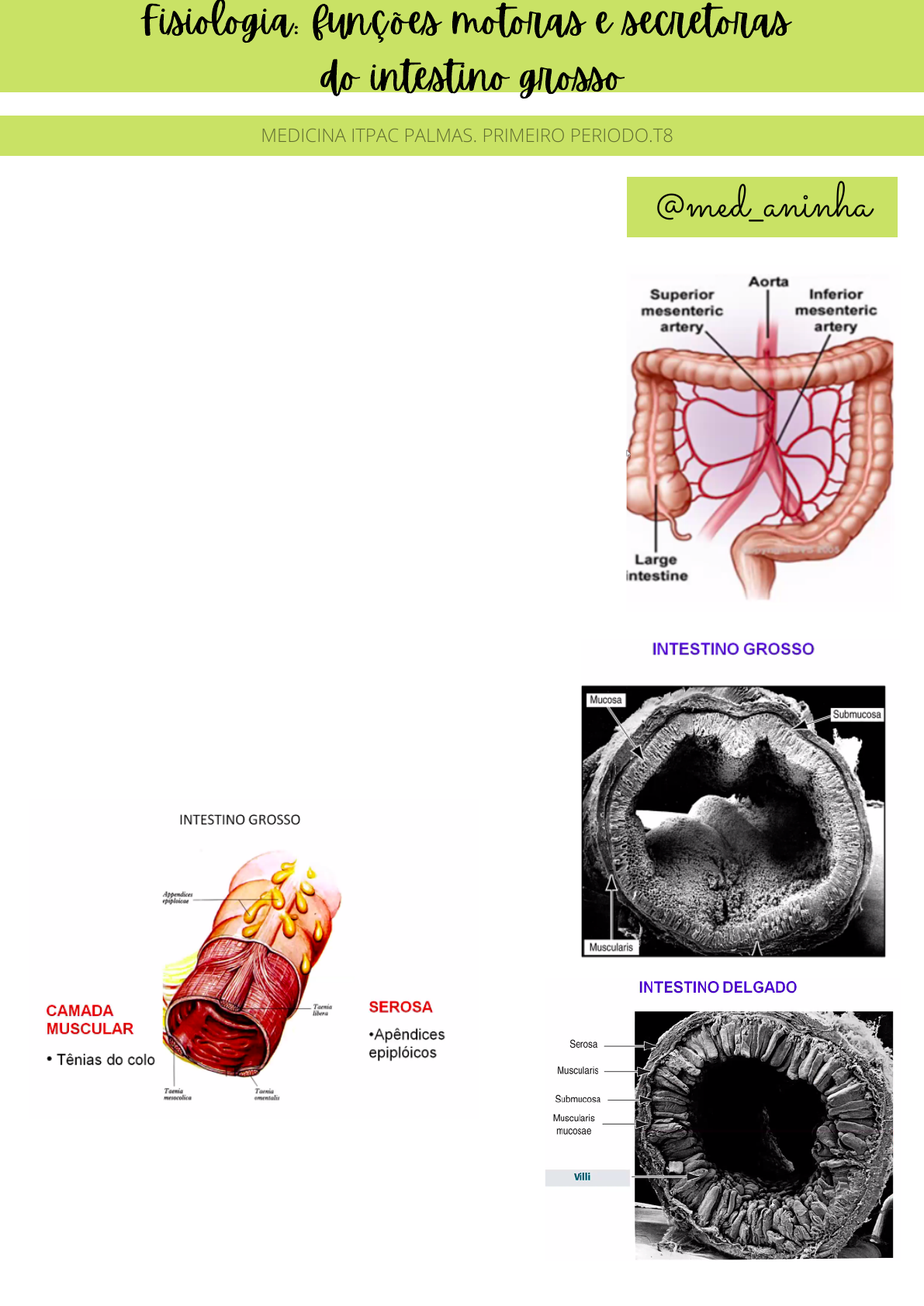 INTESTINO GROSSO Formado por varias partes, ceco, colo, colo ascendentes, descendente, irrigado pelas mesentericas superior e inferior características: area de absorção menor função de absorção é menor armazenamento funcoes: absorcao de agua e eletrolitos 1 litro de agua eliminar o conteúdo fecal reservatorio do conteudo microbiota intestinal - concentração maior acidificação-secreta muito muco Material fecal- microbiota intestinal Histologia: camadas mucosa, submucosa, muscular e a serosa. condensações da longitudinal - tenias do colo Fisiologia: funções motoras e secretoras do intestino grosso @med_aninha MEDICINA ITPAC PALMAS. PRIMEIRO PERIODO.T8 Colo- recepetores para aldesterona Microbiota Intestinal: Relação com homestasia, adquadcoes do sistema imunitario Maior concentracao: Intestino Grosso absorcao, metabolismo reservatorio de calorias função de barreira protetora desenvolvimento e regulação da imunidade Controle Neural da motilidade no intestino grosso: funcao moduladora da inervacao extrinseca simpatica- interrupcao dos movimentos colonicos parassimpatico- aumento dos movimentos colonicos plexos intramurais: controle direto da contratilidade do colon