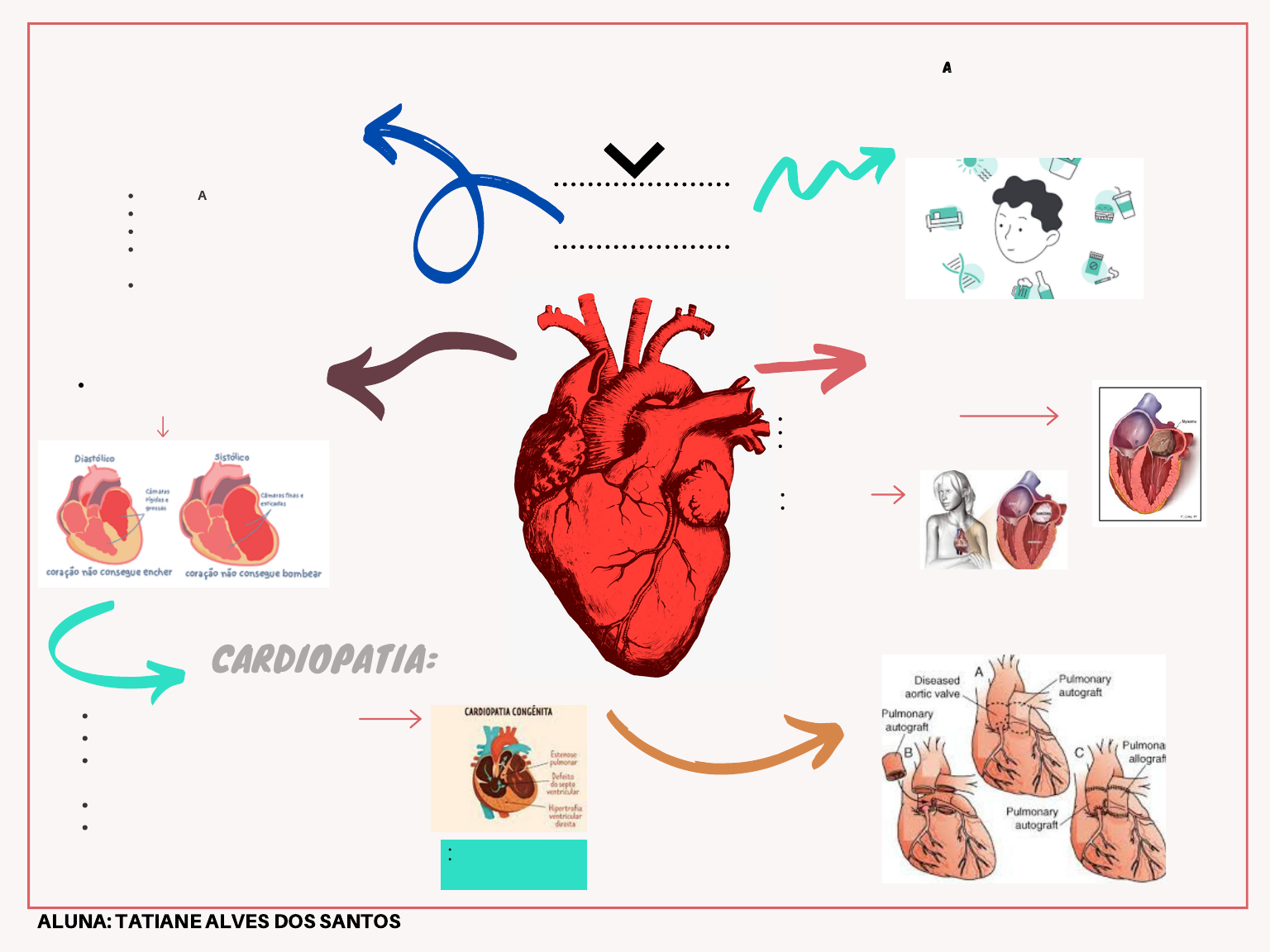 DOENÇAS CARDÍACAS Mapa Mental P A T O L O G I A C A R D Í A C AMECANISMOS PRINCIPAIS: TUMORES CARDÍACOS: CARDIOPATIA:CARDIOPATIA: Cardiopatia congênita Cardiopatia isquêmica Cardiopatia hipertensiva (pulmonar e sistêmica) Doença cardíaca valvular Doença miocárdica não-isquêmica (primária) A maioria surge da interações entre os fatores ambientais e a suscetibilidade genética. FALÊNCIA DA BOMBA OBSTRUÇÃO AO FLUXO FLUXO REGURGITANTE DISTÚRBIOS DA CONDUÇÃO CARDÍACA INTERRUPÇÃO DA CONTINUIDADE DO SISTEMA CARDÍACO Mixoma - incidência é de 75% Lipoma Rabdomioma - mais frequente em bebês e crianças BENIGNOS: Mixoma Sarcomas Mesotelioma pericárdico MALIGNOS: INSUFICIÊNCIA CARDÍACA Denominada insuficiência cardíaca congestiva (ICC) Anomalias cardíaca ou de vasos Defeitos na embriogênese semana de gestação durante a 3ª e a 8ª DOENÇA CARDÍACA VALVULAR ALUNA: TATIANE ALVES DOS SANTOS