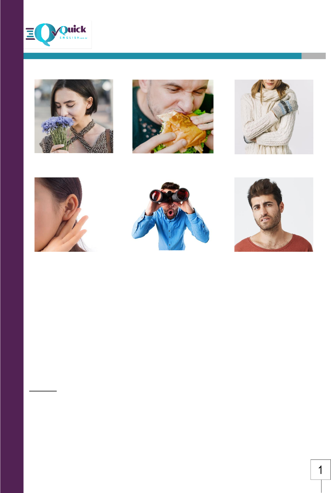 Sensory Verbs Beginner Copyright © 2020 Quick English 1 No inglês, há seis verbos de sentido para descrevermos alguma coisa ou alguém: to smell = cheirar; to taste = saborear/provar; to feel = sentir; to sound = soar; to look = olhar; to seem = parecer. Tenham em mente que estes são os verbos dos sentidos, e não os sentidos em sí; por exemplo ‘sight’ é visão, mas se usa o verbo look para descrevê-la. O verbo to seem é usado quando não sabemos se algo ou alguém é necessariamente aquilo que achamos – talvez seja, talvez não seja – por isso ‘parece’. Vejamos alguns exemplos na próxima página. To smell To taste To feel To sound To look To seem Sensory Verbs Beginner Copyright © 2020 Quick English 2 You look beautiful in this dress. Você parece bonita nesse vestido. That food smells delicious. Esta comida cheira deliciosa. She’s not sick. She feels great. Ela não está doente. Ela se sente ótima. That milk tastes sour. Aquele leite tem gosto azedo. The song sounds very nice. A canção soa muito bem. That car seems to be old. Aquele carro parece ser velho. That man seems happy. Aquele homem parece feliz. Veja que não sabemos se a pessoa está feliz ou não, por nossa percepção, ela ‘parece’ feliz. (Ele não está nos dizendo nem mostrando que está feliz). Use sounds good e sounds great quando algo for uma boa ideia. - Let's take a bus this morning. Vamos pegar um ônibus essa manhã. - Sounds good! Parece bom! - Sounds great! Parece ótimo! Lembre-se que estes verbos de sentidos são como verbos de ação, por isso, precisamos conjuga-los de acordo com o sujeito. Agora continue com os exercícios na próxima página. HAVE FUN! Sensory Verbs Beginner Copyright © 2020 Quick English 3 A. Escolha a opção certa de acordo com o contexto. 1) Her new blouse ________ really good on her. a) tastes b) looks c) smells d) feels e) seems f) sounds 2) They are very sick. They don’t ________ well. a) taste b) look c) smell d) feel e) seem f) sound 3) The song on the show ________ very bad! a) tastes b) looks c) smells d) feels e) seems f) sounds 4) The fish is old. It ________ terrible. a) tastes b) looks c) smells d) feels e) seems f) sounds 5) My beef ________ delicious. a) tastes b) looks c) smells d) feels e) seems f) sounds 6) Look! that man is smiling… is he happy? Well… he ________ happy. a) tastes b) looks c) smells d) feels e) seems f) sounds Sensory Verbs Beginner Copyright © 2020 Quick English 4 B. Marque a opção correta de acordo com a imagem. A) It looks nice. B) He looks nice. A) He tastes good. B) It tastes good. A) She sounds ok. B) It sounds ok. A) It smells bad. B) She smells bad. A) She seems happy. B) It seems happy. A) It feels good. B) She feels good. Sensory Verbs Beginner Copyright © 2020 Quick English 5 Answers A. Escolha a opção certa de acordo com o contexto. 1) Her new blouse ________ really good on her. a) tastes b) looks c) smells d) feels e) seems f) sounds 2) They are very sick. They don’t ________ well. a) taste b) look c) smell d) feel e) seem f) sound 3) The song on the show ________ very bad! a) tastes b) looks c) smells d) feels e) seems f) sounds 4) The fish is old. It ________ terrible. a) tastes b) looks c) smells d) feels e) seems f) sounds 5) My beef ________ delicious. a) tastes b) looks c) smells d) feels e) seems f) sounds 6) Look! that man is smiling… is he happy? Well… he ________ happy. a) tastes b) looks c) smells d) feels e) seems f) sounds Sensory Verbs Beginner Copyright © 2020 Quick English 6 B. Marque a opção correta de acordo com a imagem. A) It looks nice B) He looks nice A) He tastes good B) It tastes good A) She sounds ok B) It sounds ok A) It smells bad B) She smells bad A) She seems happy B) It seems happy A) It feels good B) She feels good
