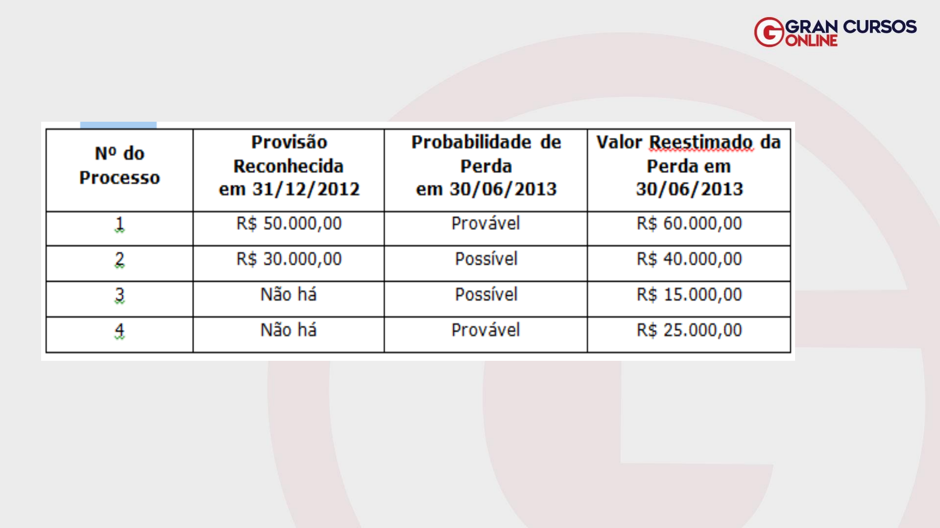 (FCC/Auditor Fiscal - SEFAZ – RJ/2014) A empresa Alpha S.A. possuía alguns processos judiciais em andamento, conforme os dados a seguir: Com base nestas informações, a empresa Alpha S.A. deve, em 30/06/2013, complementar o saldo a) das provisões constituídas para os processos 1 e 2 e constituir provisões para os processos 3 e 4. b) das provisões constituídas para os processos 1 e 2 e constituir provisão somente para o processo 4. c) da provisão constituída para o processo 1, constituir a provisão para o processo 4 e reverter a provisão constituída para o processo 2. d) da provisão constituída para o processo 1, constituir provisão para os processos 3 e 4 e reverter a provisão constituída para o processo 2. e) da provisão constituída para o processo 1, constituir provisão somente para o processo 4 e manter a provisão já constituída para o processo 2. (FGV/Contador – COMPESA/2016) De acordo com o Pronunciamento Técnico CPC 25 – Provisões, Passivos Contingentes e Ativos Contingentes, assinale a opção que indica a principal diferença entre as provisões e os passivos contingentes. (A) Os passivos contingentes são reconhecidos como passivo, enquanto as provisões não são. (B) As provisões são reconhecidas como passivo, enquanto os passivos contingentes não são. (C) As provisões são reconhecidas como redutoras do ativo, enquanto os passivos contingentes, como redutores do passivo. (D) Os passivos contingentes têm prazo para realização, enquanto as provisões não têm. (E) Os passivos contingentes utilizam estimativas, enquanto as provisões utilizam valores precisos. Questões – EPCLD (FCC/Auditor Fiscal – SEFAZ – MA/2016) Os saldos das contas do Balanço Patrimonial de uma empresa, em 31/12/2014, eram os seguintes, em reais: Fornecedores ................................................................. 30.000,00 Depreciação Acumulada .................................................. 40.000,00 Receitas Antecipadas ..................................................... 10.000,00 Estoques ...................................................................... 50.000,00 Perdas Estimadas com Clientes ....................................... 7.500,00 Caixa e Equivalentes de Caixa ......................................... 10.000,00 Equipamentos ................................................................ 200.000,00 Reservas de Lucros ......................................................... 17.500,00 Imóveis ......................................................................... 100.000,00 Contas a Pagar ............................................................... 10.000,00 Capital Social .................................................................. 350.000,00 Valores a Receber de Clientes ........................................... 105.000,00 Os diversos eventos apresentados a seguir, relacionados com os Valores a Receber de Clientes existentes em 31/12/2014, ocorreram durante o ano de 2015 e nesta ordem: − Valores a Receber de Clientes no valor total de R$ 10.000,00 foram considerados incobráveis pela empresa. − Do saldo remanescente da conta Valores a Receber de Clientes a empresa recebeu 90% em 2015 e o restante será recebido em 2016. − As vendas a prazo de 2015 que vencerão após 31/12/2015 totalizaram R$ 100.500,00. − A empresa estimou as prováveis perdas com clientes aplicando o percentual de 4% sobre o saldo da conta Valores a Receber de Clientes em 31/12/2015. No resultado de 2015 o valor total registrado de despesas relacionadas com a não realização de créditos sobre Valores a Receber de Clientes foi, em reais: (A) 4.400,00. (B) 6.900,00. (C) 6.520,00. (D) 14.020,00. (E) 14.400,00. (FCC/Analista do Tesouro Estadual – SEFAZ – PI/2015) A Cia. Vende a Prazo S.A. apresentava em seu Balanço Patrimonial de 31/12/2013 os seguintes saldos relativos às suas vendas a prazo: - Duplicatas a Receber de Clientes: R$ 500.000,00 - Estimativa para Perdas com Créditos de Liquidação Duvidosa (EPCLD): R$ 25.000,00 Em fevereiro de 2014, a Cia. Vende a Prazo S.A. foi informada de que um importante cliente não tinha condições de saldar a sua dívida no valor de R$ 20.000,00 que foi considerada incobrável. Ao reconhecer este evento, a Cia. Vende a Prazo S.A. (A) reduziu o saldo total do Ativo. (B) reconheceu uma Perda com Clientes no resultado do período. (C) creditou a conta EPCLD e debitou o Resultado do período. (D) reduziu o Patrimônio Líquido. (E) reduziu o saldo de Duplicatas a Receber de Clientes. (CESPE/Perito Criminal – Ciências Contábeis – PC – PE/2016) Com referência às perdas estimadas em crédito de liquidação duvidosa, assinale a opção correta. a) Notícia veiculada a respeito da recuperação judicial do cliente em atraso caracteriza uma perda incorrida. b) A baixa do título considerado incobrável é feita mediante lançamento contábil a crédito diretamente na conta de despesa não operacional. c) O fato de o cliente estar inadimplente junto a outras entidades não é motivo suficiente para que a dívida dele seja incluída na estimativa de perdas. d) As garantias reais não reduzem as perspectivas de perdas com contas a receber. e) A apuração da estimativa da perda dispensa a análise individual dos títulos em atraso por cliente.