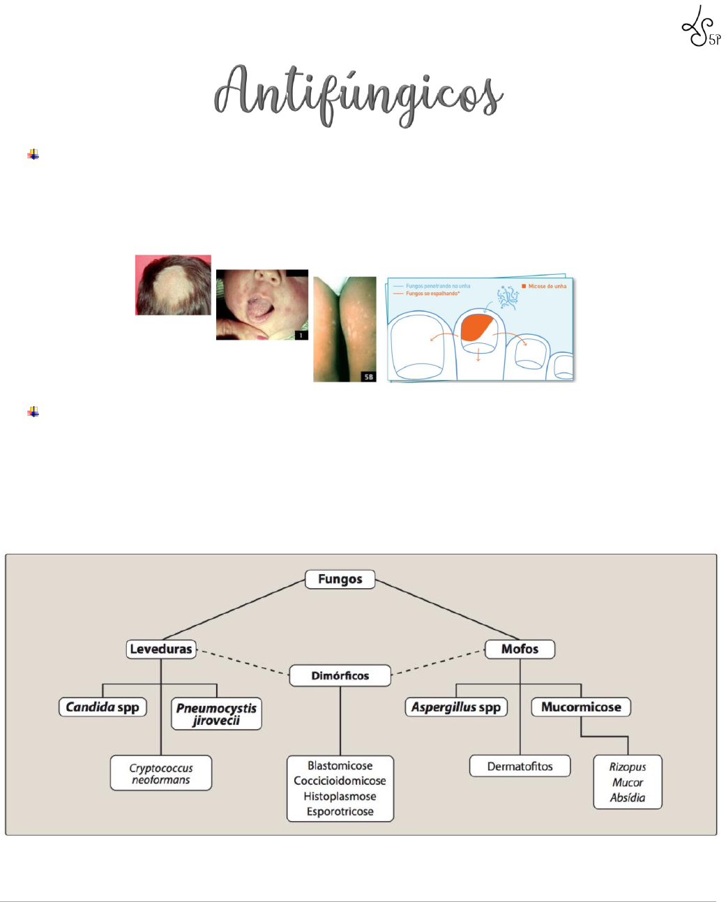 Oportunistas, se beneficiam da imunossupressão do paciente: o Atingem a pele, unha, couro cabeludo, mucosas, infecções sistêmicas (pneumonias, fungemia); o Ex: coccidioidomicose, histoplasmose, blastomicose, paracoccidioidomicose. INFECÇÕES SITÊMICAS mais comuns: o Candida; o Aspergillus; OBS.: Podem afetar neonatos e adultos, pelo uso de cateter, sonda, intubação prolongada, traqueostomia ATUAÇÃO DOS FÁRMACOS • INFECÇÕES SISTÊMICAS o Fármacos sistêmicos (oral ou parenteral) • INFECÇÕES MUCOCUTÂNEAS o Fármacos sistêmicos orais; o Fármacos tópicos MECANISMO DE AÇÃO A célula do fungo temos a parede celular que tem moléculas como, proteínas, quitinas, betaglicanos (açucares), e na região da membrana temos as beta- glicanos sintetases que vão sintetizar o beta-glicano da parede celular. Obs.: lembrando que a parede celular é o local de “estrutura” do fungo, da estabilidade, devendo ser o alvo para tentar bloquear a estabilidade do fungo. Para manter a estrutura do fungo, temos os ergosteróis (colesteróis), produzidos pelo próprio fungo Fármacos Sistêmicos Anfoter ic ina B • Disponíveis apenas pela via parenteral • Praticamente insolúvel em água • Diversas formulações foram desenvolvidas (moléculas carreadoras de fármacos) o Complexo lipídico: é uma suspensão de anfotericina B que forma um complexo com dois fosfolipídeos: L- alfa-dimiristoilfosfatidilcolina (DMPC) e L-alfa- dimiristoilfosfatidilglicerol (DMPG), na proporção de 1:1 (droga:lipídeo); o Anfotericina lipossomal: é um pó liofilizado contendo anfotericina B envolta por uma membrana lipídica • A resistência à anfotericina B ocorre quando a ligação com o ergosterol é prejudicada, quer por redução na concentração de ergosterol da membrana, quer por modificação da molécula de esterol-alvo para reduzir sua afinidade com o fármaco. MECANISMO DE AÇÃO • A anfotericina B é seletiva em seu efeito antifúngico porque explora a diferença na composição lipídica das membranas celulares de fungos e mamíferos. • A anfotericina B se liga ao ergosterol nas membranas plasmáticas das células dos fungos sensíveis. Ali ela forma poros (canais) que precisam de interações hidrofóbicas entre o segmento lipofílico do antifúngico polieno e o esterol. O poro desorganiza a função da membrana, permitindo o vazamento de eletrólitos (particularmente potássio) e pequenas moléculas, resultando na morte da célula FARMACOCINÉTICA • É quase insolúvel em água e, por conseguinte, preparada como uma suspensão coloidal de anfotericina B e desoxicolato sódico para injeção intravenosa (de forma lenta) • É mal absorvida no trato gastrintestinal. • Sua apresentação oral é eficaz apenas contra fungos dentro do lúmen do trato e não pode ser empregada no tratamento de doença sistêmica. • O fármaco encontra-se ligado em mais de 90% a proteínas séricas. Embora metabolizada em sua maior parte, um pouco da anfotericina B é excretado lentamente na urina ao longo de vários dias. • A meia-vida sérica é de aproximadamente 15 dias. • O fármaco distribui-se amplamente na maioria dos tecidos, mas apenas 2 a 3% do nível sanguíneo é obtido no líquido cerebrospinal, exigindo ocasionalmente terapia intratecal para determinados tipos de meningite fúngica. USO CLINICO • MAIS AMPLO ESPECTRO DE AÇÃO: Candida albicans; Cryptococos neoformans; Histoplasma capsulatum; • Aspergillus fumigatus; • Aspergilose invasiva: FUSARIOSE; • Candidíase disseminada: ZIGOMICOSE; • Histoplasmose: LEISHMANIOSE curânea ou visceral (avançadas / crianças e adultos); • Coccidioidomicose: CRIPTOCOCOSE; • Blastomicose: PARACOCCIDIOIDOMICOSE. • Infecções mitóticas com risco de vida; o Esquema − Tratamento inicial com Anfotericina − Terapia crônica ou prevenção com Azois. EFEITOS ADVERSOS • TOXICIDADE IMEDIADA: relacionadas à infusão o Febre, calafrios, espasmos musculares, vômitos, cefaleia e hipotensão; • TOXICIDADE CUMULATIVA: comprometimento renal o Alteração tubular renal Azóis • Os azois são compostos sintéticos que podem ser classificados como imidazois ou triazois de acordo com o número de átomos de nitrogênio no anel azólico de cinco membros, conforme indicado adiante. • IMIDAZOIS o Cetoconazol o Miconazol o Clotrimazol • TRIAZOIS o Itraconazol o Fluconazol o Voriconazol o Posaconazol MECANISMO DE AÇÃO • Os azóis inibem a C-14 α-desmetilase (uma enzima CYP450), bloqueando, assim, a desmetilação do lanosterol em ergosterol, o principal esterol das membranas dos fungos • A inibição da biossíntese do ergosterol desorganiza a estrutura e a função da membrana, o que, por sua vez, inibe o crescimento da célula fúngica. Utilizadas apenas para tratamento tópico Inibição das enzimas 14- α-esterol desmetilase Inibição das enzimas citocromo P450 humanas? Seletividade: Triazóis > Imidazóis USOS CLÍNICOS • O espectro de ação dos azóis é amplo, incluindo muitas espécies de Cândida, C. neoformans, micoses endêmicas (blastomicose, coccidioidomicose, histoplasmose), dermatófitos e, no caso do itraconazol e do voriconazol, até mesmo as infecções por Aspergillus. • Os azóis também são úteis no tratamento de organismos com resistência intrínseca à anfotericina, como o P. boydii. EFEITOS COLATERAIS • A reação adversa mais comum é o desconforto gastrintestinal • Todos provocam anormalidades nas enzimas hepáticas RESISTÊNCIA • Os mecanismos de resistência incluem mutações no gene da C-14 α-desmetilase, o que diminui a ligação dos azóis. • Adicionalmente, algumas cepas de fungos desenvolveram bombas de efluxo que bombeia o azol para fora da célula. INTERAÇÕES FARMACOLÓGICAS • Todos os azóis inibem a isoenzima hepática CYP3A4 em graus variados. • Pacientes com medicações concomitantes que são substrato para essa isoenzima podem ter aumento das concentrações 