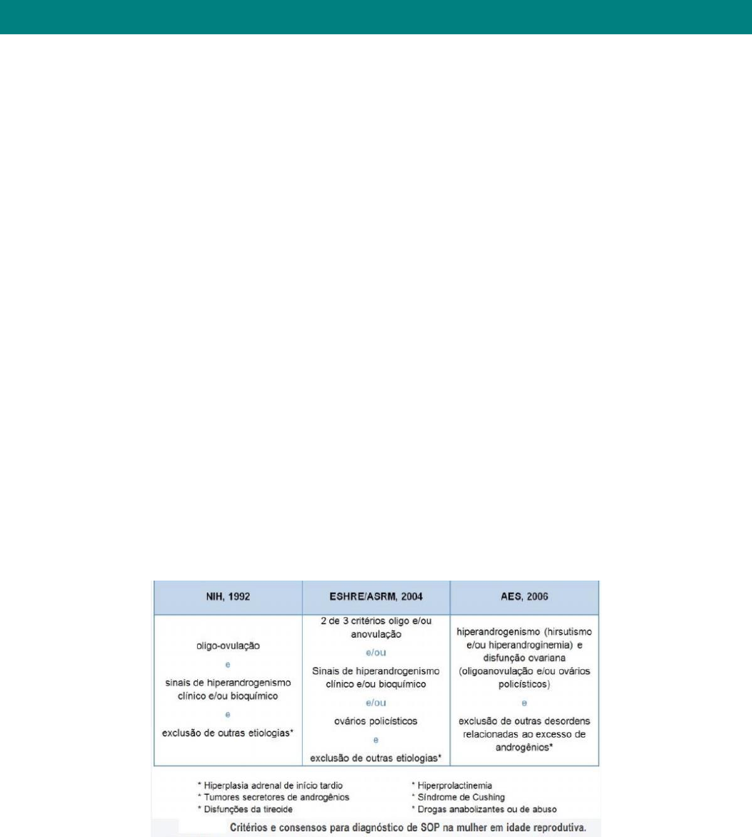 Julia Paris Malaco Síndrome dos ovários policísticos É uma endocrinopatia comum no menacme, acometendo até duas em cada dez mulheres em idade reprodutiva, dependendo da população estudada e do critério diagnóstico utilizado. Sua principal característica é o hiperandrogenismo clínico ou bioquímico, associado à disfunção menstrual e presença de ovários policísticos. A SOP reveste-se de importância não só pelas suas manifestações clínicas, mas também pelas repercussões à saúde ao longo da vida da paciente, tais como: obesidade, infertilidade, resistência insulínica, dislipidemia, diabetes gestacional, diabetes mellitus tipo 2, maior risco cardiometabólico, depressão e redução da qualidade de vida A etiologia da SOP permanece desconhecida e sua fisiopatologia é complexa e não totalmente esclarecida. A SOP parece ser de natureza multigênica, em que uma variedade de genes predisponentes e protetores interagem com fatores ambientais para produzir a síndrome A sua fisiopatologia envolve o descontrole na esteroidogênese ovariana por um defeito intrínseco nas células da teca, redução da sensibilidade à insulina, excesso de estresse oxidativo, além dos fatores genéticos e ambientais. Diagnóstico O diagnóstico da SOP na mulher em idade reprodutiva é essencialmente clínico e baseado nos sinais e sintomas, após exclusão de outras etiologias com manifestação clínica semelhante. As pacientes com SOP frequentemente apresentam distúrbio menstrual caracterizado por ciclos com intervalos maiores que 35 dias, até amenorreia secundária por vários anos, associado ao hirsutismo Segundo o consenso de Rotterdam , são necessários pelo menos dois de três critérios estabelecidos: 1 o Oligo e/ou anovulação; o Hiperandrogenismo clínico e/ou bioquímico; o Ovários policísticos; e exclusão de outras etiologias com manifestação clínica similares. O hirsutismo, quando presente, é o melhor e mais confiável marcador de hiperandrogenismo, apesar de não se correlacionar com os níveis de androgênios circulantes. O índice de Ferriman e Gallwey (IFG) modificado é o método padronizado e o mais utilizado para se avaliar a presença e a gravidade do hirsutismo. Gradua numa escala de um a quatro em nove áreas do corpo, levando-se em consideração o pelo terminal (pelo maior que 0,5 cm, escuro, pigmentado e grosso) Julia Paris Malaco Deve-se, ainda, avaliar a presença de acanthosis nigricans (alteração de coloração de pele, cinza a amarronzada escura, aveludada, saliente e às vezes verrucosa, presente em pescoço, axilas, região inguinal). Trata-se de um marcador clínico de alterações do metabolismo de glicose. A dosagem sérica de testosterona total é recomendada como avaliação de primeira linha para investigação do hiperandrogenismo. As concentrações de testosterona total variam com o gênero, índice de massa corpórea (IMC), idade, raça/etnia e durante o dia. Lembrar que o uso de medicações, como contraceptivos hormonais, metformina, cetoconazol, atorvastatina e progestágenos, podem diminuir a concentração de testosterona total O exame ultrassonográfico realizado de forma adequada avalia os ovários e afasta tumores. De acordo com o consenso de Rotterdam, os critérios ultrassonográficos para o diagnóstico de SOP incluem a presença de 12 ou mais folículos medindo entre 2 – 9 mm de diâmetro e/ou volume ovariano maior que 10 cm3. A presença de pelo menos um ovário com estas características é suficiente para o diagnóstico Em adolescentes, o diagnóstico de SOP deve ser cauteloso e sempre considerar a presença dos três critérios diagnósticos com pelo menos dois anos após a menarca. Nestas pacientes, o diagnóstico nem sempre é fácil, pois muitas características comumente observadas na mulher jovem, como a alteração do ciclo menstrual, os ovários multicísticos e a acne, podem ser eventos fisiológicos e transitórios logo pós a menarca. As alterações do ciclo menstrual são comuns na adolescente devido à imaturidade do eixo hipotálamo- hipófise-ovário. A acne é muito comum nesta faixa etária e só deve ser valorizada se estiver associada à alteração menstrual, isoladamente ela não é um bom marcador de hiperandrogenismo. A avaliação ultrassonográfica dos ovários geralmente é via abdominal na adolescente, o que dificulta a sua visualização, como também é comum a presença de múltiplos folículos durante a adolescência, o que pode dificultar o diagnóstico Alterações metabólicas: É importante ressaltar que a SOP está associada a várias alterações metabólicas e fatores de risco cardiovascular: obesidade central, resistência à insulina, dislipidemia por aumento das triglicérides e redução do colesterol de alta densidade (HDL), hipertensão arterial, intolerância à glicose, DM2, síndrome metabólica, doença renal ou vascular Recomenda-se a avaliação de risco cardiovascular em todas as mulheres com SOP. Esta avaliação inclui o IMC, medida de circunferência da cintura, pressão arterial, perfil lipídico e o Teste Oral de Tolerância à Glicose (TOTG) de 75 gramas. Mulheres com SOP desenvolvem intolerância à glicose e DM2 em idades mais jovens que o usual. A média de idade de diagnóstico DM2 em pacientes com SOP é de 24,6 anos Julia Paris Malaco Tratamento: 0 tratamento de SOP é sintomático e direcionado de acordo com a manifestação clínica, desejo de contracepção ou gestação e a presença de distúrbios metabólicos associados. As pacientes com SOP devem ser informadas que esta é uma enfermidade crônica com tratamento e seguimento por longo prazo. A meta no tratamento é reduzir os sintomas de hiperandrogenismo, regularizar o ciclo menstrual, reduzir as anormalidades metabólicas, o risco de DM2 e de doença cardiovascular, prevenir a hiperplasia e câncer de endométrio e oferecer contracepção para as que não desejam gravidez e indução da ovula