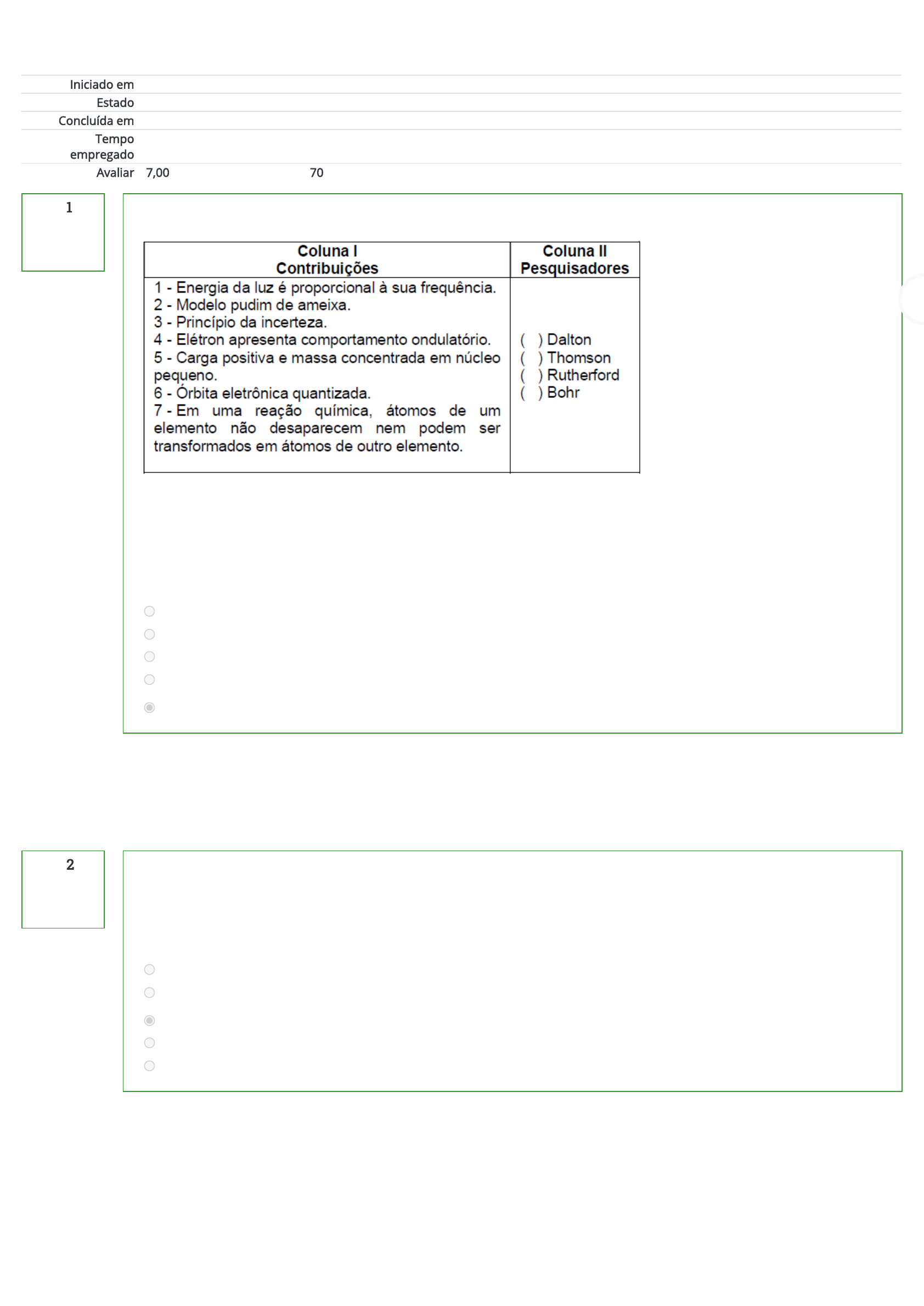 Meus cursos Química Geral Avaliações Avaliação regular Questão 1 Correto Atingiu 1,00 de 1,00 Questão 2 Correto Atingiu 1,00 de 1,00 Iniciado em Saturday, 17 Jul 2021, 11:33 Estado Finalizada Concluída em Saturday, 17 Jul 2021, 12:03 Tempo empregado 29 minutos 50 segundos Avaliar 7,00 de um máximo de 10,00(70%) Associe as contribuições relacionadas na coluna I com o nome dos pesquisadores listados na coluna II. A relação numérica, de cima para baixo, da coluna II, que estabelece a sequência de associações corretas é: Escolha uma opção: a. 7 - 3 - 5 . 4 b. 1 - 7 - 2 . 4 c. 2 - 7 - 1 . 4 d. 1 - 2 - 4 - 6 e. 7 - 2 - 5 . 6 Sua resposta está correta. A resposta correta é: 7 - 2 - 5 . 6 Assinale a alternativa verdadeira. Escolha uma opção: a. O íon hidrônio (H3O+) apresenta na sua estrutura três ligações coordenadas. b. Os compostos H2O, NH3 e CH4 são considerados iônicos. c. A reação entre Ba(s) e Cℓ2(g) produz BaCℓ2(s) (composto iônico). d. O íon amônio (NH4+) não apresenta na sua estrutura ligação coordenada. e. O sal de cozinha (NaCℓ) não é um composto iônico. Sua resposta está correta. A resposta correta é: A reação entre Ba(s) e Cℓ2(g) produz BaCℓ2(s) (composto iônico). https://ava2.ifma.edu.br/course/view.php?id=1635 https://ava2.ifma.edu.br/course/view.php?id=1635#section-4 https://ava2.ifma.edu.br/mod/quiz/view.php?id=56472 Questão 3 Correto Atingiu 1,00 de 1,00 Questão 4 Correto Atingiu 1,00 de 1,00 Questão 5 Correto Atingiu 1,00 de 1,00 Analise o texto a seguir: Na montagem de um automóvel, geralmente são usados vários metais e ligas metálicas, como, por exemplo, fer ro, na forma de aço, na lataria; cobre, nos �os elétricos; ligas de alumínio, magnésio e outros metais, nas rodas; chumbo, na bateria; níquel, nos adornos e acabamentos metálicos, entre outros. Em relação aos metais citados, é correto a�rmar que Escolha uma opção: a. o chumbo tem maior ponto de fusão do que os demais elementos. b. o cobre é menos denso do que o alumínio. c. ferro, cobre e níquel são elementos representativos e estão no mesmo período da tabela periódica. d. magnésio e alumínio estão no mesmo grupo da tabela periódica. e. o magnésio tem símbolo Mg e é o mais eletroposi tivo. Sua resposta está correta. A resposta correta é: o magnésio tem símbolo Mg e é o mais eletroposi tivo. O consumidor brasileiro já está informado de que os alimentos industrializados que ingere contêm substâncias cuja função básica é a de preservá-los da deterioração. Alguns exemplos dessas substâncias são: conservantes - ácido bórico (P.ll) e anidrido sulfuroso (P.V); antioxidante - ácido fosfórico (A.III); antiumectantes - carbonato de cálcio (Au.l) e dióxido de silício (Au.Vlll). Marque a opção que indica a fórmula de cada substância na ordem apresentada no texto. a) b) c) d) e) Escolha uma opção: a. H BO ; SO ; H PO ; CaCO ; Si O b. H BO ; SO ; H PO ; K CO ; Si O c. H BO ; SO ; H PO ; CaCO ; SiO d. H BO ; SO ; H PO ; K CO ; SiO e. H BO ; SO ; H PO ; CaCO ; SiO 3 3 3 3 4 3 2 2 4 3 3 3 2 3 2 3 3 2 3 4 3 2 3 3 2 3 3 2 3 2 3 4 2 3 3 3 2 Sua resposta está correta. A resposta correta é: H BO ; SO ; H PO ; CaCO ; SiO 3 3 2 3 4 3 2 Três mols de benzeno (C H ) contêm uma massa de: Escolha uma opção: a. 234 g b. 72 g c. 156 g d. 78 g e. 39 g 6 6 Sua resposta está correta. A resposta correta é: 234 g Questão 6 Correto Atingiu 1,00 de 1,00 Questão 7 Correto Atingiu 1,00 de 1,00 Um íon pode ser conceituado como um átomo ou grupo de átomos, com algum excesso de cargas positivas ou negativas. Nesse contexto, a distribuição eletrônica do íon pode ser representada corretamente por Escolha uma opção: a. b. c. d. e. Sua resposta está correta. A resposta correta é: 1- Linus Carl Pauling, nascido no dia 28 de fevereiro de 1901, em Portland, nos Estados Unidos, foi um dos mais importantes químicos e recebeu dois Prêmios Nobel. Estudou a vitamina C. Em 1929, foi nomeado Professor Associado e, um ano depois, Professor. Em 1930, retorna para a Europa, estuda os elétrons e constrói junto com um aluno um aparelho de difração eletrônica para estudar a estrutura das moléculas. Recebeu, em 1931, o Prêmio Langmuir por ter realizado o trabalho cientí�co mais signi�cativo realizado por um cientista com menos de 30 anos. Em 1932, mostrou a ideia de eletronegatividade e a escala de Pauling. Um de seus trabalhos mais importantes é sobre hibridização e a tetravalência do carbono. Disponível em: <http://www.soq.com.br/>. Analisando o texto, o qual conta um pouco sobre Linus Pauling, assinale a alternativa CORRETA. Dados: Escolha uma opção: a. A distribuição eletrônica para o íon possui subnível mais energético b. Analisando-se os raios iônicos do íon e do íon temos que o raio iônico do íon sódio é inferior ao raio iônico do íon magnésio c. A distribuição eletrônica de Linus Pauling ocorre em ordem decrescente de níveis energéticos. d. Os elementos sódio, cálcio e ferro são bons condutores de eletricidade, porém maus condutores de calor no estado sólido e. Caso em um laboratório faltasse o sódio para fazer um experimento, o rubídio poderia substituí-lo, pois ambos possuem propriedades químicas semelhantes. Sua resposta está correta. A resposta correta é: Caso em um laboratório faltasse o sódio para fazer um experimento, o rubídio poderia substituí-lo, pois ambos possuem propriedades químicas semelhantes. Questão 8 Incorreto Atingiu 0,00 de 1,00 Questão 9 Incorreto Atingiu 0,00 de 1,00 Questão 10 Incorreto Atingiu 0,00 de 1,00 Seguir para... Os metais formam o maior grupo de elementos químicos presentes na tabela periódica e apresentam algumas propriedades diferentes, dentre elas o raio atômico. A ordem decrescente dos metais pertencentes ao terceiro período da tabela periódica, em relação a seus respectivos raios atômicos, é Escolha uma opção: a. sódio, 