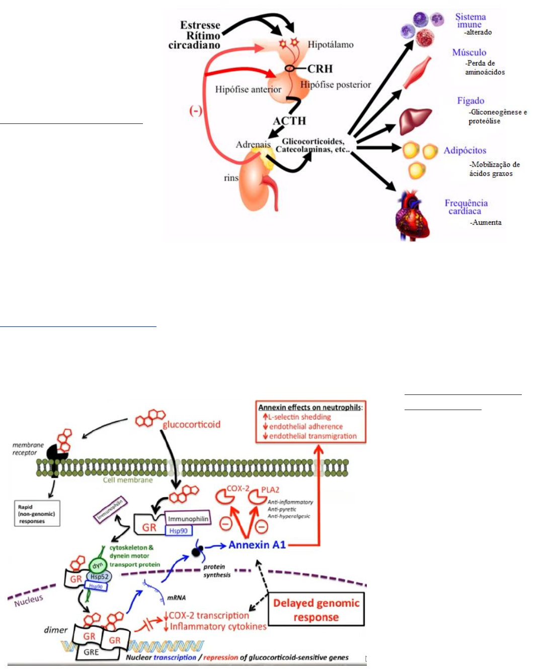 GLICOCORTICOIDES No corpo, glicocorticoides são liberados pelo córtex da glândula adrenal. Cortisol é o mais importante, e é liberado a partir do estímulo de ACTH vindo da hipófise. O cortisol se converte em cortisona, e vice-versa, com o auxílio de um NADH. Na imagem ao lado podemos perceber todo o processo de liberação dos glicocorticoides adrenais, assim como sua função e também o feedback negativo envolvido -Função dos glicocorticoides: como visto na imagem ao lado, possui várias funções. No fígado, aumenta a produção de glicose e diminui a sensibilidade à insulina. No pâncreas, aumenta a produção de glucagon e força estímulos pro-apoptóticos. Já no musculo causa proteólise. Quanto aos adipócitos, gera lipólise, pelo aumento de resistina e leptina, diminuição de adiponectina e baixa da sensibilidade à insulina. Na gestação, se houver depressão, estresse, uso de drogas, esquizofrenia, e outras circunstâncias que causem aumento de cortisol, poderá ocorrer problemas genéticos no feto, que poderão se alastrar à vida adulta na forma de ansiedade, problemas metabólicos, cognitivos, etc. -Glicocorticoides e osteoporose: a terapia de glicocorticoides aumenta moléculas próapoptóticas nos osteoblastos, diminuindo o número destes e reduzindo a formação de osso. Além disso, também causa a diminuição de osteócitos e o aumento de osteoclastos, aumentando a reabsorção óssea. Esses mecanismos levam, então, à osteoporose. -Resposta genômica dos glicocorticoides: as moléculas entram na célula e, carregadas pela dineína, vão até o núcleo celular. Lá elas conseguirão gerar resposta anti- inflamatória de duas formas: 1) diretamente, através da inibição da transcrição de COX-2 e citocinas inflamatórias; e 2) ativação da anexina A1, que também inibirá a COX-2 e outras moléculas relacionadas com a inflamação. A imagem ao lado, ilustra o processo. Na tabela abaixo há os principais corticosteroides orais e potência, dose equivalente e meia-vida de cada um. A hidrocortisona ganha destaque no tratamento de sepse severa e choque séptico. Abaixo há uma lista dos principais corticoides inalatórios. -Efeitos terapêuticos: alívio da dor, antialérgico, imunossupressão, anti-inflamatório, diminui permeabilidade dos vasos e antiemético. -Efeitos adversos: infecções, miopatias, osteoporose, linfocitopenia, úlcera péptica, afinamento da pele, hiperglicemia (diabetes mellitus), ganho de peso, retenção de liquido, aparência cushingoide, distúrbios neuropsiquiátricos (psicose, distúrbio do sono, mudança de humor, etc.), acne, estria abdominal, catarata, glaucoma e hipertensão. -Injeção de cortisona: é usada para reduzir a inflamação e dor em caso de tendinite, síndrome do túnel do carpo, bursite, artrite e outros problemas músculo esqueléticos localizados. Esses shots têm poucos efeitos adversos e também requerem mínimo desconforto de aplicação. Os contras envolvem enfraquecimento – às vezes até ruptura – de tendões, cartilagem e articulações. -Resistência aos glicocorticoides: alguns fatores que causam a resistência incluem: predisposição genética, exposição em andamento das causas da inflamação, fenômenos imunológicos que superam a ação dos glicocorticoides e distúrbios farmacocinéticos (absorção incompleta ou excreção acelerada). Abaixo, a imagem ilustra, a nível bioquímico, como acontece esse mecanismo. GR é o receptor de glicocorticoide. A tabela abaixo exibe as utilidades clínicas mais marcantes dos glicocorticoides mais recorrentes. -Síndrome de Cushing: é um dos efeitos adversos do uso crônico de corticoides. As principais características incluem ganho de peso ao redor do tronco, perda de gordura dos braços e pernas e depósito de gordura ao redor do rosto e parte superior das costas. -Miopatia: as miopatias induzidas por corticosteroides (miopatia tóxica não inflamatória) funcionam por dois caminhos: 1) mecanismo catabólico → além de induzir apoptose dos miócitos, essas drogas aumentam a proteólise das proteínas miofibrilares, desassociando a actina da miosina; e 2) mecanismo antianabólico: ocorre a inibição da síntese muscular e proteica. Além disso, corticoides com alta atividade mineralocorticoide, baixam os níveis séricos de K+ e PO4, contribuindo para o enfraquecimento muscular. Esses eventos acontecem quando a dose de corticoide excede 10mg ao dia (equivalente de prednisona), sendo estes usados por 4 semanas ou mais. As formas intravenosas e orais são as de pior cenário. Por fim, colocamos abaixo efeitos do uso de corticoide pré-natal.