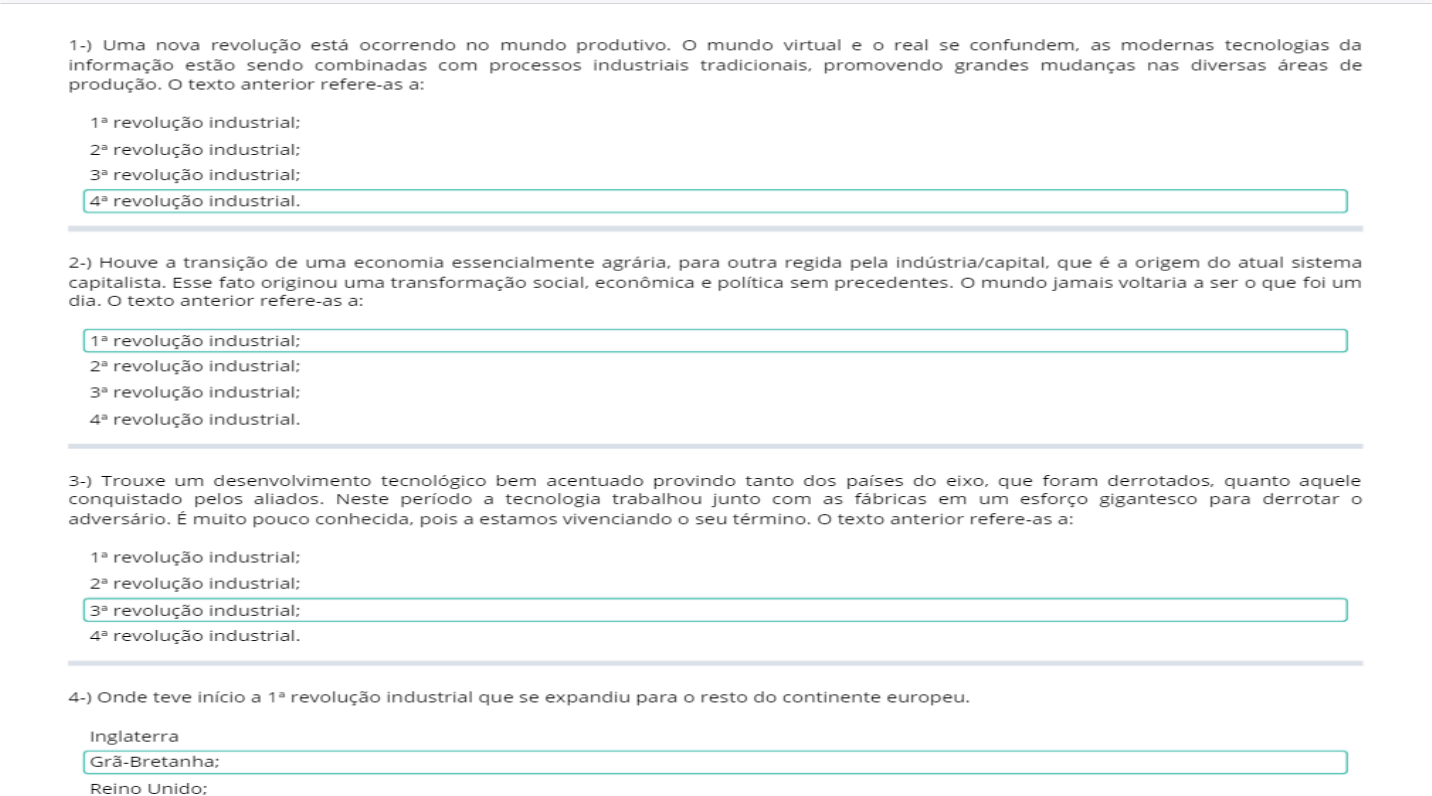 Simulado de Pessoas Nos Processos De Mudanca Simulado NzgwMDAxMTQxMDAxNjIzMTQ5OTI5 Realizado em 08/06/2021 07:49 Aluno(a) JUNIOR HONORIO DE MEDEIROS Sua nota neste simulado 60 1ª) Houve a transição de uma economia essencialmente agrária, para outra regida pela indústria/capital, que é a origem do atual sistema capitalista. Esse fato originou uma transformação social, econômica e política sem precedentes. O mundo jamais voltaria a ser o que foi um dia. O texto anterior refere-as a: 1ª revolução industrial; 2ª revolução industrial; 3ª revolução industrial; 4ª revolução industrial. 2ª) Uma nova revolução está ocorrendo no mundo produtivo. O mundo virtual e o real se confundem, as modernas tecnologias da informação estão sendo combinadas com processos industriais tradicionais, promovendo grandes mudanças nas diversas áreas de produção. O texto anterior refere-as a: 1ª revolução industrial; 2ª revolução industrial; 3ª revolução industrial; 4ª revolução industrial. 3ª) Onde teve início a 1ª revolução industrial que se expandiu para o resto do continente europeu. Inglaterra Grã-Bretanha Reino Unido Irlanda Brasil 4ª) Fatores como competitividade, cumprir novas leis ou regulamentações, introduzir novas tecnologias, atender a variações nas preferências de consumidores ou de parceiros tornaram-se parte integrante do dia a dia dos executivos. (Hernandez & Caldas, 2001). O texto acima refere-se à: Mudança organizacional; Resistencia a Mudança; Desburocratização; Nenhuma das anteriores. 5ª) Qual a situação que uma empresa decide mudar segundo (ALTAMIRO, 1999)? Por exigência do mercado; Avanços tecnológicos; Estratégia da organização; Todas as anteriores. 6ª) Uma nova revolução está ocorrendo no mundo produtivo. O mundo virtual e o real se confundem, as modernas tecnologias da informação estão sendo combinadas com processos industriais tradicionais, promovendo grandes mudanças nas diversas áreas de produção. O texto anterior refere-as a: 1ª revolução industrial; 2ª revolução industrial; 3ª revolução industrial; 4ª revolução industrial. 7ª) Segundo (BONO, 1994) a criatividade deve ser incentivada através de treinamentos que levam em conta: A vontade: técnicas e procedimentos devem corroborar para o despertar o talento criativos; Habilidade: Fundamental na hora de se ensinar as técnicas e procedimentos; Método: Programas de comprovados em sua eficiência capacitação devem ser usados para auxilio dos instrutores no cultivo do pensamento criativo. B e C estão corretas; A, B e C estão corretas. 8ª) As mudanças geram questões culturais que afetam o equilíbrio das forças dentro de uma organização (status quo). O que se causa na ocasião de ruptura desse equilíbrio quando se fala de pessoas? Inovação Fácil aceitação; Resistência Indiferença 9ª) Assinale a alternativa incorreta: a) Os planos de benefícios estão intimamente relacionados com a gradativa conscientização da responsabilidade social da organização. b) A recompensa pelos serviços prestados na atualidade se constitui somente do salário mensal. c) Um plano de benefícios sociais, geralmente, é oferecido pela empresa varejista no sentido de atender a um leque diferenciado de necessidade dos empregados. d) Ao empregador não é permitido efetuar qualquer desconto nos salários do empregado, salvo quando resultar de adiantamentos, de dispositivo de lei ou de contrato coletivo. e) Nas respectivas datas-base são ajustados, por intermédio da livre negociação coletiva, os reajustes de salários e as demais condições de trabalho. 10ª) Aprendizado organizacional não é o mesmo que aprendizado individual. Esta frase está: Errada Correta Depende do momento; Não pode ser afirmar nada.