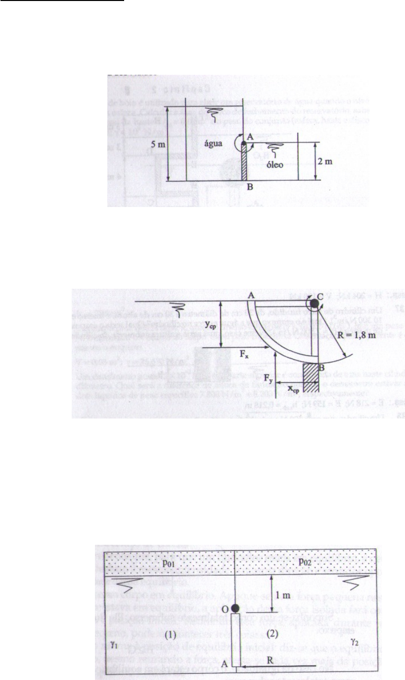 Lista de exercícios 1) A comporta AB da figura abaixo tem 1,5 m de largura e pode girar em torno de A. O tanque à esquerda contém água (γ=10.000 N/m³) e o da direita, óleo ( γ=7.500 N/m³). Qual a força necessária em B para manter a comporta vertical? (Resp:FB=50.000N) 2) Determinar o módulo e o ponto de aplicação das componentes horizontal e vertical da força exercida pela água sobre a comporta AB da figura, sabendo que sua largura é de 0,3 m, o raio é 1,8 m e a comporta está articulada em C. (Resp: Fy=7.634 N; Fx=4.860 N; ycp = 1,2 m; xcp= 0,736 m. 3) Determinar a força R que deverá ser aplicada no ponto A da comporta da figura para que permaneça em equilíbrio, sabendo que ela pode girar em torno do ponto O. 1 Dados: P01=100kPa γ1 = 10000 Ν/m³ P02=50kPa γ 2= 8000 Ν/m³ Comporta retangular com h=5 m e b = 2 m 4) Determinar a relação entre a vazão máxima e a mínima que pode ser retirada na derivação B, conforme a figura abaixo, impondo que o reservatório 2 nunca seja abastecido pelo reservatório 1 e que a mínima carga de pressão disponível na linha seja 1m.c.a. Utilize a fórmula de Hazen-Williams. Desprese as perdas de carga localizadas e as cargas cineticas. (Resp: Qmáx/Qmin=1,89) 5) Em uma tubulação horizontal de diâmetro igual a 150 mm, de ferro fundido em uso com cimento centrifugado, foi instalada em uma seção A, uma mangueira plástica (piezômetro) e o nível d'água na mangueira alcançou a altura de 4,20 m. Em uma seção B, 120 m à jusante de A, o nível d'água em outro piezômetro alcançou a altura de 2,40 m. Determine a vazão. (Resp: Q=26,51 l/s) 6) Um ensaio de campo em uma adutora de 6” de diâmetro, na qual a vazão era 26,5 l/s, para determinar as condições de rugosidade da parede, foi feito medindo-se a pressão em dois pontos A e B, distanciados 1.017 m, com uma diferença de cotas topográficas igual a 30 m, cota de A mais baixa que B. A pressão em A foi igual a 68,6 N/cm² e, em B, 20,6 N/cm². Determine a rugosidade média absoluta da adutora. (Resp: ε = 0,3 mm) 7) Determine o diâmetro de uma adutora, por gravidade, de 850 m de comprimento, ligando dois reservatórios mantidos em níveis constantes, com diferença de cotas de 17,5 m, para transportar uma vazão de água de 30 l/s. Material da tubulação, aço galvanizado com costura novo, ε = 0,15 mm. (Resp: 0,15 m) 8) Considere o escoamento permanente de água em uma tubulação retilínea de 200 m de comprimento, de um certo material, com diâmetro igual a 1/2”. Em uma seção A, na cota de 100 m, a altura d'água em um piezômetro é de 3,0 m e em uma seção B, na cota 100,5 m, a altura d'água em um piezômetro é de 2,0 m. Determine a) o sentido do escoamento; b) a vazão que escoa.(Resp: Q=0,015 l/s) OBS: suponha o regime laminar e depois verique se a hipótese está correta. 9) A ligação entre dois reservatórios, mantidos em níveis constantes, é feita por duas tubulações em paralelo. A primeira com 1.500 m de comprimento, 300 mm de diâmetro, com fator de atrito f=0,032, transporta uma vazão de 0,056 m³/s de água. Determine a vazão transportada pela segunda tubulação, com 3000 m de comprimento, 600 mm de diâmetro, e fator de atrito f=0,024. (Resp: 0,28 m³/s) 10) Dada a tubulação da figura abaixo, cuja aseção (2) está aberta à atmosfera, calcular: a) a perda de carga entre (1) e (2); b) a vazão em volume Sabendo que o escoamento é laminar Dados: peso específico da água = 9.000 N/m³, υ=0,5 x 10-3 m²/s, L1,2 = 15 cm; p1=32,8 kPa