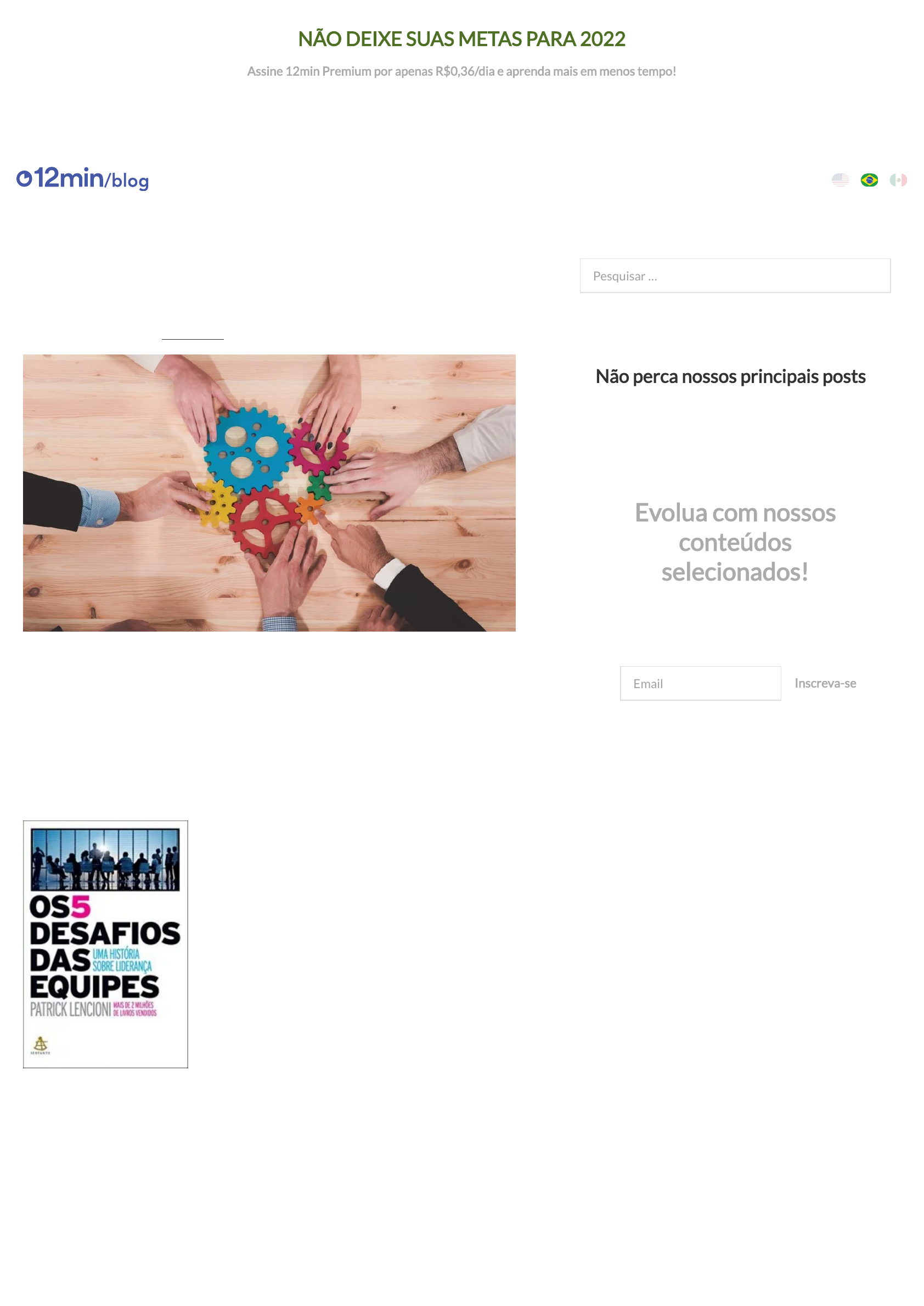 NÃO DEIXE SUAS METAS PARA 2022 Assine 12min Premium por apenas R$0,36/dia e aprenda mais em menos tempo! ATIVAR PREMIUM Resumo do Livro Os 5 Desa�os das Equipes, Patrick Lencioni, PDF Equipe 12min | Postado em 07/10/2019 8 min de leitura ⌚ Você está convidado a dar uma pausa na correria do cotidiano para re�etir sobre liderança e as cinco disfunções que desestabilizam um time. O autor do livro Os 5 Desa�os das Equipes, Patrick Lencioni é um especialista no assunto e vem apoiando empresas nos quatro cantos do planeta no caminho do crescimento. Nesse livro, que integra a sua coleção de best-sellers, Lencioni destaca que a chave para o sucesso não está na tecnologia, nas �nanças ou na estratégia. Pelo contrário, segundo ele, o maior tesouro de uma organização são as pessoas e a capacidade delas de trabalharem em equipe. Inscreva-se Não perca nossos principais posts Nenhum dado até agora. Evolua com nossos conteúdos selecionados! Seja avisado sempre que novos resumos forem lançados! ;) Pesquisar … Email 44% OFF https://go.12m.app/julho_44off https://blog.12min.com/br https://blog.12min.com/ https://blog.12min.com/br/ https://blog.12min.com/es/ https://blog.12min.com/br/author/equipe-12minutos/ https://12min.com/br/os-5-desafios-das-equipes https://go.12m.app/julho_44off Patrick Lencioni garante que um time composto por pro�ssionais fortes e que se movem na mesma direção é capaz de promover mudanças signi�cativas. Mas o que parece simples na teoria, nem sempre funciona redondinho na prática. A�nal, uma equipe é formada por pessoas imperfeitas. Então, você está interessado em saber como impulsionar a produtividade das suas equipes, evitando assim uma série de comportamentos que viciam as pessoas e prejudicam os resultados? Você pode continuar lendo Os Cinco Desa�os das Equipes aqui ou baixar o pdf ao lado. Vamos lá! Os 5 Desa�os das Equipes De acordo com Patrick Lencioni, existem 5 armadilhas naturais (que ele chama de disfunções) que impedem as pessoas a trabalharem como uma equipe. São elas: 1. Falta de con�ança 2. Medo de con�itos 3. Falta de comprometimento 4. Evitar responsabilizar os outros 5. Falta de atenção aos resultados O livro Os 5 Desa�os das Equipes a�rma que essas disfunções não podem ser avaliadas isoladamente. A�nal, uma está relacionada à outra e quando uma se manifesta há o comprometimento do trabalho em geral. Vamos, então, conhecer um pouco mais sobre cada uma dessas disfunções! Disfunção 1: Falta de con�ança “Con�ar é saber que quando um membro da equipe o pressiona, ele faz isso porque se importa com a equipe”, a�rma Patrick Lencioni. Por outro lado, garante, “equipes que não con�am desperdiçam quantidades excessivas de tempo e energia, gerenciando comportamentos e interações dentro do grupo”. https://blog.12min.com/br/melhores-ted-talks-2/ Assim, con�ança é a base de um verdadeiro trabalho de equipe. Sem ela, não há entendimento e nem cumplicidade, logo, inviabilizando o trabalho. Nesse cenário, prevalece a falta de debates e troca de ideias e experiências. De acordo com Os 5 Desa�os das Equipes, o alicerce da con�ança é construído quando as pessoas expõem suas fraquezas, faltas de habilidades, problemas interpessoais e erros. Ou seja, a única maneira de superar a falta de con�ança é passando por cima da necessidade de sermos invulneráveis. Deste modo, as pessoas põem a energia e a atenção no trabalho. O autor assegura que quanto maior a exposição frente aos outros, mais desenvolvida será a inteligência emocional, uma característica importante ao lidar com pessoas. Características de equipes com falta de con�ança Escondem suas fraquezas e seus erros uns dos outros. Hesitam em pedir ajuda ou dar feedbacks. Hesitam em oferecer ajuda a pessoas que atuam fora de suas áreas de responsabilidade. Tiram conclusões precipitadas sobre as intenções e aptidões dos outros. Não reconhecem nem exploram as experiências e habilidades uns dos outros Perdem tempo e energia controlando o próprio comportamento, para causar boa impressão. Guardam mágoas. Temem as reuniões e encontram motivos para não compartilhar algum tempo com os colegas. Características de equipes onde existe con�ança Admitem suas fraquezas e seus erros. Pedem ajuda. Aceitam perguntas e informações sobre suas áreas de responsa - bilidade. Dão uns aos outros o benefício da dúvida, antes de chegar a con - clu sões negativas. Assumem riscos, dando feedback e oferecendo ajuda. Valorizam e exploram as experiências e as habilidades uns dos outros. Investem tempo e energia em questões importantes, não em politicagens. Oferecem e aceitam desculpas sem hesitar. Anseiam pelas reuniões e por outras oportunidades de trabalho em equipe. Ferramentas do líder para facilitar a con�ança na equipe 1. Exercícios de histórias pessoais: o objetivo é estimular a empatia, a compreensão e desestimular comportamentos imprecisos. https://www.sbcoaching.com.br/blog/passos-para-aumentar-confianca-equipe/ https://respostas.sebrae.com.br/como-dar-um-feedback-efetivo/ https://blog.12min.com/br/empatia/ 2. Exercícios de e�ciência da equipe: os integrantes identi�cam a contribuição mais importante em cada um de seus colegas, assim como as possibilidades de melhorias, com foco no bem do grupo. 3. Per�s de preferência de personalidade e de comportamento: o objetivo é oferecer descrições comportamentais práticas e cienti�camente válidas dos membros de uma equipe, segundo suas diversas maneiras de pensar, falar e agir, sem qualquer julgamento. 4. Programas de feedback 360º: os membros da equipe fazem julgamentos especí�cos e críticas construtivas uns aos outros, identi�cando seus pontos fortes e fracos. 5. Exercícios experimentais em equipe: benefícios derivados de rigorosas e criativas atividades ao ar livre, envolvendo apoio e cooperação coletiva. Disfunçã
