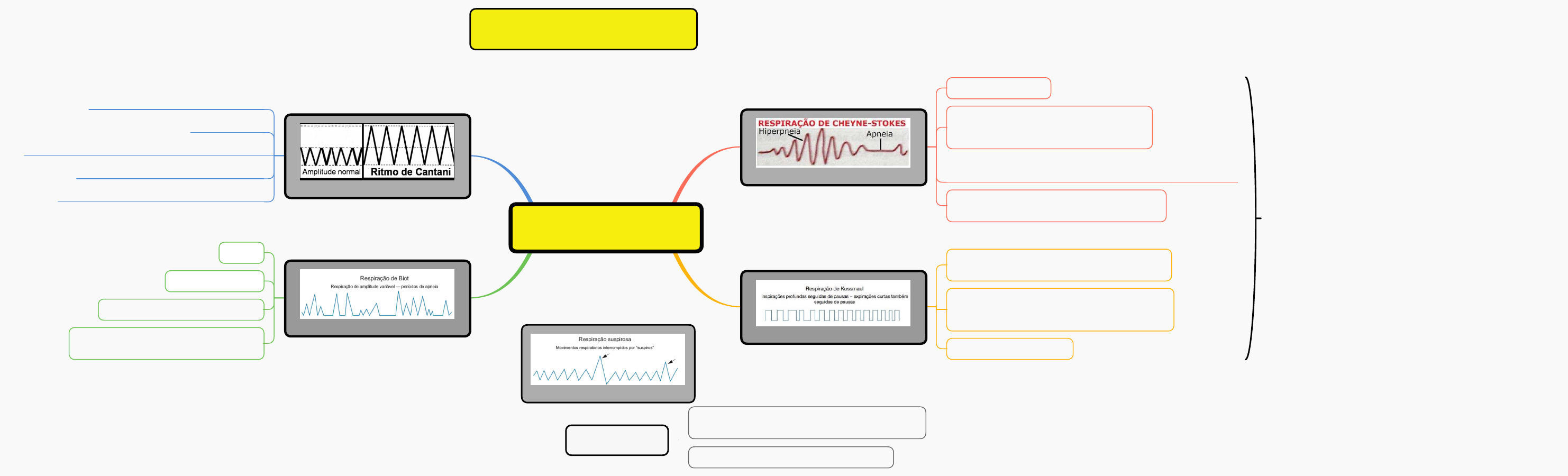 Ritmos Respiratórios Ritmo de Cheyne Stokes Periodos de Apneia geram estimulos bulbares para hiperventilação e acontece esse ritmo crescente- decrescente-apnéia Mais propensos a ocorrer durante o sono,acarretando, principalmente, a dispneia paroxistica noturna Subtópico 1 Causas:Tumores de SNC,INSUFICIENCIA CARDIACA, intoxicação(opioides) Inspiração profunda intervalada por pausas respiratórias curtas O estimulo da inspiração profunda e da hiperventilação é para compensar a acidose sanguinea-Liberando + CO2 pela expiraçao rápida e de boa amplitude Causas:Cetoacidose Diabética Anarquia Periodos Desregulados Pode ser chamada de respiração Atáxica Causas:Tumores SNC,hipertensão intracraniana, MENINGITE Aumento Grande da Amplitude Respiratória De modo regular Secundário a presença de acidose metabolica causadas por: Cetoacidose Diabética e/ou Insuficiencia Renal No decorrer da acidose,pode evoluir para Kussmaul Pressões Alveolares Ideias: PO2 104mmHg,P CO2 40 mmHg Respiração Suspirosa Presença de Inspirações suspirosas (Profundas) em meio a um ritmo respiratório normal Manifestada geralmente em disturbios psicologicos Diferença: Tá nas pausas que na 1 é mais demorada e na 2 mais breve e no ritmo evolutivo em Cheyne Stokes.