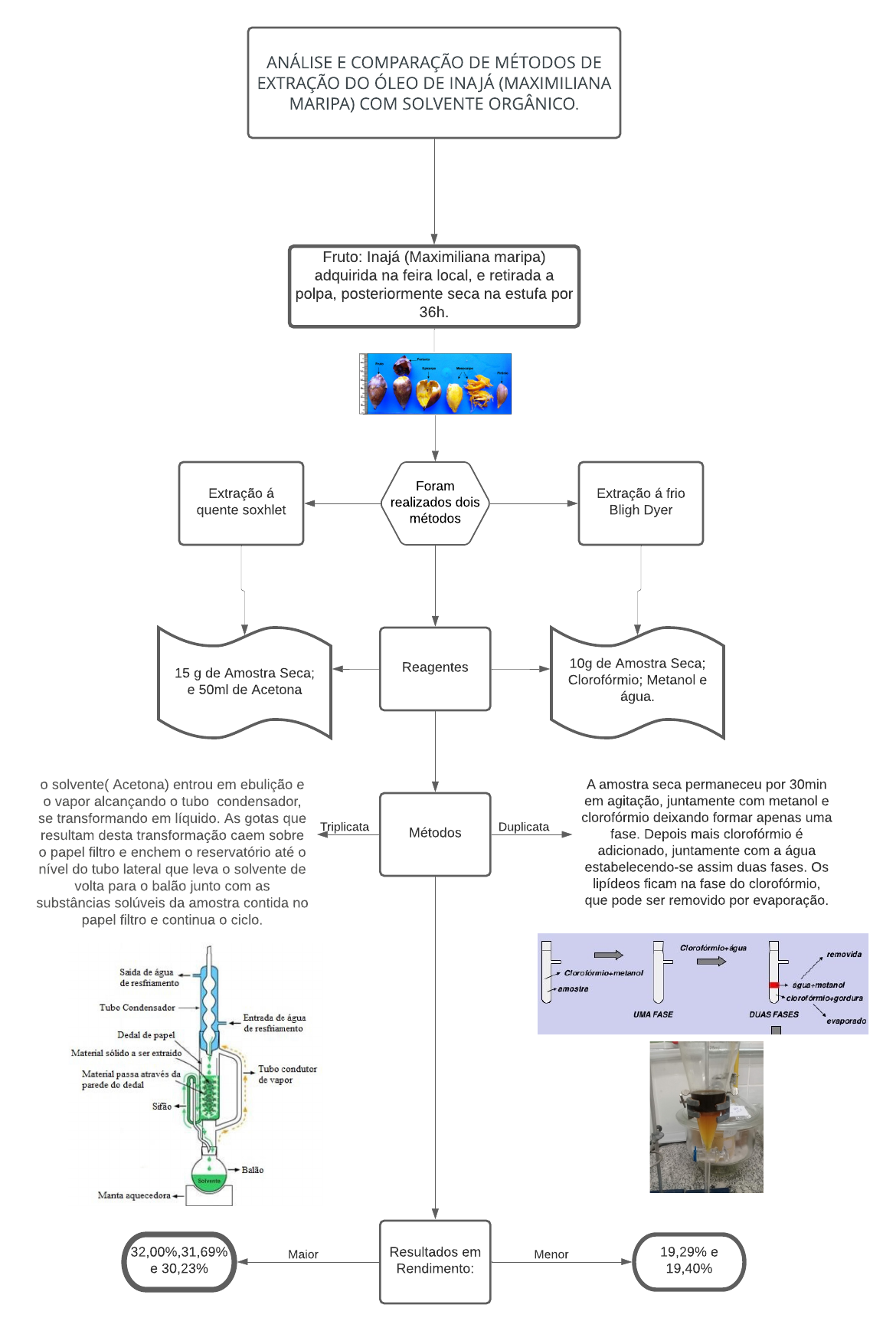 ANÁLISE E COMPARAÇÃO DE MÉTODOS DE EXTRAÇÃO DO ÓLEO DE INAJÁ (MAXIMILIANA MARIPA) COM SOLVENTE ORGÂNICO. Fruto: Inajá (Maximiliana maripa) adquirida na feira local, e retirada a polpa, posteriormente seca na estufa por 36h. Foram realizados dois métodos Extração á frio Bligh Dyer Extração á quente soxhlet 15 g de Amostra Seca; e 50ml de Acetona Reagentes 10g de Amostra Seca; Clorofórmio; Metanol e água. Métodos Duplicata A amostra seca permaneceu por 30min em agitação, juntamente com metanol e clorofórmio deixando formar apenas uma fase. Depois mais clorofórmio é adicionado, juntamente com a água estabelecendo-se assim duas fases. Os lipídeos ficam na fase do clorofórmio, que pode ser removido por evaporação. Triplicata o solvente( Acetona) entrou em ebulição e o vapor alcançando o tubo condensador, se transformando em líquido. As gotas que resultam desta transformação caem sobre o papel filtro e enchem o reservatório até o nível do tubo lateral que leva o solvente de volta para o balão junto com as substâncias solúveis da amostra contida no papel filtro e continua o ciclo. Resultados em Rendimento: 19,29% e 19,40% Menor32,00%,31,69% e 30,23% Maior Fluxograma Extração óleo Página 1