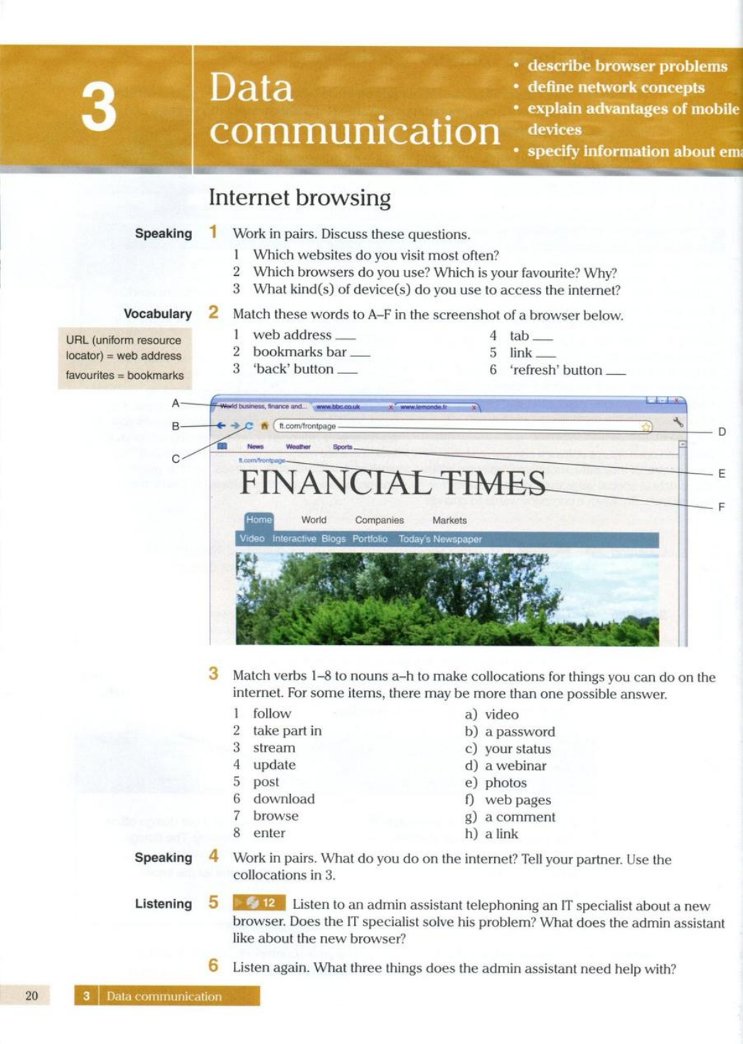 Internet browsing Speaking 1 Vocabulary 2 URL (uniform resource locator) = web address Work in pairs. Discuss these questions. 1 Vllhich websites do you visit most often? 2 W’hich browsers do you use? Which is your favourite? Vi/hy? 3 ‘What kind(s) of device(s) do you use to access the internet? Match these words to A—F in the screenshot of a browser below. 1 web address _ 4 tab _ 2 bookmarks bar_ 5 link .__ favourites _= bookmarks 3 ‘back’ button_ 6 ‘refresh’ button .._ _ —_ "U _ l A _.- Bi-I IQ!-svtfltltgritraes s - 3) .\_ D C I i i 1 n l l‘ i i I > l 3 Speaking 4 Listening 5 6 i’fi§W3rAL rates ‘ @_ - F World Companies Mantels Match verbs I-8 to nouns a-h to make collocations for things you can do on the intemet. For some items, there may be more than one possible answer. 1 follow a) video take part in b) a password stream c) your status update d) a webinari-bi.-IOl‘\J OONUIU1 post e) photos download I) web pages browse g) a comment enter h) a link Work in pairs. Wliat do you do on the internet? Tell your partner. Use the collocations in 3. m Listen to an admin assistant telephoning an IT specialist about a new browser. Does the IT specialist solve his problem? VVhat does the admin assistant like about the new browser? Listen again. Vi/‘hat three things does the admin assistant need help with? H Data coniinunication Language ' EL simple vs present continuous, stative verbs We use the present simple to talk about something we 3’ I work in an ll’ Departrnent. This week Fm managing do regularly. We use the present continuous to talk I the department because my manager is away. about an action happening now or a temporary situation. I Stative verbs (e.g. like, know, understand) describe l know how to use HTML. states rather than actions. We don't usually use the present continuous with stative verbs. j 7 Underline the present simple and circle the present continuous verbs in these sentences from 5. Why did the speaker use the tense in each case? I l’m having trouble with the new browser we’re using on our PCs. 2 I understand that now. But something else is confusing me. 8 Complete this telephone conversation between an IT help desk assistant and an employee. Use the correct present simple or present continuous form of the verbs in the box. check know not work open type in A: There’s a problem with this browser. I usually just (I) .my user ID and password and a new window (2) ‘ But it (3) ,now! B: OK, I think I (4)_lwhat the problem is. Probably your pop-up blocker is on. A: Hmm I (5)_l_ it now. Yep, you’re right. lt’s OK now. Thanks! Speaking 9 Roleplay telephone conversations for these situations. Take turns being the IT help desk assistant and the caller. Use the conversation in 8 as a model. I problem: video streaming/usually no problem/now not work solution: intemet connection problem/check the connection 2 problem: website images/usually all appear/now no pictures solution: leave ‘Automatically load images’ unchecked 3 problem: often visit this website/now error message solution: enter ‘www’ in the web address, not ‘wwww’ Listening 10 Listen to part of a telephone conversation. Complete 1-5 with the correct symbols from the web address the speaker dictates. Ejbmard gash = www.d-o-socialwork.gov.ae/schools_2.htmI?72 gash = stroke l dash _ 3 slash _. 5 question mark _ 2 dot _ 4 underscore __ 11 m Listen to part of a telephone conversation. Which web address does the speaker dictate? 1 www.agamy.com/search/results_78.aspx?p 2 www.agamy.corri/search/results/78.aspx-p 3 www.agamy.com/search/results_78.aspx-p Speaking 12 Work in pairs. Student A, look at the information on page 68. Student B, look at the information on page 70. Follow the instructions. Daita coiniiiunicalion H Networks Speaking 1 Work in pairs. Ask and answer these questions. PIN = personal 1 What computing devices do you use in your daily life (e.g. ATMs)? identification 2 Do you think they are on a network? Is it wired or wireless? number 3 Are these devices secure? Vtlhat security features do they have (e.g. a PIN)? Heading 2 Read this web page. Match the paragraphs (1-3) to these points. a) types of software and devices on networks __ b) the main types of networks _ c) the arrangements of computers in networks _ '.1 j -' ' - - ' ' H 1 _- - lI|i....--.... . i . . s What is a network? A network is a group of linked computers or other cable which is lieda bus, and each computer is devices. There are two kinds of networks that are linked to it. Some large networks use a mesh. in this, in common use. In Local Area Networks (LANs) each computer is linked to several others. This has computers are close together - perhaps in the same one big advantage: if one connection breaks, the data 5 building. They might be connected directly to each 20 can use other connections. Therefore, it is difficult to other by cable or through a wireless network such as break a mesh network. "'*‘1'fi- 1" °°"1'as1= wide 3'93 "91’”°rk9 (W-ANS) °°’“’e" Many networks work on a client—server system. In . a larger area and usually use telephone lines or a th;s_ sewers are spec;a| compute,-S that store data e mobile P110119 Sllsifi-‘"1 til °°""9°i- A |-AN ca" be 3 serve websites and have other similar functions. "1 P3" °f 3 WA“ as Generally, a client program will ask the server for There are different types of wired networks. One is a data and the server will than send the data back star system. In this, each computer (or other device) to the client. For example, when you type a web is connected to a central server. Another type is a ring address into a browser, the browser (the client) will system. This is a network that has each computer ask the server for a web page, which then sends the 15 linked to two others. in a bus systerri there is a central so web page back. ' - -=- -. . .: 1,__-_ ---;.-- -_"-' -_ -'-...'3:.--.'=__'-,==- F-I -2-- (Li-jljj :_-;"- "3-j-:-1=ee"':_:-"