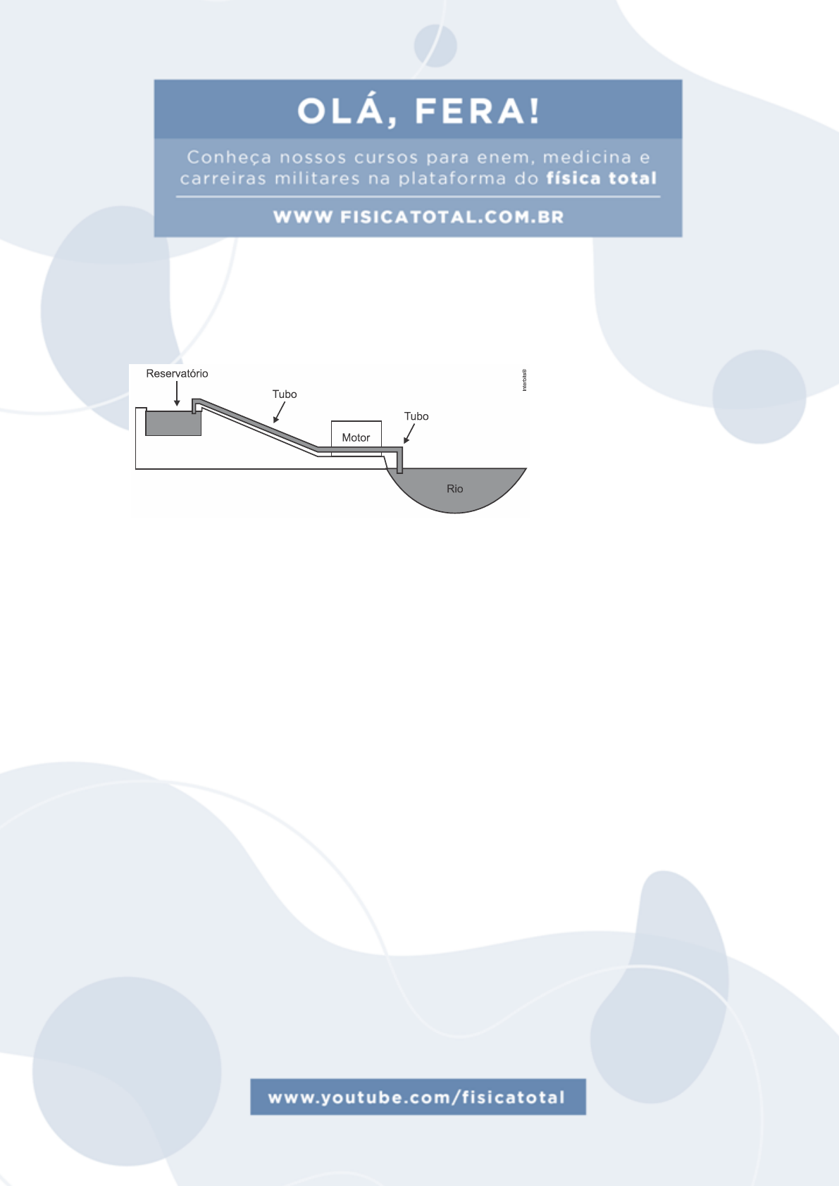 ENEM PPL 2020 Um agricultor deseja utilizar um motor para bombear água (dÁGUA = 1 KG.l -1) de um rio até um reservatório onde existe um desnível de 30m de altura entre o rio e o reservatório, como representado na figura. Ele necessita de uma vazão constante de 3.600 litros de água por hora. Considere a aceleração da gravidade igual a 10 m.s-2. Considerando a situação apresentada e desprezando efeitos de perdas mecânicas e elétricas, qual deve ser a potência mínima do motor para realizar a operação? a) 1,0 x 101 W. b) 5,0 x 101 W. c) 3,0 x 102 W. d) 3,6 x 104 W. e) 1,1 x 106 W. COMENTÁRIO DA QUESTÃO A partir do que é dito no texto, temos: dÁGUA = 1 kg/L que, em unidade S.I., vale dÁGUA = 10 3 kg/m3 z = 3.600 L/h em unidades S.I., vale z = 3.600 x 10-3/3600 = 10-3 m3/s h = 30m g = 10 m/s2 A potência útil, P, é dada pela razão entre a energia potencial gravitacional adquirida ( variação da energia mecânica ) pela água e o intervalo de tempo para ocorrer essa variação t Hgm P .. , como d = m/g , temos que m = d.V t HgVd P ... , como z = V/t, temos que: HgzdP ... Daí: 30101010 33 P 300P WP 2103 A partir do explicado acima, temos que o gabarito é a alternativa [c].