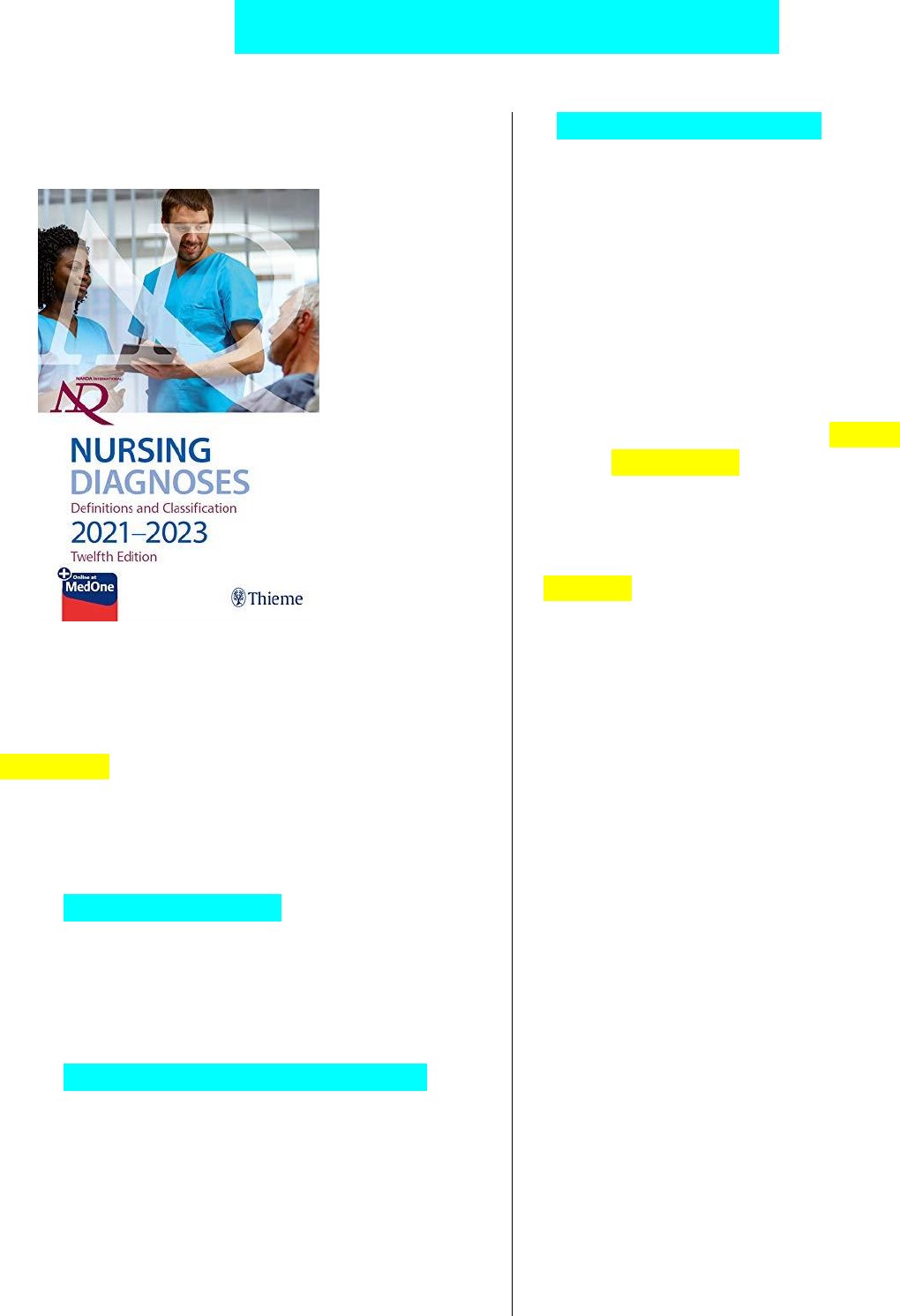 Diagnósticos de enfermagem da Nanda Como utilizar a Nanda? Já está disponível a Nanda de 2021 -2023. ESTRUTURA: TITULO+ FATOR RELACIONADO + CARACTERISTICA DEFINIDORA; SÃO DIVIDIDOS EM 3 TIPOS: DIAGNÓSTICO DE RISCO: DIAGNÓSTICO DE RISCO (TÍTULO) EVIDENCIADO POR Fator de risco. EX: Risco de glicemia instável EVIDENCIADO POR estresse excessivo. DIAGNÓSTICO DE PROMOÇÃO DA SAÚDE (Pra você saber se é um diagnóstico de promoção da saúde no título sempre vai ter MELHORADO): DIAGNÓSTICO (TÍTULO) EVIDENCIADO PELA CARACTERISTICA DEFINIDORA. EX: Disposição para controle da saúde melhorado EVIDENCIADO POR expressar desejo de melhorar a condição de vacinação. DIAGNÓSTICO DE PROBLEMA: DIAGNÓSTICO(TÍTULO) RELACIONADO A FATOR RELACIONADO CONFORME EVIDENCIADO CARACTERISTICA DEFINIDORA. EX: Amamentação interrompida RELACIONADO A necessidade de desmame abruptamente o lactante CONFORME EVIDENCIADO por amamentação não exclusiva. OBS: Alguns diagnósticos vão ter fatores relacionados ou de risco A serem desenvolvidos, quando tiver isso você tem que colocar algum fator relacionado segundo o seu caso, não pode ser diagnóstico médico. Vamos lá? 1. Primeiro de tudo você como aluno(a) ou enfermeiro(a) deve ter feito uma anamnese e exame físico bem detalhado para encontrar os achados daquele paciente. 2. Feito isso você deve saber o que o seu paciente está precisando e assim ir no Nanda pesquisar. 3. Vá no Sumário primeiro e na Parte 3, que é a parte do diagnóstico de enfermagem da Nanda international. Nessa parte vai ter todos os diagnósticos com seus domínios e classe. 4. A Nanda é constituída por 13 domínios. Vai da página: 26 á 40. 5. Na Sae sempre coloque o DOMINIO E CLASSE que você pegou esse diagnóstico. 6. Agora observe qual é o diagnóstico que se encaixa com o seu caso. 7. Como colocar na Sae: Primeiramente você vai atrás das Diagnoses (todos os diagnósticos encontrados na Nanda referente ao seu paciente). EX 1 : Envolvimento em atividade de recreação diminuído relacionado à desconforto físico conforme evidenciado por alteração do humor. DOMINÍO 1, CLASSE 1. EX 2 : Risco de síndrome do idoso frágil conforme evidenciado por ansiedade. DOMINÍO 1, CLASSE 2. Esse é o modelo que eu coloco tanto no trabalho no Word como no trabalho no slide. 8. Agora vamos procurar o diagnóstico de enfermagem prioritário. O diagnóstico prioritário vai ser aquele que é necessidade maior do paciente e não o que a gente como enfermeiro quer fazer primeiro. Feito isso você já termina a parte da Nanda. Algumas professoras pedem só um diagnóstico prioritário e outras pedem 3. PROXIMO PASSO É O NOC. Classificações dos resultados de enfermagem(NOC) COMO UTILIZAR O NOC? 9. Para você procurar no NOC primeiramente tem que saber qual resultado que deve ser utilizado com o seu paciente. 10. Vá na parte III: Resultados. –pagina 05 11. Nessa parte vai ter todos os resultados existentes e você tem que encontrar aquele que se encaixa com seu paciente. 12. Se o meu paciente o diagnóstico de enfermagem dele foi padrão respiratório ineficaz relacionado a fadiga da musculatura respiratória conforme evidenciado por taquipneia, logo eu tenho que achar algo relacionado a isso. 13. O achado foi ESTADO RESPIRATÓRIO. 14. MONTAGEM: Coloco o título: Padrão respiratório ineficaz. Definição; Graduação dos resultados; Manter em; Aumentar para; Indicadores: não é preciso colocar todos; Só aqueles que se encaixa com o seu paciente. CLASSIFICAÇÃO DAS INTERVENÇÕES DE ENFERMAGEM. COMO UTILIZAR O NIC? OBS: O NIC vai ser utilizado na SAE para os diagnósticos prioritários. 15. Vá no sumário na Parte Seis (LIGAÇÕES ENTRE AS INTERVENÇÕES DA NIC E OS DIAGNÓSTICOS DA NANDA-1). Pag :24. 16. Nessa parte você vai encontrar a ligação do Nic com os diagnóstico da Nanda em ordem alfabética. 17. Veja agora qual é o título do seu diagnóstico de enfermagem prioritário e procure ele no NIC. 18. Encontrei o Padrão Respiratório ineficaz, clique nele. 19. Vai direto para essa página da foto abaixo. 20. Você vai encontrar todas as intervenções que pode ser realizada de acordo com o seu caso. 21. Agora você tem que encontrar aquela que se encaixa. 22. Encontrando essa parte agora você tem que saber que intervenção se encaixa com o seu diagnóstico. 23. Escolhie o Monitoração respiratória. 24. Depois de ter feito isso você vai na parte três que é a classificação- fica na página 147. 25. Nessa parte por ordem alfabética tem todas as intervenções em ordem que você vai fazer no seu paciente com definição e atividades. 26. Agora você vai encontrar a definição MONITORAÇÃO RESPIRATÓRIA. 27. Agora você encontra aqui toda as atividade que você pode fazer com o seu paciente. 28. Como eu coloco na SAE: Eu sempre coloco o diagnostico em cima. Depois venho com a intervenção. Coloque o título da sua intervenção+ definição+ atividades. FAÇA ISSO PARA CADA DIAGNÓSTICO PRIORITÁRIO QUE VOCÊ COLOCOU. Na parte do nic elas também pedem que você coloque o que foi feito na prática em relação a cada atividade que foi escolhida. CONSTRUÇÃO DA SAE: 1. Introdução: Sempre pegue referencias de artigos e livros. Pegue artigos de 5 anos pra cá. Se pegar citação de artigos ou livro coloque no final. (Sobrenome do autor, ano). Dados epidemiológicos podem ser encontrados em site do ministério da saúde e também em artigos . Faça a mesma coisa sempre no final colocar: Sobrenome do autor, ano. 2. Referências no final: Normas da ABNT. Referência bibliográfica de livros: Livro que tenha apenas um autor: SOBRENOME, Nome. Título: subtítulo (se houver). Edição (se houver). Local de publicação: Editora, ano de publicação da obra. Livro com até três autores: SOBRENOME, Nome; SOBRENOME, Nome; SOBRENOME, Nome. Título: subtítulo (se houver). Edição (se houver). Local: Editora, ano de publicação. Livro com mais de três autor