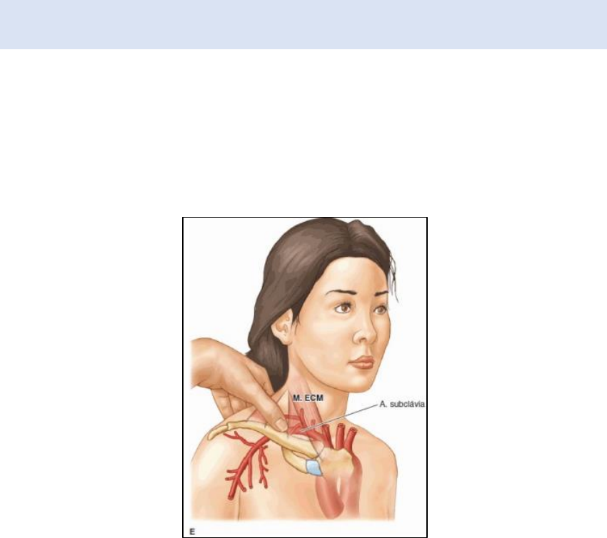 Estrutura superficiais do pescoço Músculos esternocleidomastóideo (ECM) e trapézio: Os músculos ECM e trapézio têm em comum a origem embriológica, a inervação pelo nervo acessório (NC XI), o revestimento pela lâmina superficial da fáscia cervical, uma fixação superior linear à base do crânio e uma fixação inferior ao cíngulo do membro superior. Suas massas superficiais e margens palpáveis são a base para descrever as regiões do pescoço. O músculo ECM produz vários movimentos da cabeça e do pescoço. O músculo trapézio faz múltiplos movimentos da escápula, consoante à ação uni ou bilateral dos músculos e independente ou em conjunto com a contração concêntrica ou excêntrica de outros músculos. Região cervical lateral: A região cervical lateral é limitada pelos músculos ECM e trapézio e terço médio da clavícula, com um assoalho muscular formado pelos músculos cervicais profundos laterais. É subdividida pelo ventre inferior diagonal do músculo omo- hióideo. A metade inferior da veia jugular externa é mais visível no trígono occipital superior. O nervo acessório (NC XI), que ocupa posição superficial, é o mais importante do ponto de vista clínico. No trígono omoclavicular inferior, muito menor, o plexo braquial emerge entre os músculos escalenos médio e anterior, este último cruzado anteriormente pelo nervo frênico. Superiormente ao plexo braquial, e no mesmo plano, mas profundamente ao músculo ECM, está o plexo cervical. Os ramos cutâneos desse plexo emergem do ponto médio da margem posterior do músculo ECM e se irradiam em direção ao couro cabeludo, orelha, região anterior do pescoço e ombro. Região cervical anterior: A região cervical anterior situa-se inferiormente ao corpo da mandíbula, estendendo-se anteriormente do músculo ECM até a linha mediana. Os ventres do músculo digástrico, o ventre anterior do músculo omo-hióideo e o hioide subdividem a região em trígonos menores.O trígono submentual situa-se superficialmente ao assoalhoda boca. O trígono submandibular, superior aos ventres do músculo digástrico, é ocupado pela glândula salivar submandibular e pelos linfonodos submandibulares. A artéria facial, que segue dentro desse trígono, é palpável quando emerge dele e cruza o corpo da mandíbula.O trígono carótico, entre o ventre posterior do músculo digástrico, o ventre inferior do músculo omo-hióideo e o músculo ECM, inclui grande parte da bainha carótica e estruturas relacionadas, entre elas a bifurcação da artéria carótida comum, o seio e o glomo caróticos, além dos primeiros ramos da artéria carótida externa. O trígono muscular é formado e ocupado pelos músculos infra-hióideos.