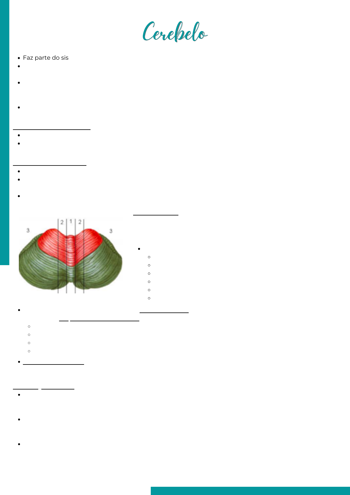 CerebeloCerebelo Faz parte do sistema nervoso central; Situado posteriormente ao tronco encefálico e inferiormente à região posterior do cérebro, repousa na fossa cerebelar do crânio; Ligada ao tronco encefálico por pedúnculos: pedúnculo superior liga o cerebelo ao mesencéfalo e traz axônios eferentes, pedúnculo médio liga cerebrlo à ponte e leva axônios eferentes, o pedunculo inferior liga o cerebelo ao bulbo e teem axonios aferentes e eferentes Modula a função motora coordenando os movimentos, regulando o equilíbrio o tônus muscular e mantendo a postura Baseada no desenvolvimento do homem; A primeira fissura a surgir é a lateral, que separa o lobo flóculo-nodular e a segunda a fissura prima, que separa os lobos anterior e posterior Arquicerebelo = vestibulo cerebelo: relacionado ao equilíbrio, corresponde ao lobo flóculo-nodular Paleocerebelo = espino cerebelo: controla o tônus e mantém a postura adequada, corresponde ao lobo anterior Neocerebelo = cerebro cerebelo: controla os movimentos finos e corresponde aos outros hemisférios do cerebelo DIVISÃO ONTOGENÉTICA: DIVISÃO FILOGENÉTICA: Verme (medial); Zona Intermediária Zona Lateral Dividido em: Lobo anterior; Fissura primária; Lobo posterior; Fissura póstero-lateral; Lobo flóculo nodular; Vermis HEMISFÉRIOS: 1. 2. 3. Substância cinzenta externa forma o córtex cerebelar, enquanto intermanete há a substância branca formando o corpo medular do cerebelo, neste, está localizados 4 pares de núcleos: Núcleo fastigial: localizado próximo ao plano mediano; Núcleo globoso; Núcleo emboliforme; Núcleo denteado: maior dos núcleos, localizado mais lateralmente Lesões no cerebelo: perda de coordenação dos movimentos com efeitos sobre a postura e o tônus muscular, não afetam percepção proprioceptiva, funções corticais superiores e não causam paralisia. Camada molecular: formada por fibras de diração paralela, contém as células estreladas e as células em cesto, sendo que as últimas apresentam sinapses axossomáticas dispostas em torno do corpo das células de Purkinje, como um cesto. Camada de células de Purkinje: células piriformes e grandes dotadas de dendritos que se ramificam na camada molecular e um axônio que sai em direção oposta terminando nos núcleos do cerebelo onde exercem ação inibitória; Camada granular: células pequenas por terem o citoplasma reduzido, compreendem vários dendritos e um axônio que atravessa a camada das células de Purkinje, nesta camada também exitem as células de Golgi com ramificações amplas CITOARQUITETURA: Fibras trepadeiras: situadas no complexo olivar inferior, são glutamatérgicas e terminam enrolando-se em torno dos dendritos das células de Purkinje, sobre as quais exerce função excitatória Fibras musgosas: Representam a terminação dos demais feixes de fibras que penetram o cerebelo, são glutamatérgicas, e ao penetrar o cerebelo emitem ramos colaterais que fazem sinapse excitatórias com os neurônios dos núcleos centrais. Impulsos penetram o cerebelo pelas fibras musgosas, ativando sucessivamente os neuronios dos núcleos centrais, as células granulares e as células de Purkinje (as quais inibem os neuronios dos núcleos centrais), deste modo, as informações chegam aos núcleos centrais de onde sairão as respostas eferentes; A atividade é modulada pela ação inibitória das células de Purkinje através da liberação de GABA, portanto, as células de Purkinje recebem sinapses das fibras trepadeiras diretamente e as projeta para os núcleos centrais Função: modular a intensidade e ritmo de saíde dos impulsos eferentes do cerebelo que vão influenciar os diferentes níveis da motricidade Aferência: fibras pontinas (núcleos da ponte), córtex frontal, parietal e occipital; Eferência: núcleo dentado à tálamo à córtex motor Lesão: ataxia, diminuição do tônus muscular, distúrbios de planejamento motor (tremor de intenção, dismetria e disdiadococinesia); Aferência: trato espinocerebelar anterior e posterior, recebe sinais sensoriais e somáticos; Eferência: núcleo do interpósito à núcleo rubro ou tálamo do lado oposto Lesão: ataxia, marcha instável, cambaleante e oscilante, erros de execução motora; Aferência: núcleos e sistema vestibular, importantes para manutenção do equilíbrio e postura Eferência: para núcleos vestibulares Lesão: ataxia troncular e base alargada Manutenção do equilíbrio e postura: promove contração adequada dos músculos, transmitindo sinapses pelos neurônios motores dos tratos vestibuloespinais Controle do tônus muscular: núcleos dentado e interposto mantém atividade espontânea, atividade que age nos neuronios motores das vias laterais Controle de movimentos voluntários: envolve a etapa de planejamento do movimento e correção do movimento já em execução Aprendizagem motora: através das fibras olivocerebelares que chegam ao córtex como trepadeiras e fazem sinapse com as células de Purkinje modulando sua excitabilidade; Funções não motoras: participa de funções cognitivas, como resolver quebra-cabeças, associar palavras, resolver mentalmente operações matemáticas e reconhecer figuras complexas. Instabilidade postural, estática e dinâmica; Retardo do ínicio e do término das ações motoras; Incapacidade de efetuar movimentos contínuos e repetidos; Erros na regularidade da direção dos movimentos – dismetria; Falta de coordenação ou de sinergia dos movimentos – decomposição; Falta de aprendizado motor CIRCUITO CEREBELAR BÁSICO: CEREBRO-CEREBELO: ideia do movimento ESPINO-CEREBELO: correção do movimento em execução VESTIBULO-CEREBELO: lobo flóculo nodular FUNÇÕES: DISFUNÇÕES: