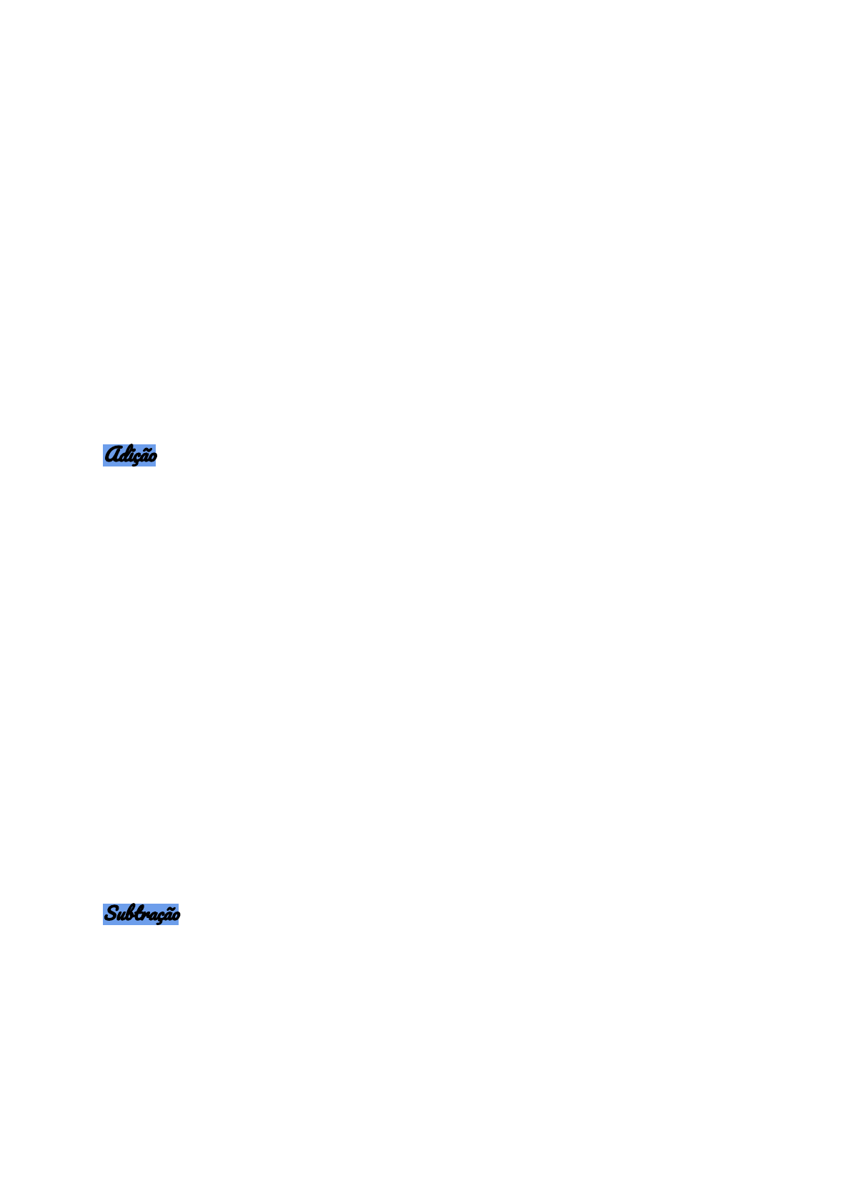 Polinômi�� → Polinômios: expressão que possui letras e números. ● 1 termo: monômio ● 2 termos: binômio ● 3 termos: trinômio ● 4 ou + termos: polinômio Ex.: x² + 3x - 1 = 1²+ 3. 1-1= 1+3-1= 3 → valor número Adiçã� Para a adição entre dois polinômios, vamos realizar a redução dos monômios semelhantes. Dois monômios são semelhantes se eles possuem partes literais iguais. Quando isso acontece, é possível simplificar o polinômio. Exemplo: Seja P(x) = 2x² + 4x + 3 e Q(x) = 4x² – 2x + 4. Calcule o valor de P(x) + Q(x). 2x² + 4x + 3 + 4x² – 2x + 4 Encontrando termos semelhantes (que possuem partes literais iguais): 2x² + 4x + 3 + 4x² – 2x + 4 Agora vamos somar os monômios semelhantes: (2+4)x² + (4-2)x + 3 + 4 6x² + 2x +7 Subtraçã� A subtração não é muito diferente da adição. O detalhe importante é que primeiro precisamos escrever o polinômio oposto antes de realizarmos a simplificação dos termos semelhantes. Exemplo: Dados: P(x) = 2x² + 4x + 3 e Q(x) = 4x² – 2x + 4. Calcule P(x) – Q(x). O polinômio -Q(x) é o oposto de Q(x), para encontrar o oposto de Q(x), basta inverter o sinal de cada um dos seus termos, então temos que: -Q(x) = -4x² +2x – 4 Então calcularemos: P(x) + (-Q(x)) 2x² + 4x + 3 – 4x² + 2x – 4 Simplificando os termos semelhantes, temos: (2 – 4)x² + (4 + 2)x + (3 – 4) -2x² + 6x + (-1) -2x² + 6x – 1 Multiplicaçã� d� polinômi�� Para realizar a multiplicação de dois polinômios, utilizamos a conhecida propriedade distributiva entre os dois polinômios, operando a multiplicação dos monômios do primeiro polinômio pelos do segundo. Exemplo: Seja P(x) = 2a² + b e Q(x) = a³ + 3ab + 4b². Calcule P(x) · Q(x). P(x) · Q(x) (2a² + b) (a³ + 3ab + 4b²) Aplicando a propriedade distributiva, teremos: 2a² · a³ + 2a² · 3ab + 2a² · 4b² + b · a³ + b · 3ab + b · 4b² 2a5 + 6a³b + 8a²b² + a³b + 3ab² +4b³ Agora, caso existam, podemos simplificar os termos semelhantes: 2a5 + 6a³b + 8a²b² + a³b + 3ab² + 4b³ Note que os únicos monômios semelhantes estão destacados em laranja, realizando a simplificação entre eles, teremos o seguinte polinômio como resposta: 2a5 + (6+1)a³b + 8a²b² + 3ab² + 4b³ 2a5 + 7a³b + 8a²b² + 3ab² + 4b³