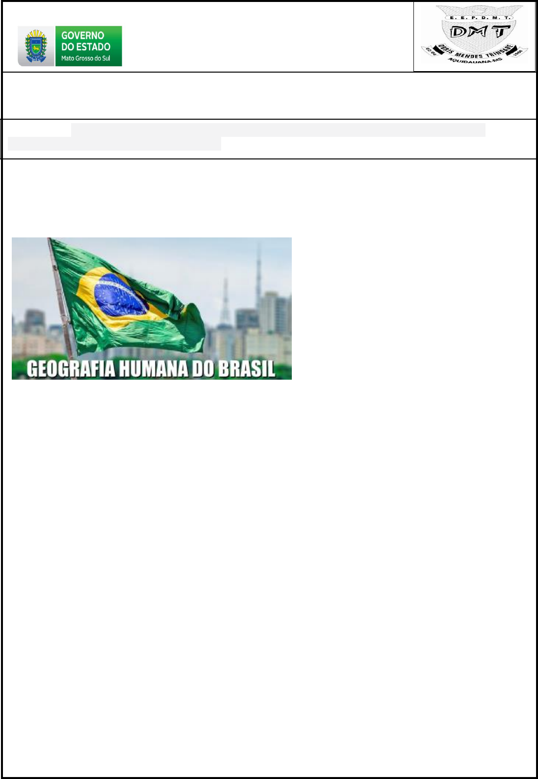 Geografia Humana do Brasil A Geografia Humana do Brasil volta-se para os diversos elementos que compõem o espaço geográfico brasileiro: da cultura à economia, entre outros temas. A Geografia Humana do Brasil estuda as relações socioespaciais do território nacional Os estudos de Geografia Humana do Brasil preocupam-se em analisar os elementos demográficos, econômicos, urbanos, rurais, culturais, políticos e sociais do espaço geográfico brasileiro. Dessa forma, tantos os elementos que estão intrinsecamente ligados à constituição do território nacional quanto os aspectos de inter-relação entre o Brasil e o mundo são analisados. Em seus aspectos humanos, o Brasil possui uma ampla diversidade, que se manifesta em elementos como a disposição étnica, os níveis produtivos, as variações culturais e religiosas, entre outros inúmeros aspectos. Portanto, conhecer mais sobre o espaço brasileiro é ampliar o conhecimento sobre essa variedade de inter-relações que constroem a identidade e a visão geral do país. Economicamente, o Brasil apresenta uma estrutura sólida, com o sétimo maior PIB do mundo, mas que precisa avançar em relação ao combate à desigualdade de renda e à miséria e à pobreza, muito embora o país tenha apresentado melhorias nesse campo ao longo das últimas décadas. Apesar do forte peso da produção agrícola, o espaço brasileiro é bastante industrializado, com uma concentração do setor secundário na região Sudeste, embora haja um processo de desconcentração industrial em curso. A demografia do Brasil apresenta um elevado quantitativo populacional, o suficiente para ultrapassar a marca de 200 milhões de habitantes. Por outro lado, a densidade demográfica é baixa e a população é má distribuída pelo território. Enquanto a região Sudeste apresenta a maior parte da população, a região Norte comporta verdadeiros “vazios demográficos”. A rede de transporte brasileira é basicamente construída em torno das rodovias, que atendem a mais de 60% do transporte de cargas no país e são seguidas pelas ferrovias e hidrovias, muito embora os dois últimos tipos citados sejam mais recomendados em um país como o Brasil, com elevada extensão territorial e com grande quantidade de rios navegáveis. A produção agrícola nacional, ao longo da história, sempre esteve pautada nas grandes monoculturas: inicialmente predominou a cana-de-açúcar, principal produto da economia canavieira colonial; no século XIX a produção de café conheceu o seu auge; ao longo do século XX foi a vez da soja e, atualmente, há um crescimento da cana-de-açúcar ao lado da própria soja. Apesar disso, a produção agropecuária brasileira é considerada de elevada diversificação em seu período atual. Na presente seção de Geografia Humana do Brasil, você poderá aprofundar os seus estudos sobre o espaço geográfico brasileiro, conhecendo melhor os seus elementos econômicos, culturais, estruturais, sociais e demográficos. Esperamos auxiliar nos estudos sobre os diversos elementos que configuram a diversidade do território nacional. Boa leitura! Por Rodolfo Alves Pena Graduado em Geografia GOVERNO DO ESTADO DE MATO GROSSO DO SUL SECRETARIA DE ESTADO DE EDUCAÇÃO ESCOLA ESTADUAL PROFª DÓRIS MENDES TRINDADE PROFESSOR: JORGE BELTRÃO TENORIO APC DE GEOGRAFIA 3º BIMESTRE mês de julho 1º ANO C ALUNO(a)______________________________________________ HABILIDADE: Dominar o conceito de espaço geográfico brasileiro, suas diferentes formas de delimitação e regionalização no país e no Mato Grosso do Sul. EXERCÍCIOS SOBRE GEOGRAFIA HUMANA DO BRASIL EXERCÍCIOS DE GEOGRAFIA Para resolver estes exercícios sobre Geografia Humana do Brasil, é preciso compreender os processos econômicos, urbanos, agrários e sociais do país. Publicado por: Rodolfo F. Alves Pena 01) desenvolvimento econômico agrário brasileiro perpassou pela ampla instalação de diversas monoculturas ao longo do território. A predominância de um produto ou outro variou ao longo da história em função das diferentes conjunturas internacionais, haja vista que esse tipo de produção sempre foi voltado para a exportação. Entre as diferentes culturas que predominaram no meio agrário e na economia brasileira ao longo da história, não se inclui: A( ) a cana-de-açúcar B( ) o café C( ) a soja D( ) o trigo 02) “A industrialização de uma sociedade (…) sempre produz alterações profundas no espaço geográfico, tornando-o mais urbanizado e integrado, além de aprofundar a divisão do trabalho entre o campo e a cidade. A industrialização do Brasil – isto é, a mudança de uma sociedade rural e agrária para uma urbana e industrial – começou no final do século XIX, tendo se intensificado a partir dos anos 1930”. (VESENTINI, J. W. Geografia: o mundo em transição. São Paulo: Editora Ática, 2012. p.553) Sobre a industrialização do Brasil, podemos afirmar que A( ) foi um processo tardio, ou seja, realizado centenas de anos após o desenvolvimento dos países onde ocorreu a I Revolução Industrial. B( ) houve uma passagem gradativa do artesanato para a manufatura até a mecanização da produção. C( ) é considerada, atualmente, homogênea e atinge todo o território nacional. D( ) foi responsável pela concentração de investimentos, transformando-se no principal setor gerador de empregos atualmente.