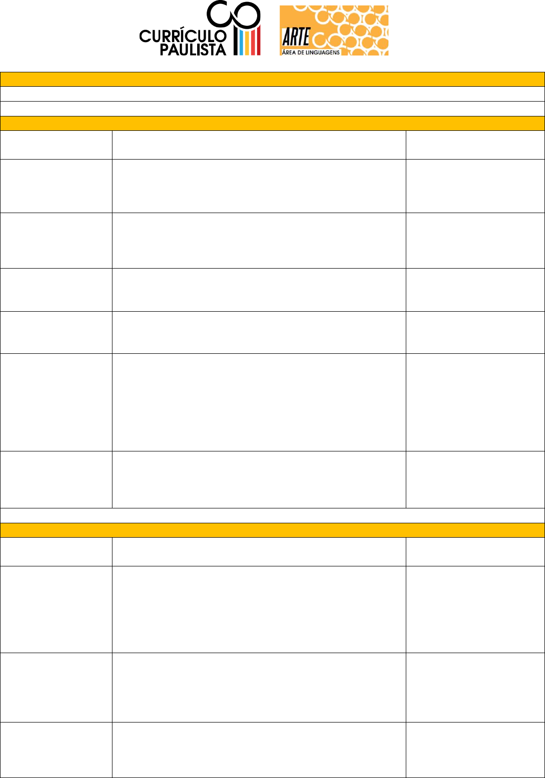 ARTE 1º ANO - ENSINO FUNDAMENTAL 1º BIMESTRE LINGUAGENS HABILIDADES OBJETOS DE CONHECIMENTO Música (EF01AR13) Experimentar, identificar e apreciar músicas brasileiras próprias do universo infantil, inclusive aquelas presentes em seu cotidiano. Contextos e Práticas Música (EF01AR17) Apreciar e experimentar sonorização de histórias, utilizando vozes, sons corporais e/ou instrumentos musicais convencionais ou não convencionais. Processos de criação Habilidade Articuladora (EF15AR23) Reconhecer e experimentar, em projetos temáticos, as relações processuais entre diversas linguagens artísticas. Processos de criação Habilidade Articuladora (EF15AR24) Caracterizar e experimentar brinquedos, brincadeiras, jogos, danças, canções e histórias de diferentes matrizes estéticas e culturais. Matrizes estéticas e culturais Habilidade Articuladora (EF15AR25) Conhecer e valorizar o patrimônio cultural, material e imaterial, de culturas diversas, em especial a brasileira, incluindo-se suas matrizes indígenas, africanas e europeias, de diferentes épocas, favorecendo a construção de vocabulário e repertório relativos às diferentes linguagens artísticas. Patrimônio cultural Habilidade Articuladora (EF15AR26) Explorar diferentes tecnologias e recursos digitais (multimeios, animações, jogos eletrônicos, gravações em áudio e vídeo, fotografia, softwares etc.) nos processos de criação artística. Arte e tecnologia 2º BIMESTRE LINGUAGENS HABILIDADES OBJETOS DE CONHECIMENTO Dança (EF01AR08) Experimentar, identificar e apreciar formas distintas de manifestações da dança presentes em seu cotidiano (rodas cantadas, brincadeiras rítmicas e expressivas), cultivando a percepção, o imaginário, a capacidade de simbolizar e o repertório corporal. Contextos e práticas Dança (EF01AR10) Experimentar diferentes formas de orientação no espaço (deslocamentos, planos, direções, caminhos etc.) e ritmos de movimento (lento, moderado e rápido) na construção do movimento dançado. Elementos da linguagem Dança (EF01AR12) Dialogar, com respeito e sem preconceito, sobre as experiências pessoais e coletivas em dança vivenciadas na escola, como fonte para a construção de vocabulários e repertórios Processos de criação próprios. Habilidade Articuladora (EF15AR23) Reconhecer e experimentar, em projetos temáticos, as relações processuais entre diversas linguagens artísticas. Processos de criação Habilidade Articuladora (EF15AR24) Caracterizar e experimentar brinquedos, brincadeiras, jogos, danças, canções e histórias de diferentes matrizes estéticas e culturais. Matrizes estéticas e culturais Habilidade Articuladora (EF15AR25) Conhecer e valorizar o patrimônio cultural, material e imaterial, de culturas diversas, em especial a brasileira, incluindo-se suas matrizes indígenas, africanas e europeias, de diferentes épocas, favorecendo a construção de vocabulário e repertório relativos às diferentes linguagens artísticas. Patrimônio cultural Habilidade Articuladora (EF15AR26) Explorar diferentes tecnologias e recursos digitais (multimeios, animações, jogos eletrônicos, gravações em áudio e vídeo, fotografia, softwares etc.) nos processos de criação artística. Arte e tecnologia 3º BIMESTRE LINGUAGENS HABILIDADES OBJETOS DE CONHECIMENTO Teatro (EF01AR18) Reconhecer e apreciar histórias dramatizadas e outras formas de manifestação teatral presentes em seu cotidiano (inclusive as veiculadas em diferentes mídias, como TV e internet, e em espaços públicos), cultivando a percepção, o imaginário, a capacidade de simbolizar e o repertório ficcional. Contextos e práticas Teatro (EF01AR21) Exercitar a improvisação e o faz de conta, ressignificando objetos e fatos e experimentando-se no lugar do outro. Processos de criação Habilidade Articuladora (EF15AR23) Reconhecer e experimentar, em projetos temáticos, as relações processuais entre diversas linguagens artísticas. Processos de criação Habilidade Articuladora (EF15AR24) Caracterizar e experimentar brinquedos, brincadeiras, jogos, danças, canções e histórias de diferentes matrizes estéticas e culturais. Matrizes estéticas e culturais Habilidade Articuladora (EF15AR25) Conhecer e valorizar o patrimônio cultural, material e imaterial, de culturas diversas, em especial a brasileira, incluindo-se suas matrizes indígenas, africanas e europeias, de diferentes épocas, favorecendo a construção de vocabulário e repertório relativos às diferentes linguagens artísticas. Patrimônio cultural Habilidade Articuladora (EF15AR26) Explorar diferentes tecnologias e recursos digitais (multimeios, animações, jogos eletrônicos, gravações em áudio e vídeo, fotografia, softwares etc.) nos processos de criação artística. Arte e tecnologia 4º BIMESTRE LINGUAGENS HABILIDADES OBJETOS DE CONHECIMENTO Artes visuais (EF01AR01) Identificar e apreciar desenho, pintura, modelagem e colagem como modalidades das artes visuais, cultivando a percepção, o imaginário, a capacidade de simbolizar e o repertório imagético. Contextos e práticas Artes visuais (EF01AR04) Experimentar desenho, pintura, modelagem e colagem por meio de técnicas convencionais e não convencionais, fazendo uso sustentável de materiais e instrumentos. Materialidades Habilidade Articuladora (EF15AR23) Reconhecer e experimentar, em projetos temáticos, as relações processuais entre diversas linguagens artísticas. Processos de criação Habilidade Articuladora (EF15AR24) Caracterizar e experimentar brinquedos, brincadeiras, jogos, danças, canções e histórias de diferentes matrizes estéticas e culturais. Matrizes estéticas e culturais Habilidade Articuladora (EF15AR25) Conhecer e valorizar o patrimônio cultural, material e imaterial, de culturas diversas, em especial a brasileira, incluindo-se suas matrizes indígenas, africanas e europeias, de diferentes épocas, favorecendo a construção de vocabulário e 