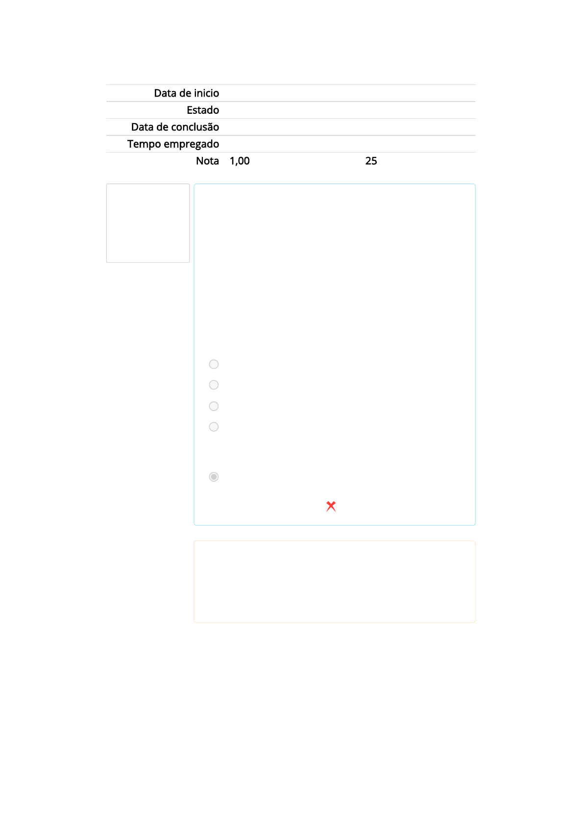 Questão 1 Incorreto Atingiu 0,00 de 1,00 Gestão de Riscos em Projetos ► AVALIAÇÃO ► ATIVIDADE DO ESTUDO DE CASO Data de inicio segunda, 26 Jul 2021, 18:47 Estado Finalizada Data de conclusão segunda, 26 Jul 2021, 19:50 Tempo empregado 1 hora 2 minutos Nota 1,00 de um máximo de 4,00(25%) As boas práticas de gestão de riscos dizem, dentre outras coisas, que um projeto deve ter seus riscos identi�cados e analisados no intuito de aumentar as chances de ocorrerem as oportunidades e diminuir signi�cativamente a probabilidade de ocorrência das ameaças que rondam o projeto. De acordo com o que você leu e compreendeu no estudo de caso, os gerentes de projetos na gestão de riscos deveriam investir mais seu tempo: Escolha uma: a. Implantando medidas provisórias. b. Desenvolvendo planos de backup. c. Elaborando planos secundários. d. Gerenciando o registro de riscos e comunicando-se com os principais stakeholders. e. Desenvolvendo junto aos proprietários dos riscos os planos de contingência como respostas aos riscos. Sua resposta está incorreta. A resposta correta é: Gerenciando o registro de riscos e comunicando-se com os principais stakeholders.. https://moodle.universoead.com.br/course/view.php?id=43 https://moodle.universoead.com.br/mod/quiz/view.php?id=2543 https://moodle.universoead.com.br/mod/resource/view.php?id=2884 Questão 2 Incorreto Atingiu 0,00 de 1,00 Após ter ocorrido o primeiro incidente (evento incerto, no caso uma ameaça), o time de riscos poderia ter avaliado o novo cenário e identi�cado outras ameaças que poderiam comprometer a continuidade da atividade. Caso o time tivesse identi�cado o risco e desenvolvido um plano para mitigar somente a probabilidade e não os possíveis efeitos, isso seria de alguma maneira aceitável? Escolha uma: a. Não, pois os níveis de impacto precisam também ser contemplados durante as análises dos eventos incertos, a menos que a estratégia de eliminar ou reduzir riscos com apenas uma ação de resposta aos riscos não for possível de ser utilizada. b. Sim, pois mitigar a probabilidade na maioria das vezes representa uma redução signi�cativa de custos no projeto. c. Absolutamente não. Tanto as probabilidades quanto os impactos dos eventos incertos precisam ser reduzidos a qualquer custo. d. Absolutamente sim. Mitigar a probabilidade é o tipo de análise e desenvolvimento de plano de resposta mais signi�cativo dentre os processos de gestão de riscos em projetos. e. Sim. As estratégias de respostas aos riscos podem comprometer a probabilidade, o impacto ou até ambos. Sua resposta está incorreta. A resposta correta é: Não, pois os níveis de impacto precisam também ser contemplados durante as análises dos eventos incertos, a menos que a estratégia de eliminar ou reduzir riscos com apenas uma ação de resposta aos riscos não for possível de ser utilizada.. Questão 3 Correto Atingiu 1,00 de 1,00 Riscos são eventos incertos que podem ou não acontecer e que, caso aconteçam, podem gerar impactos positivos ou negativos ao projeto. Baseando-se nesta a�rmação e na leitura do estudo de caso, qual seria a melhor maneira de um gerente de projetos reportar formalmente e chamar a atenção dos stakeholders sobre um evento incerto com impactos possivelmente desastrosos? Escolha uma: a. Utilizar como meio de comunicação o documento de registro de riscos. b. Documentá-lo durante o processo de obtenção das lições aprendidas. c. Fazer o orçamento dos riscos do projeto. d. Contemplá-lo no relatório mensal de status do projeto. e. Delegar esta função para o proprietário do risco. Sua resposta está correta. A resposta correta é: Utilizar como meio de comunicação o documento de registro de riscos.. https://moodle.universoead.com.br/mod/resource/view.php?id=2884 Questão 4 Incorreto Atingiu 0,00 de 1,00 Baseando-se no estudo de caso relatado, por que você consideraria que os planos de respostas aos riscos devem sempre ser elaborados e avaliados em grupo? Escolha uma: a. Para garantir que todos os membros do time de projetos possam ser designados como proprietários dos riscos. b. Para garantir que todos os especialistas sejam envolvidos no processo. c. Para que seja principalmente um processo apreciado pela alta administração da companhia patrocinadora do projeto. d. Para garantir a igualdade dentre todos os departamentos envolvidos com os riscos que os afetam. e. Por ser um processo criativo que acaba por ser mais produtivo quando realizado em sessões de brainstorming pelo grupo de riscos. Sua resposta está incorreta. A resposta correta é: Por ser um processo criativo que acaba por ser mais produtivo quando realizado em sessões de brainstorming pelo grupo de riscos. . https://moodle.universoead.com.br/mod/resource/view.php?id=2884