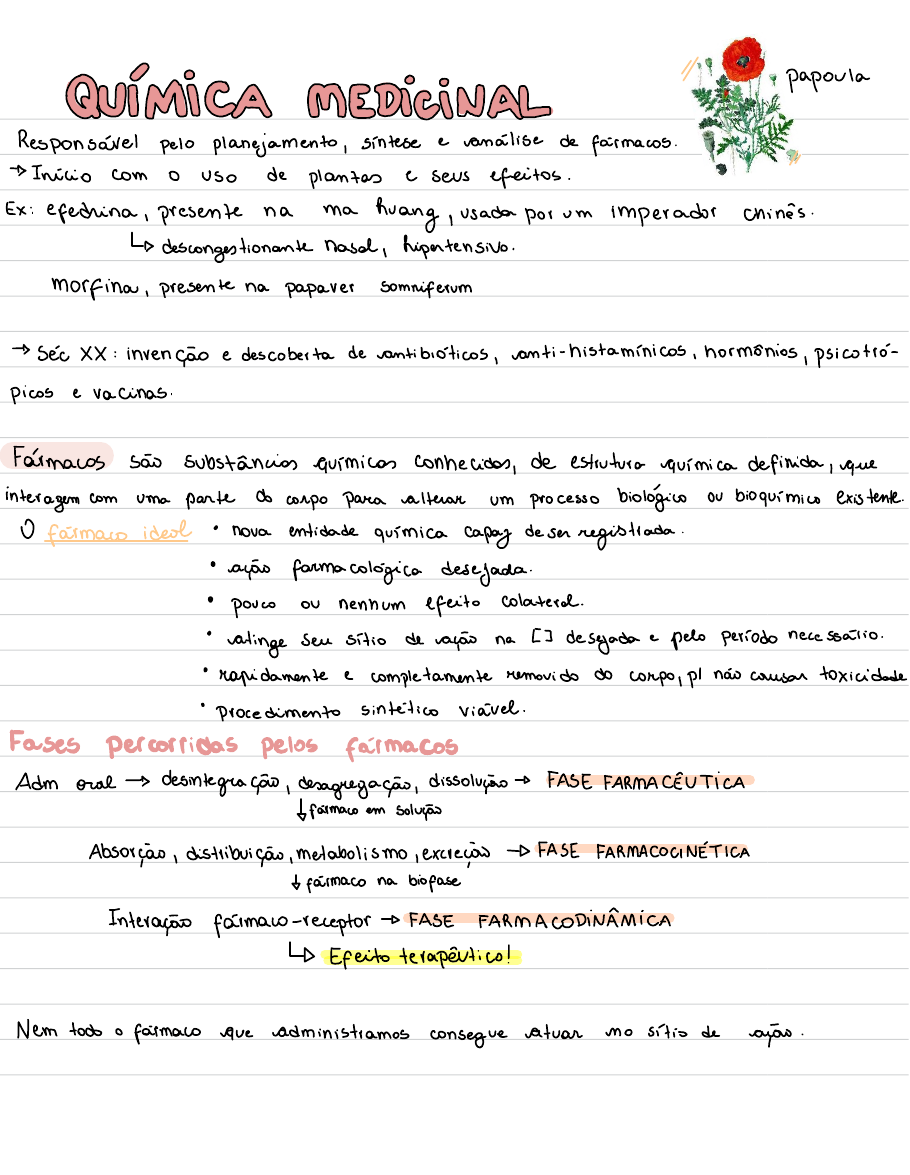 ④RETÉMUÂEAI AREJEI@infame Papaia Responsável pelo planejamento , síntese e análise de fármacos . ✗ → Início com o uso de plantas e seus efeitos . Ex : efedrina , presente na Ma huang , usada por um imperador chinês . A descongestionante nasal , hipertensivo . Morfina , presente na papaver somniferum → Séc XX : invenção e descoberta de antibióticos , anti - histamínicos , hormônios ,psicotrópicase vacinas . Fármacos são substâncias químicos conhecidas , de estrutura química definida , que interagem com uma parte do corpo para alterar um processo biológico ou bioquímico existente. O fármaco ideal • nova entidade química capaz de ser registrada . • ação farmacológica desejada . • pouco ou nenhum efeito colateral . • atinge seu sítio de ação na [ ] desejada e pelo período necessário . • rapidamente e completamente removido do corpo , pl não causar toxicidade • Procedimento sintético viável . Fases percorridas pelos fármacos Adm oral → desintegração , desagregação , dissolução FASE FARMACÊUTICA fármaco em solução Absorção , distribuição , metabolismo , excreção FASE FARMACOCINÉTICA fármaco na biofase Interação fármaco -receptor FASE FARMACODINÂMICA Efeito terapêutico ! Nem todo o fármaco que administramos consegue atuar no sítio de apoio . Sítio de ação Moléculas - alvo Localização no corpo onde o fármaco Proteínas , complexos de proteínas , vai . nucleicos desenvolve sua função que exercem papel importante no processopatológico. I lig . Simples I flexibilidade da moléculaFármacos estruturalmente inespecíficos ↳pode interferir naabsorção A ação deles não depende da interação da estruturaquímica com o alvo . O efeito biológico depende de suas propriedades físico - químicas . Ex : Halotano Br Isoflurano Br Fzc o / CHE Fz C CI São anestésicos gerais , agem pela sua lipofilicidade depressão inespecífica de biomembranas , eleva a interação inespecífica com sítios hidrofóbico de proteínas do SNC Fármacos estruturalmente específicos O efeito biológico é pela interação seletiva com uma determinada biomanomoléue - la- alvo . Precisa de grupos funcionais que interajam com o alvo molecular. COMPLEXIDADE MOLECULAR Desenvolvimento de fármacos Estado de menor enn . O planejamento de um fármaco depende de um em - gia tendimento Cuidadoso dos aspectos químicos e da mudam a conformação interação com numerosas moléculas que ele encontra entre o fármaco e o alvo , para ter um me -no corpo . lhor encaixe entre os dois . o Planejamento não - racional : screen ing randômico , a partir de fontes naturais i compostos sintéticos . Não tem um alvo ou atividade específica . ' Planejamento racional : conhecimento sobre a estrutura celular eproteína e sobre mecanismos fisiológicos . Etapas do planejamento racional os dois são Identificação e validação identificar a moléa líder planejamentos do alvo molecular Atividade bioló complementares ! fica adequada Estudos in vitro e in vivo otimização de moléculas líder Estudos clínicos Aprovação muitos erros ! É um processo longo ( 12-15 anos ) e cara. A escolha de uma doença depende das prioridades para a Indústria forem . Algumas perguntas : A doença é disseminada ? Quais países afetados ? Já existem medicamentos no mercado? Vantagens e desvantagens . Estratégias p / identificação de compostos líder • Screen ing de compostos naturais e sintéticos . Já seleciona a potencia . • Modificações planejadas a partir de princípios ativos conhecidos ( fármacos " me too "! . • Otimização seletiva de efeitos adversos . • Estudo do metabolismo dos fármacos . • " fragment - based discovery " . Parâmetros para selecionar compostos líder Regras de Verba Área de superfície polar E 140 Ã (absorção intestinal) Área de superfície polar F 70 À ( barreira hematoencefálica ) Ligações rotacionáveis < 10 Regras dos 5 de Lipinski→ A interação com alvo molecular deve ser adequada pl promover vativ . • Peso molecular <500 - deve permitir modificações sinto- • 5 Grupos doadores de ligação de H . ticas PI melhorar suas propriedades • 10 Grupos receptores de ligação de H . • clog P < 5 2 exemplos benzocaína Anestésicos locais cocaína procaína composto líder lidocaína prototipo Antimaláricas → Artemisinina ele próprio já tem atividade e é um fármaco composto líder Otimização do composto líder Fase farmacodinâmica : etapa de reconhecimento molecular (melhorarpotênciae seletividade . Fase farmacocinética : disponibilidade e tempo de meia vida . Há várias estratégias para essa otimização (ex : Iatenciação , Bioisosterismo , etc) . Desenvolvimento de fármacos Pré- clínico Fase clínica •processo de síntese • Fase O : pequena triagem , doses subtevapêuti - • formulação cas ( 10 a 15 indivíduos saudáveis) . • toxicidade • Fase / : segurança , tolerabi /idade , propriedades formaiscinéticas e efeitos farmacológicos ( in- Depois da fase clínica : divíduos ) . Aprovação e comercialização • Fase II : efetividade , efeitos colaterais e ou - • Submissão pl agências regu - tios aspectos de segurança , determinaregulatórias me terapêutico ( indivíduos saudáveis ) . • Fase N : fármacovigilância . • Fase III : triagem menor , estabelece aeficácia , monitora os efeitos adversos , comparaçãocom fármacos similares que já estão no mercado .