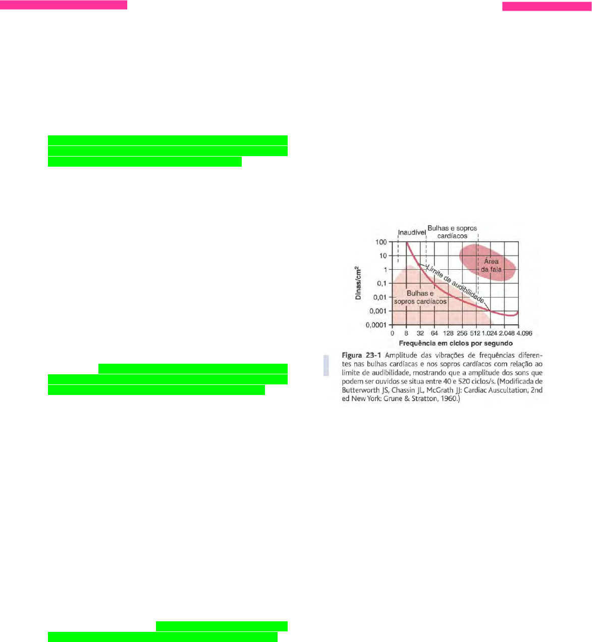 Valvas e Bulhas Cardíacas Vanessa Silva – Fisiologia – P3 – MED UFAL 1 Normalmente, não ocorre som audível quando as valvas se abrem. Bulhas Cardíacas Bulhas Cardíacas Normais Ao auscultar com estetoscópio o coração normal, ouve-se som descrito em geral como "lub, dub, lub, dub': O "lub" está associado ao fechamento das valvas atrioventriculares (A-V), no início da sístole, e o "dub" está associado ao fechamento das valvas semilunares (aórtica e pulmonar), no final da sístole. O som "lub" é referido como primeira bulha cardíaca, e o "dub" é referido como segunda bulha cardíaca porque se considera que o ciclo normal de bombeamento do coração comece quando as valvas A-V se fecham, no início da sístole ventricular. Causas da Primeira e Segunda Bulhas Cardíacas A primeira explicação sobre as causas das bulhas cardiacas foi a de que o "encontro" dos folhetos valvares produz vibrações. Todavia, demonstrou-se que isso causa pouco ou nenhum som, pois o sangue entre os folhetos amortece o efeito desse choque e impede a produção significativa de som. Em vez disso, a causa desses sons é a vibração das valvas retesadas imediatamente após o fechamento, junto com a vibração das paredes adjacentes do coração e dos grandes vasos em torno do coração. Isto é, na geração da primeira bulha cardíaca, a contração dos ventrículos causa de início o súbito refluxo do sangue contra as valvas A-V (as valvas tricúspide e mitral), fazendo com que elas se fechem e se curvem para os átrios até que as cordas tendíneas interrompam de modo abrupto essa protrusão retrógrada. O retesamento elástico das cordas tendíneas e das valvas faz com que o sangue refluído seja lançado novamente para o interior de cada respectivo ventrículo. Isso faz com que o sangue e as paredes ventriculares, bem como as valvas retesadas, vibrem provocando turbulência vibratória no sangue. As vibrações se propagam pelos tecidos adjacentes até a parede torácica, onde elas podem ser ouvidas como som por meio do estetoscópio. A segunda bulha resulta do fechamento súbito das valvas semilunares ao final da sístole. Quando as valvas semilunares se fecham, elas se curvam para trás, em direção aos ventrículos, e seu estiramento elástico repuxa o sangue para as artérias, causando curto período de reverberação do sangue para a frente e para trás entre as paredes das artérias e das valvas semilunares, assim como também entre estas valvas e as paredes ventriculares. As vibrações ocorrem nas paredes das artérias e então são transmitidas principalmente ao longo das artérias. Quando as vibrações dos vasos ou dos ventrículos entram em contato com uma "placa ressonante~ como a parede torácica, produzem sons que podem ser auscultados. Duração e Altura da Primeira e da Segunda Bulhas Cardíacas A duração de cada uma das bulhas cardíacas é pouco maior que 0,10 segundo- a primeira bulha, de cerca de 0,14 segundo, e a segunda, de cerca de 0,11 segundo. A razão da segunda bulha ser mais breve é que as valvas semilunares estão mais retesadas que as valvas A-V, de modo que vibram por período de tempo mais curto que as valvas A-V A frequência audível (altura) das primeira e segunda bulhas cardíacas, como mostrado na Figura 23-1, começa na menor frequência que o ouvido pode detectar, cerca de 40 ciclos/se atinge cerca de 500 ciclos/s. Quando aparelhos eletrônicos especiais são utilizados para registrar esses sons, sem dúvida alguma a maior proporção desses registros está em frequências e níveis sonoros abaixo do limiar audível, descendo até 3 a 4 ciclos/ s e atingindo picos de aproximadamente 20 ciclos/s, como ilustrado pela área sombreada inferior na Figura 23-1. Por essa razão, grandes porções das bulhas cardíacas podem ser registradas eletronicamente nos fonocardiogramas mesmo que não possam ser auscultadas. A segunda bulha cardíaca tem normalmente frequência maior que a primeira por duas razões: (1) o retesamento das valvas semilunares, em comparação com o retesamento muito menor das valvas A-V, e (2) o maior coeficiente elástico das paredes arteriais retesadas que constituem as principais câmaras vibratórias para a segunda bulha, em comparação com as câmaras ventriculares menos elásticas e mais frouxas que formam o sistema vibratório para a primeira bulha cardíaca. O clínico utiliza essas diferenças para distinguir as características especiais das duas bulhas respectivas. Terceira Bulha Cardíaca Ocasionalmente, uma terceira bulha cardíaca ressonante e fraca é ouvida no início do terço médio da diástole. Explicação lógica, porém não comprovada, desse som é a oscilação do sangue para a frente e para trás entre as paredes dos ventrículos, iniciada pelo influxo de sangue dos átrios. Isso é análogo à água saindo da torneira para um saco de papel; a água entra reverberando para a frente e para trás entre as paredes do saco, causando sua vibração. Acredita-se que a razão da terceira bulha não ocorrer até o terço médio da diástole seja o fato de que, na parte inicial da diástole, os ventrículos não estão cheios o bastante para criar a pequena quantidade de tensão elástica necessária à reverberação. A frequência desse som é em geral tão baixa que não se pode ouvi-lo; contudo, ele pode muitas vezes ser registrado no fonocardiograma. Bulha Cardíaca Atrial (Quarta Bulha Cardíaca) Uma bulha cardíaca atrial pode algumas vezes ser registrada no fonocardiograma, porém ela quase nunca pode ser auscultada devido às suas amplitudes e frequências muito baixas- em geral, 20 ciclos/sou menos. Esse som ocorre quando os átrios se contraem, e presumivelmente é causado pelo influxo de sangue nos ventrículos que desencadeiam vibrações similares às da terceira bulha cardíaca. Áreas da Superfície Torácica para Ausculta das Bulhas Cardíacas Normais O ato de escutar os sons do corpo, em geral por m