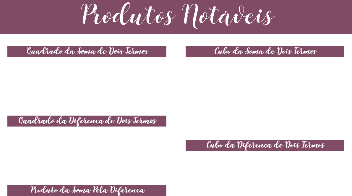 Quadrado do primeiro termo, mais duas vezes o primeiro termo pelo segundo termo, mais o quadrado do segundo termo. (a + b) ∙ (a + b) = a2 + ab + ba + b2 (a + b)2 = a2 + 2ab + b2 Quadrado do primeiro termo, menos duas vezes o primeiro termo pelo segundo termo, menos o quadrado do segundo termo. (a - b) ∙ (a - b) = a2 - ab - ba + b2 (a - b)2 = a2 - 2ab + b2 Quadrado do primeiro termo menos o quadrado do segundo termo. (a + b) ∙ (a − b) = a2 − ab + ba + b2 = a2 − b2 Cubo do primeiro, mais três vezes o quadrado do primeiro, vezes o segundo, mais três vezes o primeiro, vezes o quadrado do segundo, mais o cubo do segundo. (a + b)3 = (a + b) (a + b)2 = (a + b) (a2 + 2ab + b2) (a + b)3 = a3 + 2a2b + ab2 + ba2 + 2ab2 + b3 (a + b)3 = a3 + 3a2b + 3ab2 + b3 Cubo do primeiro, menos três vezes o quadrado do primeiro, vezes o segundo, mais três vezes o primeiro, vezes o quadrado do segundo, menos o cubo do segundo. (a - b)3 = (a - b) (a - b)2 = (a - b) (a2 - 2ab + b2) (a - b)3 = a3 - 2a2b + ab2 - ba2 + 2ab2 - b3 (a - b)3 = a3 - 3a2b + 3ab2 - b3
