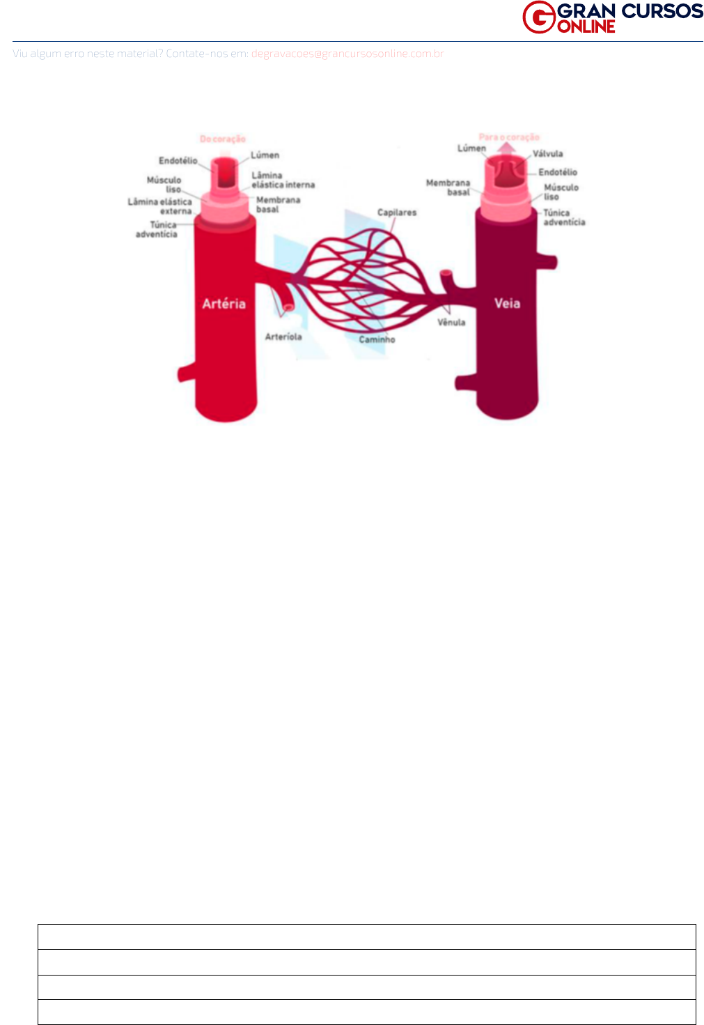 1 www.grancursosonline.com.br Viu algum erro neste material? Contate-nos em: degravacoes@grancursosonline.com.br A N O TA ÇÕ ES Sistema Vascular ANATOMIA E FISIOLOGIA HUMANA SISTEMA VASCULAR O sistema vascular interage com o sistema imunológico. A camada externa da artéria é a túnica adventícia. Essas artérias são bem grossas e têm um poder de contração desse mús- culo liso. As arteríolas são os vasos de maior resistência. Há uma pressão alta na artéria e a arteríola precisa aumentar a resistência muscular periférica para diminuir a pressão arterial nesse local porque no capilar, que é para onde a arteríola se encaminha, a “caminhada” deve ser lenta, com o sangue sem pressão alta porque nos capilares ocorrem as trocas gasosas, é necessá- rio levar nutrientes para os tecidos porque o objetivo é de que a célula execute a respiração celular aeróbica, utilizando a glicose degradada com o oxigênio para transformar em energia, gerar ATP. Na mesma linha de baixa pressão, o sangue dos capilares é drenado, segue para a vênu- las, é drenado para seios e conduzido para as veias. As veias possuem uma estrutura diferenciada em relação às artérias. Primeiramente porque a função delas é trazer sangue para o coração com baixa pressão e possuem uma válvula interna para permitir o fluxo sanguíneo unidirecional. O endotélio é a camada interna que reveste a veia, o músculo liso e a túnica adventícia. 2 www.grancursosonline.com.br Viu algum erro neste material? Contate-nos em: degravacoes@grancursosonline.com.br A N O TA ÇÕ ES Sistema Vascular ANATOMIA E FISIOLOGIA HUMANA • Vasos Sanguíneos: são tubos que formam a complexa rede do sistema cardiovascu- lar, constituída por artérias e veias que se ramificam em calibres cada vez menores, originando as arteríolas, vênulas e capilares. • Artérias: vasos sanguíneos que saem do coração levando sangue para o corpo. A exceção é a artéria pulmonar. • Veias: vasos sanguíneos que chegam ao coração trazendo sangue do corpo. 5m 3 www.grancursosonline.com.br Viu algum erro neste material? Contate-nos em: degravacoes@grancursosonline.com.br A N O TA ÇÕ ES Sistema Vascular ANATOMIA E FISIOLOGIA HUMANA DIRETO DO CONCURSO 1. (UEPB/2012) Qual das seguintes afirmações sobre os vasos sanguíneos é verdadeira? a. O pulso é a expansão e a retração elástica de uma veia após a contração e relaxamento do ventrículo direito. b. As paredes arteriais são geralmente mais espessas do que as paredes das veias. c. As veias transportam sangue a partir do coração. d. O sangue flui mais rapidamente através das veias. e. A pressão sanguínea nas artérias é sempre menor do que nas veias. 10m 4 www.grancursosonline.com.br Viu algum erro neste material? Contate-nos em: degravacoes@grancursosonline.com.br A N O TA ÇÕ ES Sistema Vascular ANATOMIA E FISIOLOGIA HUMANA COMENTÁRIO a) O pulso é a expansão e a retração elástica de uma artéria após a contração e relaxamento do ventrículo esquerdo. c) As veias transportam sangue para o coração. A partir do coração quem transporta o sangue são as artérias. d) O sangue flui mais rapidamente através das artérias. e) A pressão sanguínea nas artérias é sempre maior do que nas veias. 2. (FCC/2013) A força elástica exercida pelas paredes arteriais sobre seu conteúdo sanguí- neo é a definição de a. a pressão arterial. b. a pressão atrial direita. c. o débito cardíaco. d. a pressão hidrostática. COMENTÁRIO c) O débito cardíaco é o resultado da FC multiplicado pelo VSE. d) A pressão hidrostática é trabalhada em equilíbrio com a pressão coloidosmótica dentro dos vasos e também com as pressões exercidas pelo interstício sobre os vasos para que ocorra a manutenção da circulação. 3. (AOCP/2015) Preencha as lacunas e assinale a alternativa correta. A pressão arterial (PA) é a resultante da força exercida pelo ________ nas paredes das ________, do volume de sangue _________, da força de contração do coração e da________ na parede dos vasos. a. coração / artérias / circulante / força b. sangue / artérias / circulante / resistência c. fluido / varicoses / resistência / força d. sangue / varicoses / circulante / repetição e. coração / veias / circulante / repetição 5 www.grancursosonline.com.br Viu algum erro neste material? Contate-nos em: degravacoes@grancursosonline.com.br A N O TA ÇÕ ES Sistema Vascular ANATOMIA E FISIOLOGIA HUMANA COMENTÁRIO A pressão arterial (PA) é a resultante da força exercida pelo coração nas paredes das artérias, do volume de sangue circulante, da força de contração do coração e da resistência na parede dos vasos. A Pressão Arterial (PA) é igual ao Débito Cardíaco (DC) multiplicado pela Resistência Vascular Periférica (RVP). 4. (CESPE/SESA-ES/2013) Acerca da composição dos grandes vasos sanguíneos do corpo humano, assinale a opção correta. a. As veias são vasos sanguíneos responsáveis pelo transporte do sangue do coração aos demais tecidos do organismo. b. Artérias são vasos sanguíneos calibrosos de paredes espessas responsáveis pelo re- torno do sangue ao coração. c. Arteríolas são artérias de grande calibre que distribuem sangue aos capilares. d. Vênulas são veias de tamanho microscópico responsáveis pela coleta de sangue dos capilares para drenar para as artérias. e. Os capilares são vasos microscópicos, localizados entre as vênulas, onde ocorrem as trocas entre o sangue e as células dos tecidos. COMENTÁRIO a) As artérias são vasos sanguíneos responsáveis pelo transporte do sangue do coração aos demais tecidos do organismo. b) Veias são vasos sanguíneos calibrosos de paredes espessas responsáveis pelo retorno do sangue ao coração. c) Arteríolas são a divisão das artérias, de calibre menor do que as artérias e que distribuem sangue aos capilares fazendo o sistema de resistência vascular, diminuindo a pr