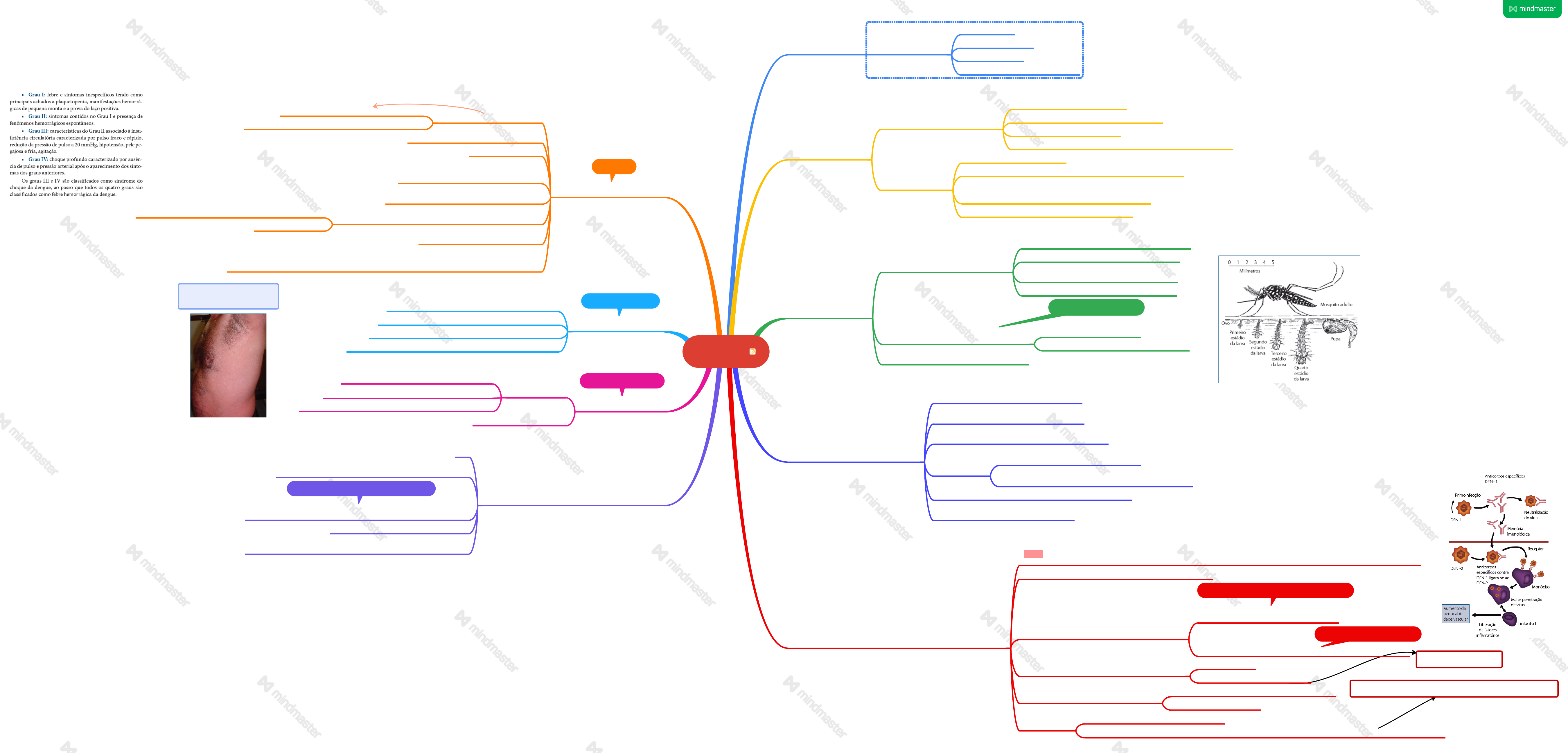 fica a 200m de sua oviposição facilitam a penetração em marófagos por receptores Fcg alto nível de HLA Ie II também facilita bloqueio da maturação de megacariocítica na medula Após incubação de 2-8 dias começa de forma abrupta abrupta tbm Dengue 1.introdução 2.estrutura viral 4.patogenia e resposta imune proteína E e NS1 o vírus é fagocitado pelas células de Langherhans, vão para os linfonodos, replicam e se disseminam. durante uma infecção por dengue o indivíduo fica imune temporariamente por outros tipos de virus A E é alvo principal doas anticorpos que vão fazer lise de cel. infectadas ou inibir a ligação. vírus esférico, envelopado, 1 fita de RNA entra por endocitose por receptores desconhecidos nos polissomos traduz em uma poliproteina que tem todas as proteínas virais a dengue possui 4 sorortipos, arbovirose 3.epidemiologia Transmissão por Aedes aegypti e albopictus temperatura e umidade são condições adequadas picam indivíduos virêmicos, o vírus multiplica no TGI do mosquito que transmite por toda a vida 10 genes, cada um forma uma proteína tradução no retículo endoplasmático o primeiro é cosmopolita, o segundo é rural e semisslvestre Aedes spp. podem transmitir por forma transovariana NS1 é expressa na superfície de cel. infectadas. Anticorpos contra a proteína fazem lise de células infectadas fixando o complemento. Vírus da família flaviridae picada da fêmea Aedes gênero flavivirus proteína E- estrutural latência de 12-16 hr localiza-se nas espículas do envelope, possui os mais importantes domínios antigênicos, que são reconhecidos por anticorpos os domínios são indutores de imunidade contra o flavivirus é a hemaglutinina viral e medeia a fusão do envelope à membrana do hosp. 5.fisiopatologia da dengue hemorrágica (DHF|DSS) sequência de infecção por dengue é um fator de risco para DHF, 100x do que em primoinfecção os macrófagos lisadodos por CD8 liberam tromboplastina inicia coagulação proteases ativadoras so complemento grupos de risco os mesmos sorotipos podem desenvolver todas as formas da doença TNF-a afeta células inflamatórias e endoteliais, podendo contribuir para a trombocitopenia Os ovos ficam viáveis até um ano e depois do contato com a água iniciam o ciclo. 12-15 dias os ovos podem viajar distâncias. é a maior, glicosilada, tem cisteína anticorpos de antes não neutralizam o segundo vírus diferente e aumentama infecção primeiros anos de idade com infecção secundária crianças<1 ano infec. primária, com mães possuidoras de anticorpos 6.Patologia Alterações principalmente em DHF hemorragias cutâneas, em TGI, no septo IV, espaços subaracnóide, hepatomegalia muitos megacariócitos em capilares pulmonares, glomérulos renais, sinusoides hepáticos e esplênicos, sinal de coagulação intravasc. nos rins, glomerulonefrite por imunocomplexos no fígado, necrose das cel. de kuppfer, presença de cel. monpnucleares com citoplasma acidófilo e vacuolizado, lembrando febre amarela Não há evidências de dengue no BR pelo albopictus alimentam de sangue pra suprir o gasto da oviposição 7.Quadro Clínico 8.Dengue Clássica 2. febre da dengue febre indiferenciada e manifestações clássicas 1. infecções assintomáticas febre hemorrágica e síndrome de choque da dengue febre de 39-40°C, cefaleia intensa, dor retro-ocular, artralgias, mialgias, manifestações gastrointestinais IgM 4 dias após sintomas e IgG após 1 semana, começa baixo e vai aumentando, dá imunidade para aquele sorotipo. TCD4 e CD8 produzem =muito IFN-G, TNF-a para lise de células infectadas febre e mal-estar são por níveis altos de citocinas, já as mialgias são por replicação viral no tecido. O IFN-g aumenta o número de Fcg facilitando a entrada do vírus nos macrófagos lise celular e choque induz IL-8, que libera histamina pelos basófilos, vasodillatação IL-6 relacionada com hipertermia infecção por outro sorotipo + anticorpos subneutralizantes desequilíbrio, facilitando entrada do vírus em macrófagos causa: aumento da carga viral por uma cepa virulenta ou facilitação por anticorpos, levando a resposta imune exacerbada permeabilidade vascular queda de PA manifestações hemorrágicas com trombocitopenia manifestações menos usuais, hepatite, acometimento cardíaco e de SNC exantema no 3° ou 4° dia, pequenas áreas de pele saudável, prurido fenômenos hemorrágicos discretos (epistaxe, petéquias, gengivorragias) leucopenia com linfocitopenia, plaquetas normal, em alguns cass leve diminuição "ilhas brancas em mar vermelho" 9.Dengue hemorrágica quadros hemorrágicos no 2º ou 3º dia petéquias na face, véu palatino, axilas e extremidades febre alta, náuseas, vômitos, mialgias e artralgias. fazer teste de torniquete, positivo quantdo tiver 20 ou mais petéquias fígado palpável e doloroso Púrpuras e grandes equimoses na pele, epistaxes, gengivorragias, metrorragias e hemorragias digestivas moderadas, hematêmese. pocurar sinais de alarme: dor abdomial, vômitos persistentes, acúmulo de fluidos, hepatomegalia sídrome de choque\DSS: 3-4 dia estado crítico por 12-24 h, dor abdominal, letárgicos, afebris, sinais de insuficiência circulatória sinais: pele fria e pegajosa, cianose perioral, pulso rápido, sudorese fria PA baixa ou imensurável sem tratamento o pct evolui para óbito e 4-6 h critérios laboratoriais: hematócrito deve estar elevado em 20% ou mais ou deve diminuir em 20% ou mais após a hidratação vigorosa, e a plaquetopenia deve estar em níveis abaixo de 100.000/mm3hemoconcentração acima de 45% dengue diagnóstico tratamento profilaxia Main Topic