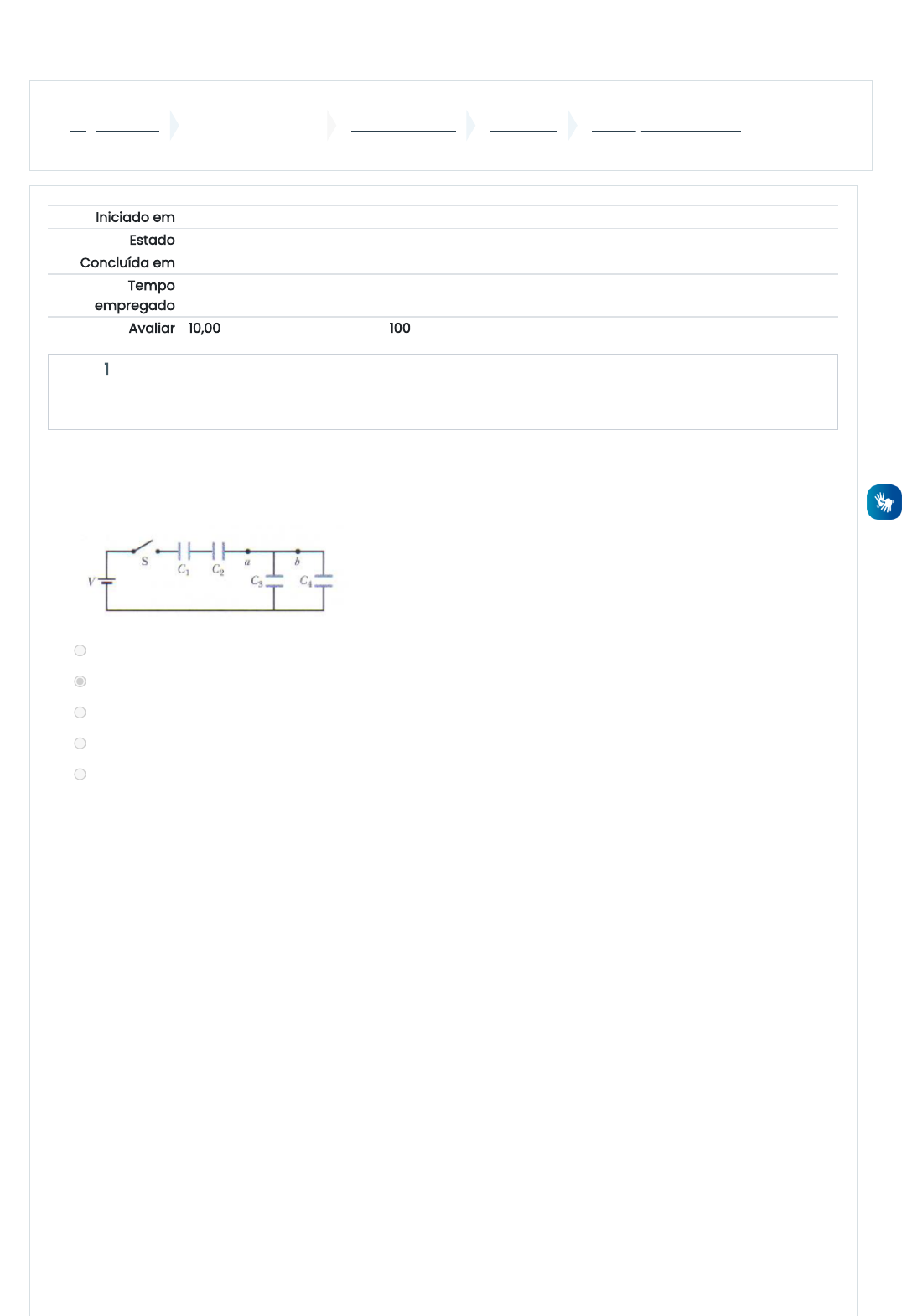 Página inicial Minhas disciplinas 2021/2 - Física II UNIDADE II Avaliação - Unidade II Iniciado em quarta, 28 jul 2021, 22:12 Estado Finalizada Concluída em quarta, 28 jul 2021, 22:24 Tempo empregado 11 minutos 3 segundos Avaliar 10,00 de um máximo de 10,00(100%) Questão 1 Completo Atingiu 1,00 de 1,00 (Adaptado de Halliday, 2009) Na figura a seguir, V = 9V, C2 = 3 µF, C4= 4 µF e todos os capacitores estão inicialmente descarregados. Quando a chave S é fechada, uma carga total de 12 µC passa pelo ponto A e uma carga total de 8 µC, passa pelo ponto B. O valor de C1 e C3 são, respectivamente: a. 2µF e 4µF. b. 4µF e 2µF. c. n.d.a. d. 2F e 2F. e. 2F e 4F. A resposta correta é: 4µF e 2µF. https://ambienteonline.uninga.br/ https://ambienteonline.uninga.br/course/view.php?id=7145 https://ambienteonline.uninga.br/course/view.php?id=7145§ion=5 https://ambienteonline.uninga.br/mod/quiz/view.php?id=111686 Questão 2 Completo Atingiu 1,00 de 1,00 Questão 3 Completo Atingiu 1,00 de 1,00 (Mundo Educação, 2018) Analise as afirmações a seguir, referentes a um circuito contendo três resistores de resistências diferentes, associados em paralelo e submetidos a uma certa diferença de potencial, verificando se são verdadeiras (V) ou falsas (F). I - A resistência do resistor equivalente é menor do que a menor das resistências dos resistores do conjunto. II - A corrente elétrica é menor no resistor de maior resistência. III - A potência elétrica dissipada é maior no resistor de maior resistência. A sequência correta é: a. n.d.a. b. V, V, F. c. F, F, V. d. V, F, F. e. F, V, F. A resposta correta é: V, V, F. (Mundo Educação, 2018) Dispõe-se de três resistores de resistência 400 ohms cada um. Para se obter uma resistência de 600 ohms, utilizando-se os três resistores, como devemos associá-los? a. Dois em série, ligados em paralelo com o terceiro. b. Os três em paralelo. c. Os três em série. d. n.d.a. e. Dois em paralelo, ligados em série com o terceiro. A resposta correta é: Dois em paralelo, ligados em série com o terceiro. Questão 4 Completo Atingiu 1,00 de 1,00 Questão 5 Completo Atingiu 1,00 de 1,00 (PUC-RIO, 2009) No circuito apresentado na Figura, onde V = 12 V, R1 = 5 Ω, R2 = 2 Ω, R3 = 2 Ω, podemos dizer que a corrente medida pelo amperímetro A colocado no circuito é: Figura - Referente ao exercício. Fonte: Infoescola (2018). a. 1 A. b. 5 A. c. 3 A. d. 4 A. e. 2 A. A resposta correta é: 2 A. Ao aplicarmos uma diferença de potencial de 9,0 V em um resistor de 3,0 Ω, podemos dizer que a corrente elétrica fluindo pelo resistor será: a. 2,0 A. b. 4,0 A. c. 5,0 A. d. 1,0 A. e. 3,0 A. A resposta correta é: 3,0 A. Questão 6 Completo Atingiu 1,00 de 1,00 Questão 7 Completo Atingiu 1,00 de 1,00 Questão 8 Completo Atingiu 1,00 de 1,00 Considere um condutor de eletricidade por onde passam 12,0 C a cada sessenta segundos. Nesse condutor, a intensidade da corrente elétrica, em ampères, será igual a: a. 120. b. 7,20. c. 0,08. d. 5,00. e. 0,20. A resposta correta é: 0,20. O fusível de um circuito elétrico é um fio projetado para fundir, abrindo o circuito, se a corrente ultrapassar um certo valor. Suponha que o material a ser usado em um fusível funda quando a densidade de corrente ultrapassa 0,440 A/m . Que diâmetro do fio cilíndrico deve ser usado para fazer um fusível que limite a corrente em 0,3A? a. 465 mm. b. 434 mm. c. 930 mm. d. 220 mm. e. 440 mm. 2 A resposta correta é: 930 mm. Pela secção reta de um fio, passam 5,0.10 elétrons a cada 2,0s. Sabendo-se que a carga elétrica elementar vale 1,6 .10 C, pode-se afirmar que a corrente elétrica que percorre o fio tem intensidade: a. 320 mA. b. 400 mA. c. 160 mA. d. 800 mA. e. 500 mA. 18 -19 A resposta correta é: 400 mA. Questão 9 Completo Atingiu 1,00 de 1,00 Questão 10 Completo Atingiu 1,00 de 1,00 Um capacitor é constituído por duas placas quadradas com 2 mm de lado. Sabendo que a distância entre as placas é de 2 cm e que a permissividade do meio corresponde a 80 μF/m, determine a capacitância do capacitor. a. 6,6. 10 F. b. 1,6. 10 F. c. 1,6. 10 F. d. 1,0. 10 F. e. 4,6. 10 F. –5 –6 -8 –9 –9 A resposta correta é: 1,6. 10 F.-8 Um feixe de partículas contém 6 x 10 íons positivos por centímetro cúbico, todos se movendo para o norte com uma velocidade de 2 x 10 m/s. O módulo e direção da densidade de corrente será: a. 1,2 x 10 A/m . b. 8 x 10 A/m . c. 19,2 A/m . d. N.d.a e. 3 x 10 A/m . 8 5 14 2 8 2 2 3 2 A resposta correta é: 19,2 A/m .2 Atividade anterior ◄ Slides Videoaula 2 Seguir para... Próxima atividade Videoaula 1 ► Manter contato UNINGÁ https://www.uninga.br Mobile : 0800 800 5009 https://ambienteonline.uninga.br/mod/resource/view.php?id=111685&forceview=1 https://ambienteonline.uninga.br/mod/page/view.php?id=111687&forceview=1 https://www.uninga.br/ tel:Mobile : 0800 800 5009 https://www.facebook.com/uninga.edu.br/ https://www.youtube.com/channel/UCFfrZpSpL4DflIFl78P2TSQ https://www.instagram.com/uningaoficial/?hl=pt https://api.whatsapp.com/send?phone=44%2099825-1515