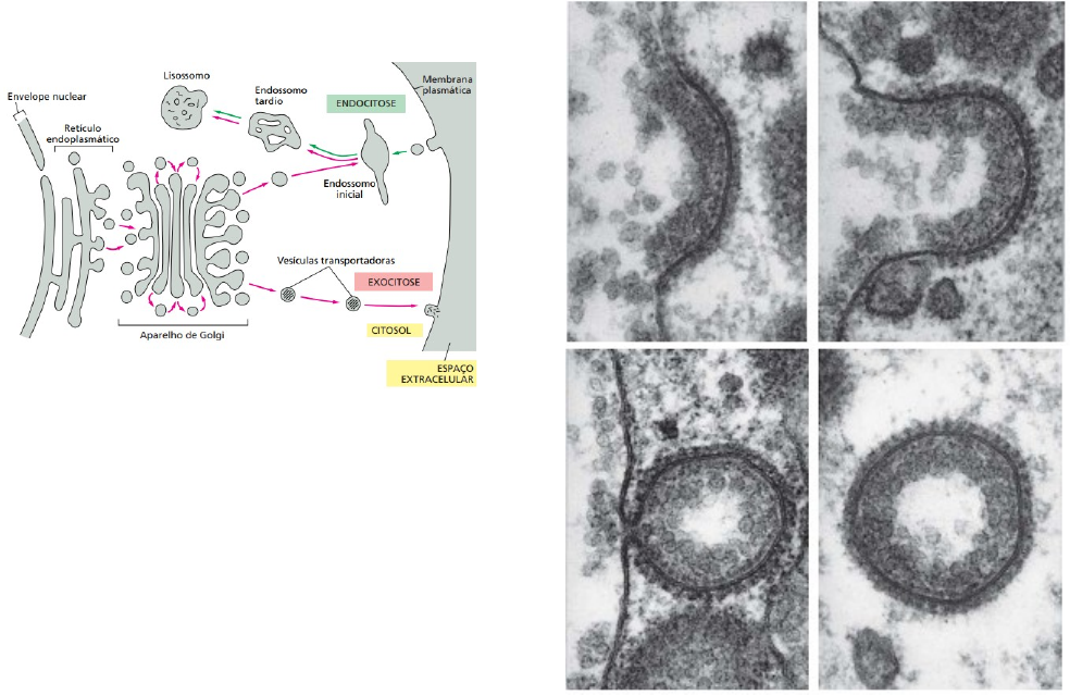 Transporte vesicular → Fornece rotas de comunicação entre o meio intra e o extracelular. Uma via secretória principal inicia com a síntese de proteínas na membrana do RE, indo em seguida para o lúmen, depois para o Golgi até a superfície celular. Uma rota paralela leva o transporte para a via endocítica que ingere e degrada moléculas extracelulares por meio dos endossomos aos lisossomos. → Cada vesícula deve levar somente proteínas apropriadas para a membrana-alvo dela. Vesículas revestidas: possuem uma camada de revestimento proteico na sua superfície citosólica. Depois de brotar da organela de origem, essas vesículas perdem o revestimento pra poderem se fundir diretamente a membrana-alvo. → Serve para ajudar a moldar o broto e capturar moléculas pra seguir no transporte. As vesículas revestidas por clatrina brotam do Golgi (via secretória) e da membrana plasmática (via endocítica). • Na membrana plasmática, as moléculas de clatrina se ligam, formando uma rede de forma esférica na superfície citosólica da membrana. Isso faz com que a vesícula tome forma. • Uma proteína chamada dinamina, se ligam as proteínas que estavam no pescoço da invaginação e provoca contrações. A vesícula se rompe da membrana. Como a carga da vesícula transportadora é selecionada? As moléculas a serem transportadas possuem sinais de transporte específicos, que são reconhecidos pelos receptores de carga no Golgi ou na MP. Uma segunda classe de proteínas chamadas adaptinas ajudam a capturar essas moléculas, além de fixar bem a capa de clatrina. → As adaptinas do Golgi e da MP são diferentes, e isso influi no tipo de molécula que vai ser transportada a partir de cada um deles. As vesículas revestidas por COP estão envolvidas no transporte de moléculas do RE pro Golgi e de uma parte do Golgi para outra. Depois que a vesícula se desprende, ela é transportada ativamente ao longo das fibras do citoesqueleto. Quando ela encontra o alvo, precisa ser reconhecida por marcas moleculares que identificam origem, conteúdo da vesícula, e se encaixam nos receptores da membrana-alvo pra, só assim, se fundirem. As proteínas Rab estão presentes na superfície da cada vesícula e são reconhecidas por proteínas de conexão na membrana-alvo. → Cada organela e cada tipo de vesícula transportadora tem uma combinação específica de proteínas Rab e proteínas de conexão, o que serve como aqueles marcadores moleculares. As Rab fazem com que a vesícula só consiga se fundir com a membrana certa. As v-SNAREs, proteínas transmembranas, da vesícula se unem com as t-SNAREs da membrana-alvo, ancorando a vesícula no seu lugar certo. → Essas mesmas proteínas catalisam a fusão das membranas, para que a vesícula libere sua carga. Para que a fusão aconteça: • Primeiro, toda a água é removida da parte hidrofílica das membranas. Isso é energeticamente desfavorável, mas evita que elas se fundam de maneira aleatória. • Depois, as v-SNAREs e as t- SNAREs se enrolam uma na outra, fazendo uma espécie de manivela que aproxima as duas membranas. • Quando as duas camadas estão a 1,5 nm uma da outra, os lipídeos começam a se misturar de maneira ordenada.