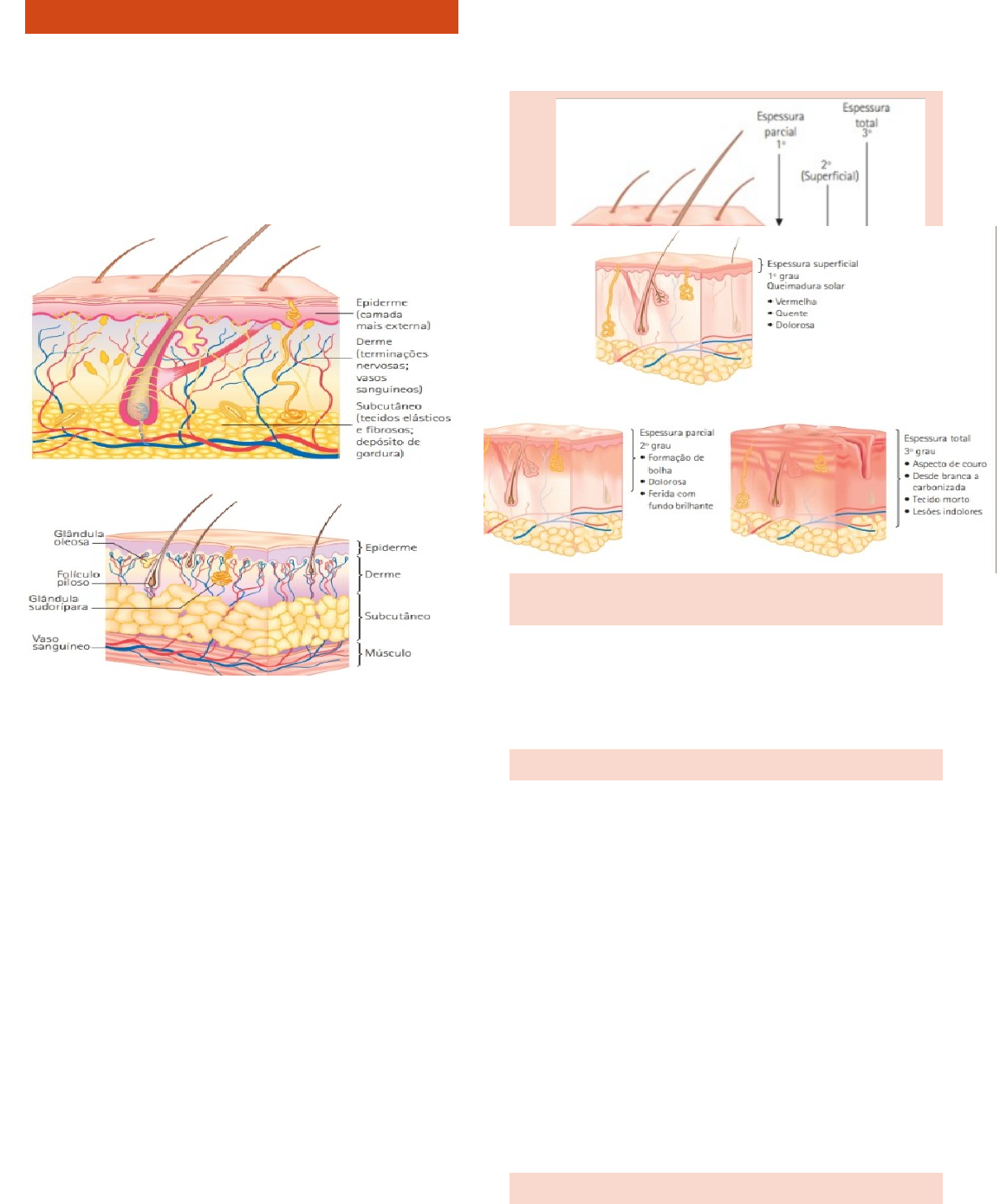 queimadura · A pele é constituída por epiderme e derme; · A epiderme é dividida em 4 camadas: Córnea, granulosa, espinhosa e basal; · A derme continua sendo maior, mas é dividida em duas camadas: Papilar e reticular; · Podemos classificar a queimadura de acordo com a profundidade da pele queimada: Primeiro grau · Constitui uma lesão na epiderme e apresenta hiperemia, aumento de temperatura e dor; · Ex: Queimadura do sol segundo grau · Na queimadura de 2o grau, podem ocorrer lesões mais superficiais (2o grau super-ficial), com lesão da derme papilar, e mais profundas (2o grau profundo), com lesão da derme reticular. · A característica da queimadura de 2o grau superficial é a presença de bolhas, hiperemia, dor intensa e aumento da temperatura; · Na queimadura de 2o grau profunda, há saída de secreção serosa pela ferida, o que lhe dá um aspecto brilhoso, além de ausência de bolhas, dor intensa (exposição das terminações nervosas) e cor amarelo-esbranquiçada. terceiro grau · Na queimadura de 3o grau, toda a espessura da pele é lesada, atingindo o tecido subcutâneo. · Nessa situação, encontram-se aspecto de pele necrótica (mumificada em toda espessura) ou ausência de pele, com exposição de gordura ou estruturas mais profundas (fáscia, músculos, ossos), ausência de dor, opacidade com ausência de brilho e sem saída de serosidade pela ferida e, algumas vezes, com visualização de vasos sanguíneos trombosados. fotos fisiopatologia · Quanto maior a temperatura, menor o tempo de exposição necessário para causar lesão (necrose); · O fluxo sanguíneo para essa área cessa imediatamente em virtude da trombose dos vasos, embora os tecidos ao seu redor continuem metabolicamente ativos por horas após a lesão (zona de estase). Essa estase pode durar até 3 a 4 semanas. · Normalmente, a profundidade de uma queimadura se define entre 48 e 72 horas. · Imediatamente após a lesão (entre 1 e 20 min e com pico de 12 horas), ocorre um processo inflamatório com aumento da permeabilidade capilar local, que pode durar de 2 a 3 semanas; · Essa reação inflamatória atinge todo o organismo quando a SCQ total for superior a 30%, em razão do excesso de fatores inflamatórios circulantes. · Com a perda da proteção e da função homeostática reguladora da pele, em queima-duras acima de 10 a 15% de SCQ, inicia-se a liberação de uma cascata de mediadores locais e do sistema nervoso central, o que causa alterações fisiológicas, como aumento da pressão capilar hidrostática, perda de líquidos e proteínas para o interstício, prejuízo da função cardíaca e supressão da resposta imune. · Ocorre hemólise imediata de células vermelhas (8%), diminuição de 30% do seu tempo de vida e aumento da viscosidade sanguínea e da adesividade plaquetária, diminuindo sua durabilidade. · Nos primeiros 4 dias, a perda da albumina é igual a 2 vezes o pool total plasmático do corpo. · Por causa da perda volêmica, dentro das primeiras 36 horas, há diminuição de 30% do débito cardíaco nos pacientes com queimaduras maiores ou iguais a 50% de SCQ. · Há aumento da ventilação máxima de 3 a 5 dias e aumento acentuado no consumo de O2 produção de CO2 e na produção de CO2; · Há aumento de enzimas hepáticas e do catabolismo por 2 a 3 dias após o trauma, bem como aumento dos glóbulos brancos com desvio à esquerda, decréscimo de imunoglobulinas, aumento da acidez gástrica e redução do muco protetor no estômago. diagnostico · Vítimas de queimaduras devem ser avaliadas quanto à cinemática do trauma para que se possa prever as possíveis lesões envolvidas no acidente. · Assim, se houver sinais de queimadura de face, deve-se logo entubar o doente, mesmo que não haja sinais evidentes de comprometimento das vias aérea; · A história do trauma é de fundamental importância para determinar o agente da queimadura, assim como os dados do paciente, incluindo idade e história AMPLA (pes-quisa sobre alergias, utilização de medicamentos, antecedentes mórbidos, uso de drogas, etilismo, pesquisa sobre gravidez, última refeição realizada e o ambiente em que ocorreu o acidente); · No caso de doentes transferidos ou trazidos de outros locais, é importante saber o tratamento e os exames já realizados. exAMES SUBSÍDIARIOS · Assim como todo politraumatizado, na sala de emergência, exames de sangue (hemo-grama, tipagem sanguínea, lactato, toxicológico para álcool ou drogas, teste de gravidez para mulheres entre 10 e 50 anos de idade) e radiografia de coluna cervical, tórax e bacia devem ser solicitados como complemento ao exame primário; · Quando uma vítima dá entrada nessa unidade, exames de sangue (hemo-grama completo, função renal, função hepática, eletrólitos, nível de proteínas, glicemia e hemoculturas), culturas das regiões de queimadura e das regiões nasofaríngea, axilar e perianal (swabs) e exames endoscópicos (endoscopia digestiva alta e broncoscopia) podem ser realizados de forma rotineira. · A radiografia de tórax tem papel importante para acompanhar a evolução tanto da lesão inalatória quanto das complicações das quei-maduras durante sua evolução; · Quando for realizado o primeiro desbridamento, o material deve ser encaminhado para exame anatomopatológico e de cultura para identificação da infecção. CLASSIFICAÇÃO · As queimaduras podem ser classificadas de acordo com a profundidade dos tecidos lesados. Para tanto, é preciso quantificar a superfície corpórea queimada (SCQ) de forma precisa. · As queimaduras podem ser classificadas de acordo com a sua extensão. Essa classifi-cação permite ao socorrista definir critérios de transferência de uma vítima para a UTQ. · Pequeno queimado é aquele com SCQ até 10% ou menos de 4% de SCQ enxer-tada (ou queimadura de 3o grau). Já o médio queimado tem entre 10 e 25% de SCQ ou 4 a 10% de SCQ enxertada (ou queimadura de 3o grau). Finalmente, o 
