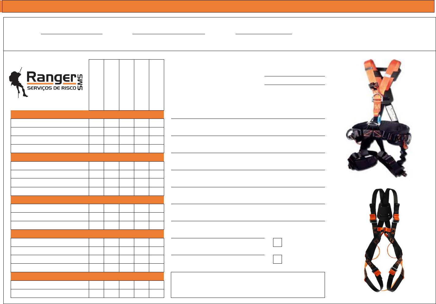 Inspeção do Cinto de Segurança Tipo Paraquedista Data início de uso: _____________________ Fabricante: Modelo: Série/Nº Data de fabricação _____________________ C o rt es /F u ro s Q u ei m ad u ra s D et er io ra çã o C o n ta m in aç ão Se m D an o s Nome do inspetor qualificado: Data inspeção: Observações: Fitas Fita do ombro Fita do peito e das costas Fita da cintura Fita das pernas Costuras Fita do ombro Fita do peito e das costas Fita da cintura Fita das pernas Aneis tipo “D’’ Anel tipo “D” das costas Anel tipo “D” da cintura Anel tipo “D” do peito Fivelas Ajustes das costas Aprovado Ajustes da frente Mosquetão do peito Rejeitado Fivelas das pernas Marcas das etiquetas Assinatura do inspetor Conforme ABNT/Imetro Etiqueta legível www.rangersms.com.br 81 3032-4140