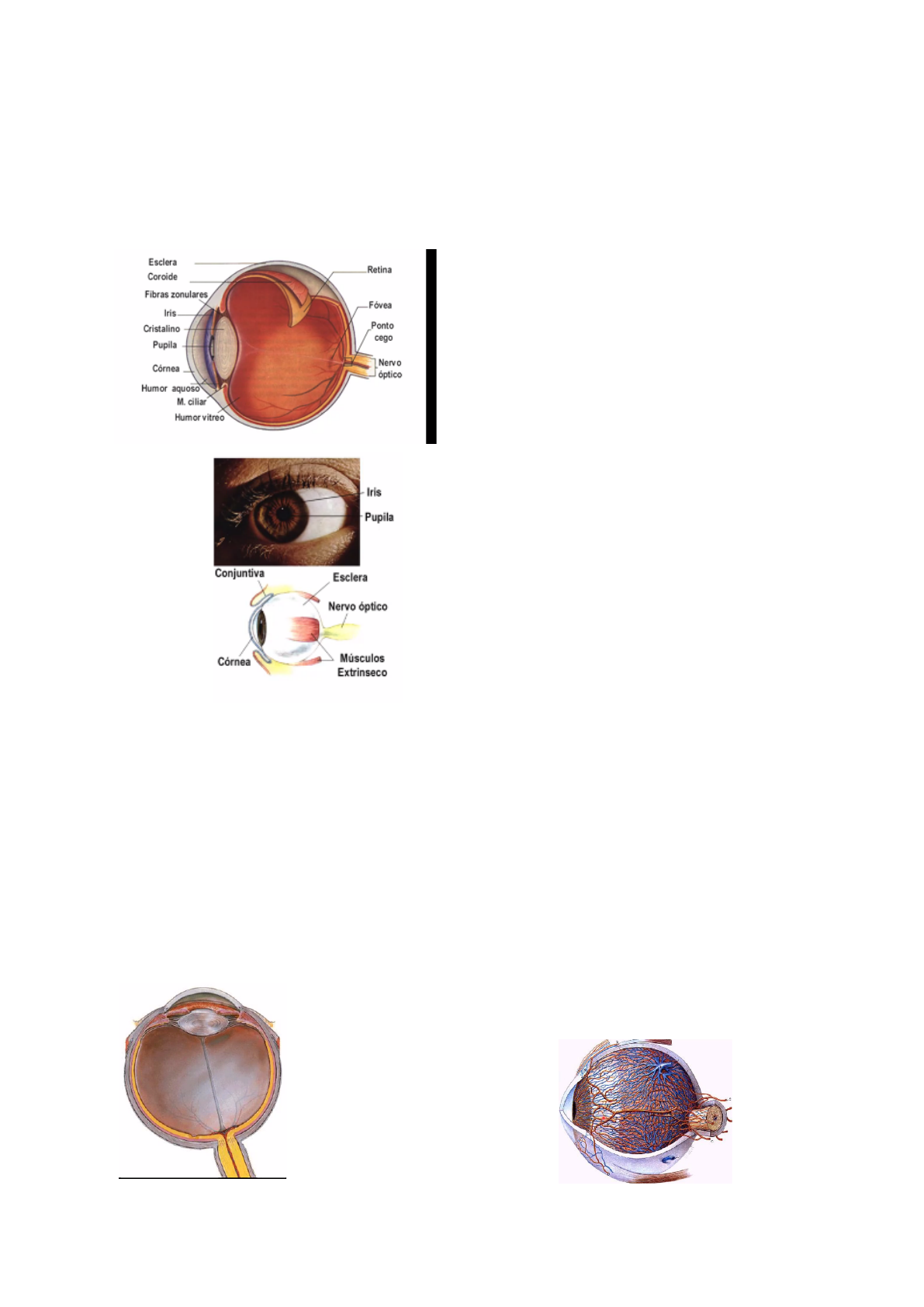 30/07 AN����I� D� O��� Anatomia geral do olho: Lentes - córnea (avascular) - cristalino Pupila - milose (músculo constritor da pupila) - midríase (músculo dilatador da pupila Músculo extrínseco do olho: movimentos oculares Retina: local de focalização da imagem e de transdução sensorial TÚNICAS -Externa-fibrosa: esclera, córnea, limbo esclero corneano Função: - forma - proteção - pressão intra ocular - inserção dos músculos extrínsecos -Média-vascular-úvea: cardióide, íris, corpo ciliar Função: - nutrição, vascularização - produção e drenagem do humor aquoso - acomodação - regula a entrada de luz -Interna-nervosa: retina Função - fototransdução - processamento neural MEIOS DIÓPTRICOS: córnea, humor aquoso, lente, corpo vítreo Função: - transparência - córnea CÂMARAS: anterior (córnea e íris), posterior (íris e cristalino), vítrea (postrema) Astigmatismo: deformação da calota da córnea Glaucoma: aumento da pressão intra ocular Ìris/ pupila/ mus Midríase: dilatação pupila causada pela contração do músculo radial da íris, durante a baixa luminosidade. Reflexo mediado pelo SNA simpático Miose: constrição pupilar causada pela contração do músc circular da íris diante do excesso de luminosidade. Reflexo fotomotor, mediado pelo SNA parassimpático. Circuitos neurais que controlam a miose e midríase: Corpo ciliar: produção, circulação e drenagem do humor aquoso; dividido em duas partes catarata: opaciamento do cristalino ACOMODAÇÃO VISUAL: É o mecanismo pelo qual o olho humano altera a vergência (curvatura) do cristalino, permitindo à pessoa normal enxergar nitidamente desde uma distância de aproximadamente 25 cm até o infinito. PONTO PRÓXIMO: é a posição mais próxima que pode ser vista nitidamente, realizando esforço máximo de acomodação. Na pessoa normal, situa-se, convencionalmente, a 25 cm. PONTO REMOTO: é a posição mais afastada que pode ser vista nitidamente, sem esforço de acomodação. Na pessoa normal esse ponto, este ponto está situado no infinito. Principais defeitos da visão: - miopia: achatamento do globo ocular, provocando um alongamento no eixo óptico. A imagem se forma antes da retina - hipermetropia: apresenta encurtamento do globo ocular. Dificuldade de enxergar objetos mais próximos. - presbiopia: endurecimento do cristalino, perda da capacidade de acomodação visual; Não é congênito mas decorrente da idade; “vista cansada” - astigmatismo: defeito da córnea, com raios de curvatura irregulares; ocasiona uma visão manchada dos objetos; a correção é feita com o uso de lente cilíndrica. - estrabismo: incapacidade de dirigir para um mesmo ponto os eixos ópticos dos olhos; a correção é obtida como o uso de lentes prismáticas - catarata: perda da transparência do cristalino; a correção é feita com a substituição do cristalino por uma lente artificial, através de cirurgia; geralmente em idosos Fóvea: local de maior acuidade visual RE���� Anatomia: - ora serrata - papila do nervo óptico - retina central e periférica - mácula lútea e fóvea - artéria e veia central da retina Vascularização: Fundo do olho: Retina, papila, mácula lútea, fóvea, artéria e veia central da retina *a mácula/fóvea é a referência Descolamento de retina Camadas da retina: (complexa) 1. epitélio pigmentado da retina 2. segmentos de cones e bastonetes 3. limitante externa 4. nuclear externa 5. plexiforme externa 6. nuclear intern 7. plexiforme interna 8. células ganglionares 9. fibras do nervo óptico 10. limitante interna Fotorreceptores humanos Na fóvea só temos cones Há mais cones do que bastonetes Os fotorreceptores convertem sinal luminoso em potencial receptor por meio de reações fotoquímicas. Há dois tipos de receptores. Bastonetes: púrpura (380 a 650nm) Tons de cinza Adaptados à baixa luminosidade (visão escotópica) Cones: Azul (419 nm) Verde (531 nm) Vermelho (559 nm) Visão em cores Adaptados a alta luminosidade (visão fotóptica) Elevada resolução espacial das imagens ÓR�I�� Ossos da cavidade orbitária: etmóide, frontal, esfenóide, lacrimal, zigomático, maxilar e palatino Bulbo ocular Gordura pele orbital para coxim (proteção) Pálpebra e conjuntiva Piscar -Secreção lacrimal: córnea úmida e asséptica -Fechamento da pálpebra: espalhamento da secreção lacrimal e proteção contra estímulo nocivos e luz interna -Músculo orbicular, nervo facial (VII) Aparelho Lacrimal Músculos extrínsecos do bulbo do olho