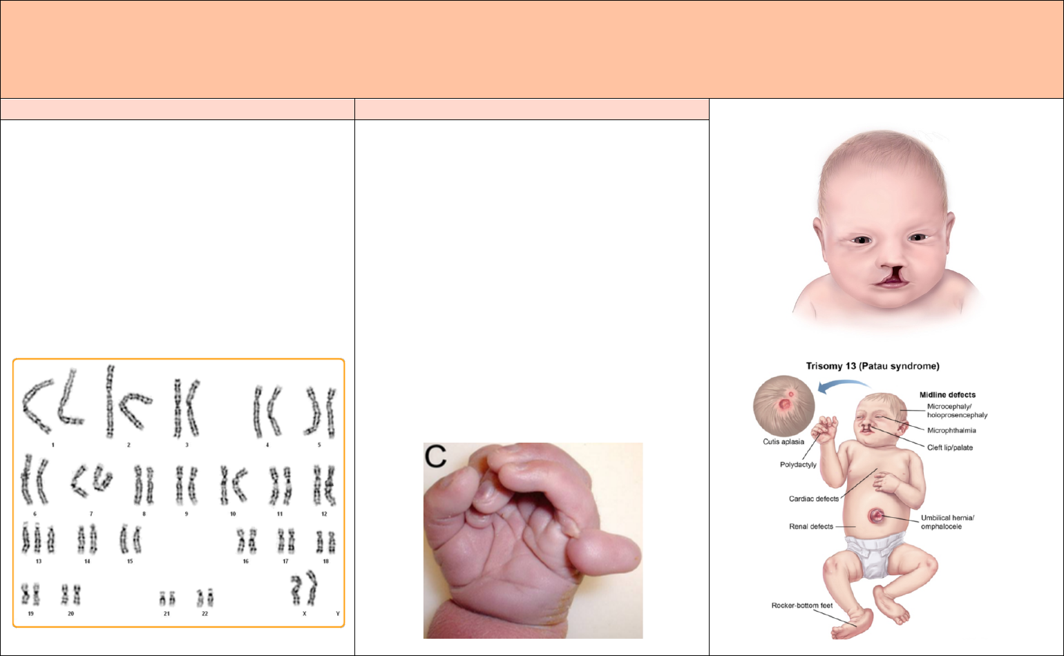 ISADORA FALCÃO – MEDICINA UFRN – TURMA 115 Síndrome de Patau ETIOLOGIA SINTOMAS A síndrome de Patau é uma doença genética classificada como uma cromossomopatia. Ela é causada pela presença de 3 cromossomos 13. Logo, indivíduos que possuem a síndrome, possuem o cariótipo do tipo 2n= 45 + 1. Podemos classificar também a Síndrome de Patau, portanto, como uma aneuploidia do tipo autossômica, além de também ser classificada como uma trissomia. Causada, principalmente, por uma não disjunção dos cromossomos maternos durante a meiose. è Polidactilia è Fissura palatina e lábio leporino è Ausência de sobrancelhas è Fronte oblíqua è Microcefalia è Olhos pequenos e extremamente afatsdados è Alterações da orelha è Mãos fechadas è Más formações renais è Cardiopatias è Retardo mental è Mal formações graves no SNC Alguns problemas podem ser corrigidos cirurgicamente, já outros não, o que pode comprometer a expectativa de vida desses indivíduos.